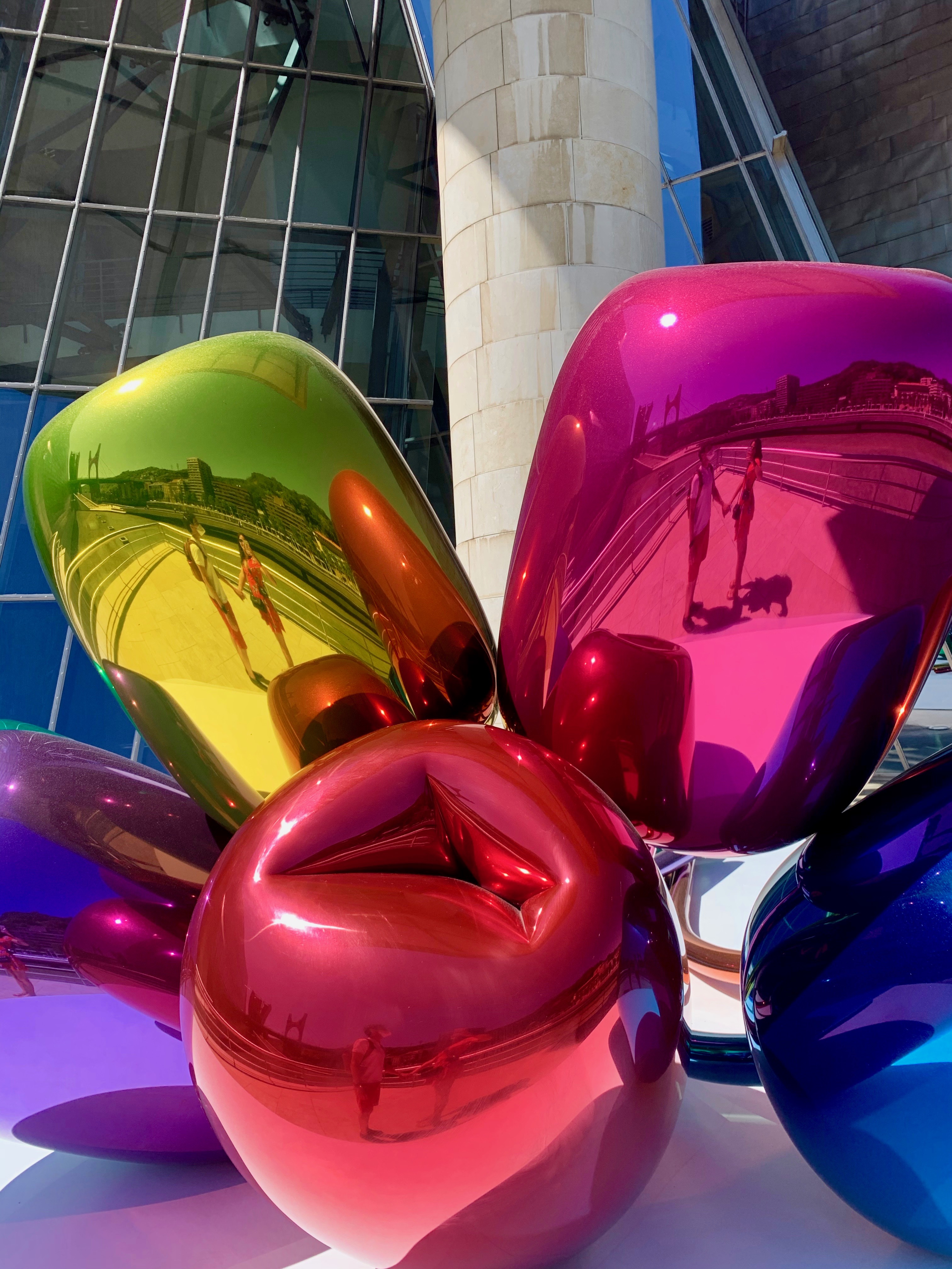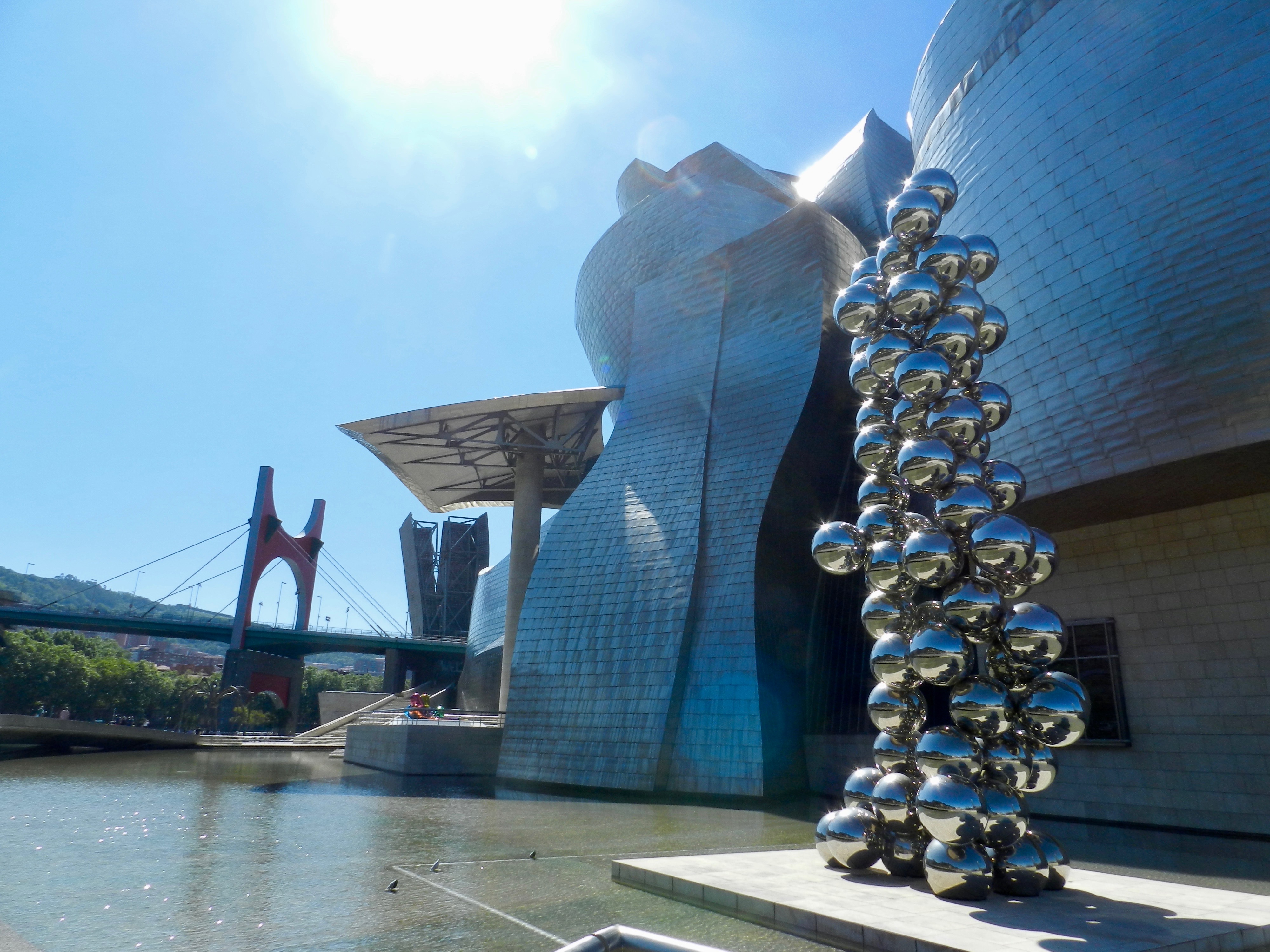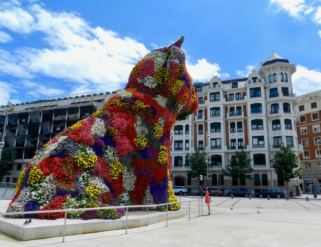 Nous avons donc marché vite (enfin moi c’était petite course à côté de Dam, avec ses grandes enjambées !!). Malgré cette course effrénée (lol), nous nous sommes fait la réflexion que la ville était vraiment jolie, d’autant plus que nous longions le quai avec de belles maisons, et une succession de ponts assez design. Nous sommes arrivés avec le quart d’heure habituel de retard au musée Guggenheim (peut-être même un peu plus puisque nous avons poussé notre retard en faisant des photos devant le chien !). On était même large puisqu’il n’y avait strictement personne, mais genre personne ! Cette période est quand même assez bizarre, masques obligatoires, pas la foule. Mais qui va s’en plaindre d’avoir un musée pour lui tout seul ?