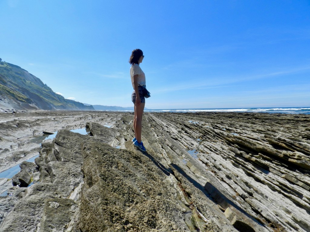 Nous sommes arrivés sur la plage et ses étendues de flysch. Émerveillement total. Franchement de toute beauté. C’était marée basse nous avions de la chance. Il y avait des algues vertes par moment, et même si en temps normal, elles gâchent le littoral, là je trouvais qu’avec les couleurs c’était sublime. Nous avons eu la bonne idée de faire la plage en marchant, sauf que ce n’était pas une plage, mais des énormes galets. Cette plage fût très longue, car on n’avance clairement pas du tout vite. En tout cas c’était magnifique ! Nous sommes arrivés sur la pointe, avec encore des flysch.