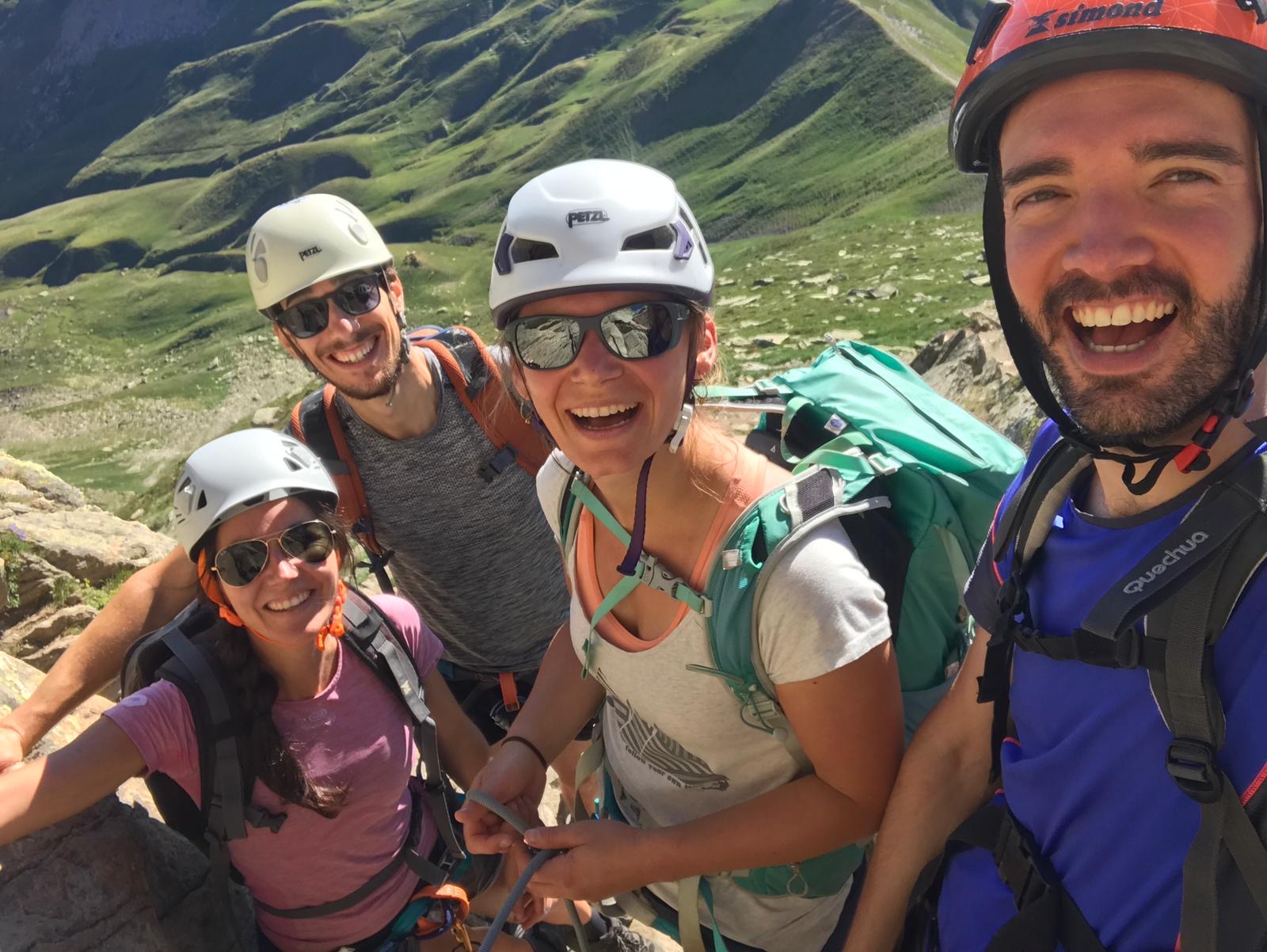 Peu de temps après le Col de Suzon (2120m), nous nous sommes équipés de baudriers et casques. C’était parti pour l’escalade ! Antoine nous avait prévenu avant de partir que le plus dangereux sur l’Ossau est la chute de pierres. D’autant plus en juillet et avec un temps magnifique, donc forcément pas mal de monde sur l’ascension.