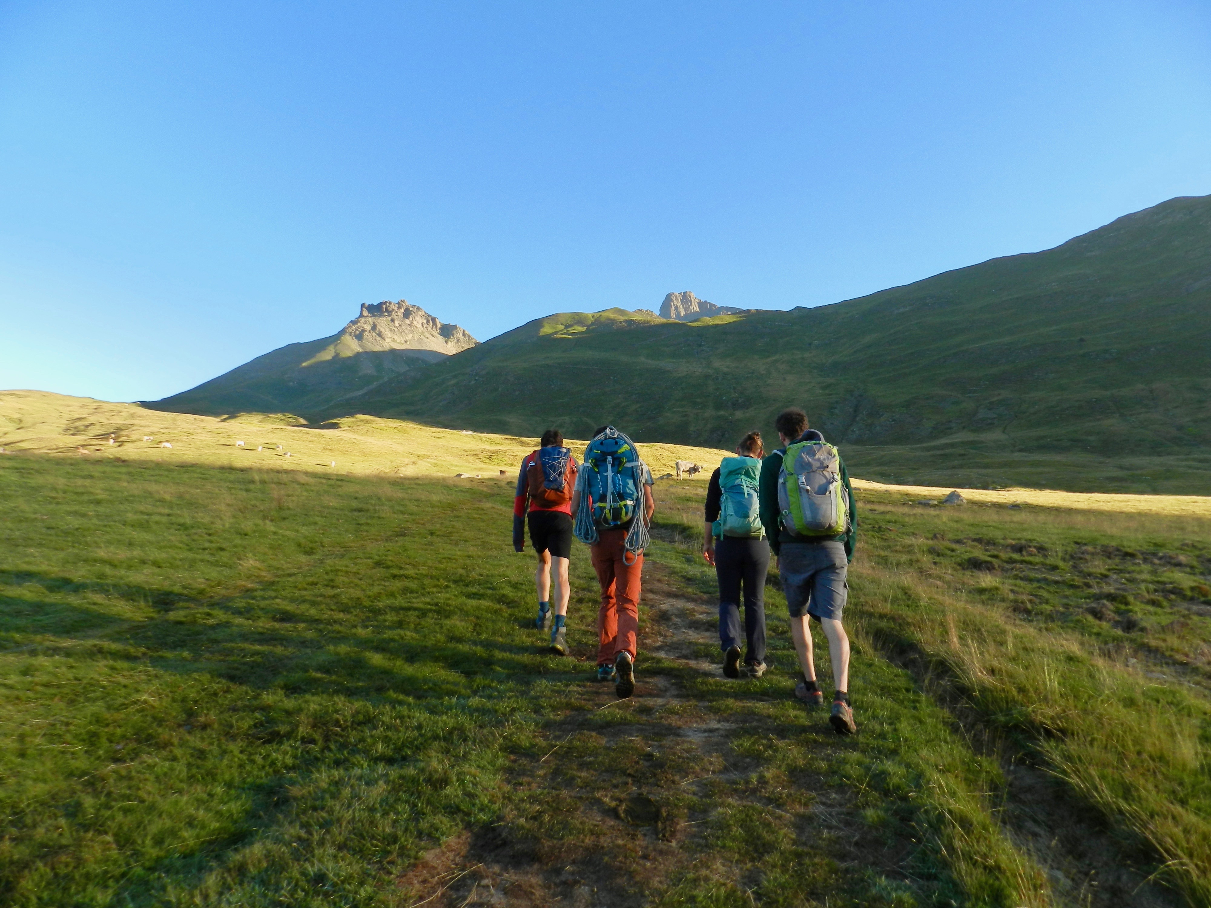 Nous sommes donc partis tôt le matin de la Cabane de Laraille (quasiment au niveau du Col du Pourtalet) (1720m), avec une magnifique lumière du matin. Tous les 5 : Antoine (notre grimpeur émérite), Fanny (ma dentiste préférée, que j’ai retrouvée par hasard en arrivant à Pau et en allant me faire détartrer les dents, on notera que nous avons un faible pour les dents, vu que nous allions grimper une dent, ok je sais parfois je fais des blagues pas drôles !!), Nico (copain de Paris et retrouvé à Pau), et Damien.