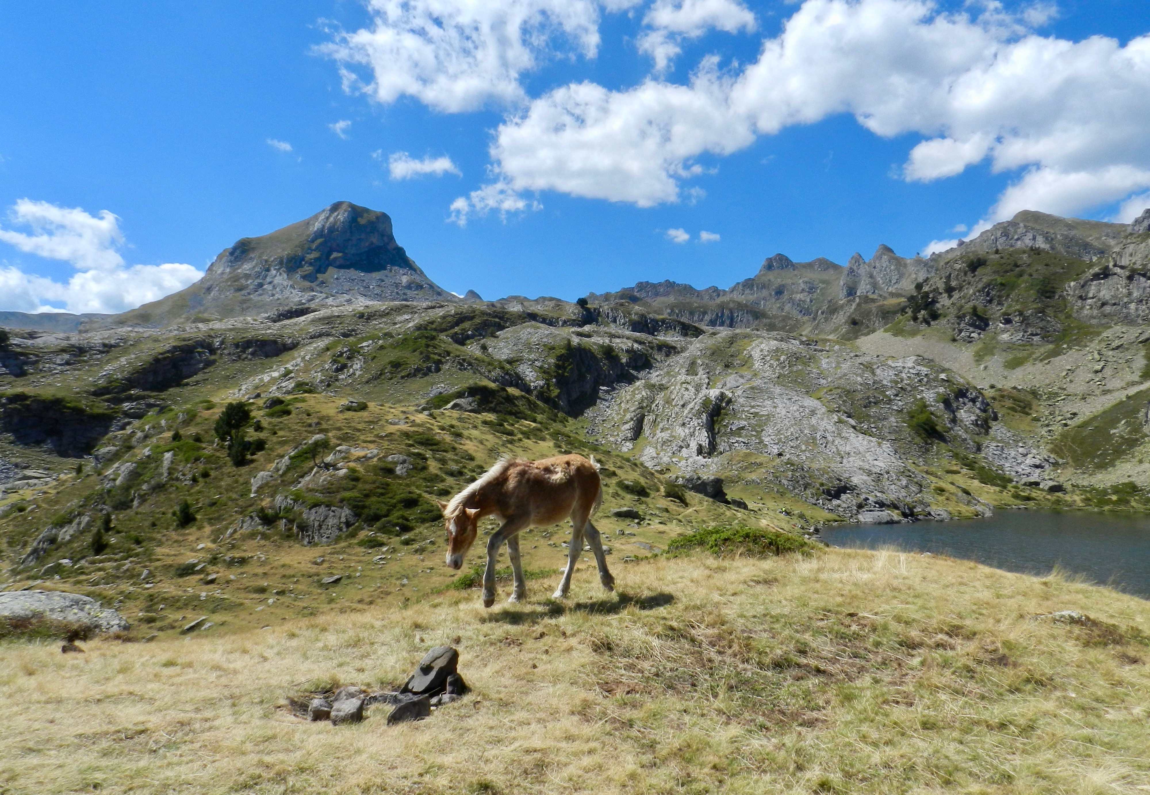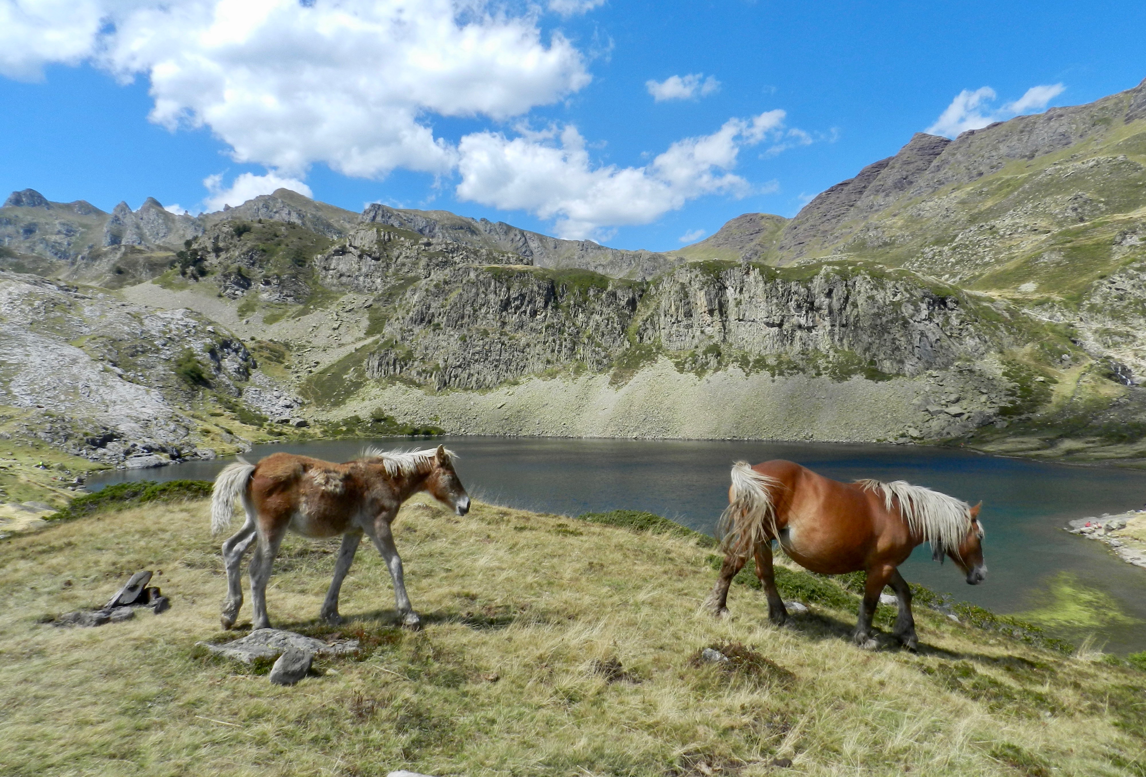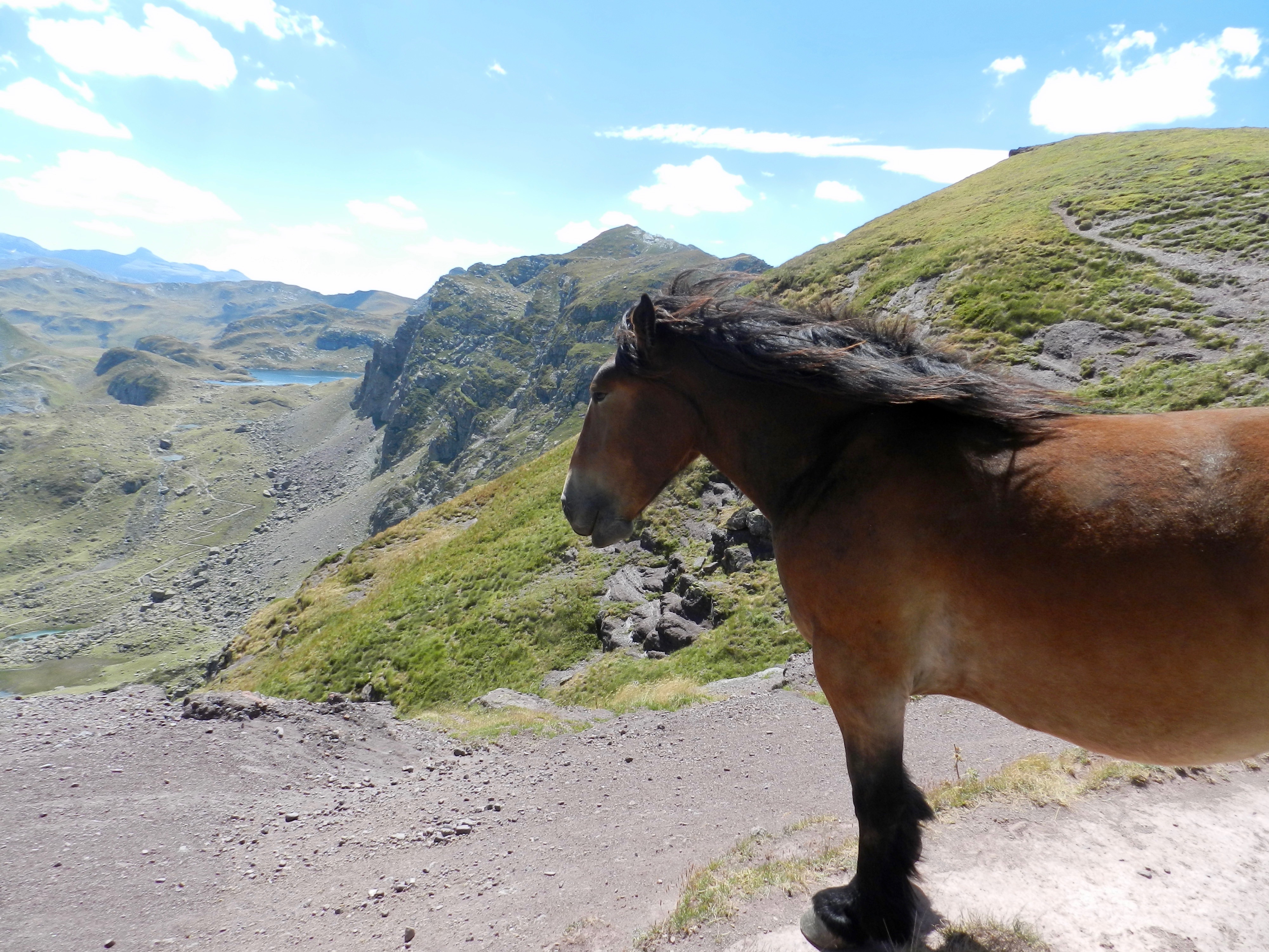 Le premier lac : Roumassot (1845m) : sublime, avec des chevaux et poulain, et en arrière fond le fameux Jean Pierre, pour ne pas nommer l’Ossau !
