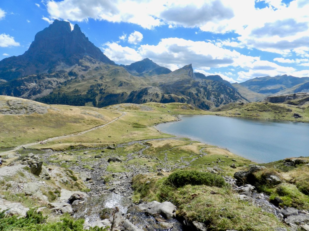 Nous sommes finalement arrivés assez rapidement au lac d’Aule (2040m). Piquenique magique le long du lac et face à JP (l’Ossau, cf article, sur l’ascension en juillet). Nous étions quasiment seuls, juste une famille, avec des enfants très téméraires (peut être des bretons ?) se baignant !! Perso, pas du tout envie de me baigner, dès qu’il y avait des nuages, il faisait bien froid, je crois même que j’avais mes gants !!