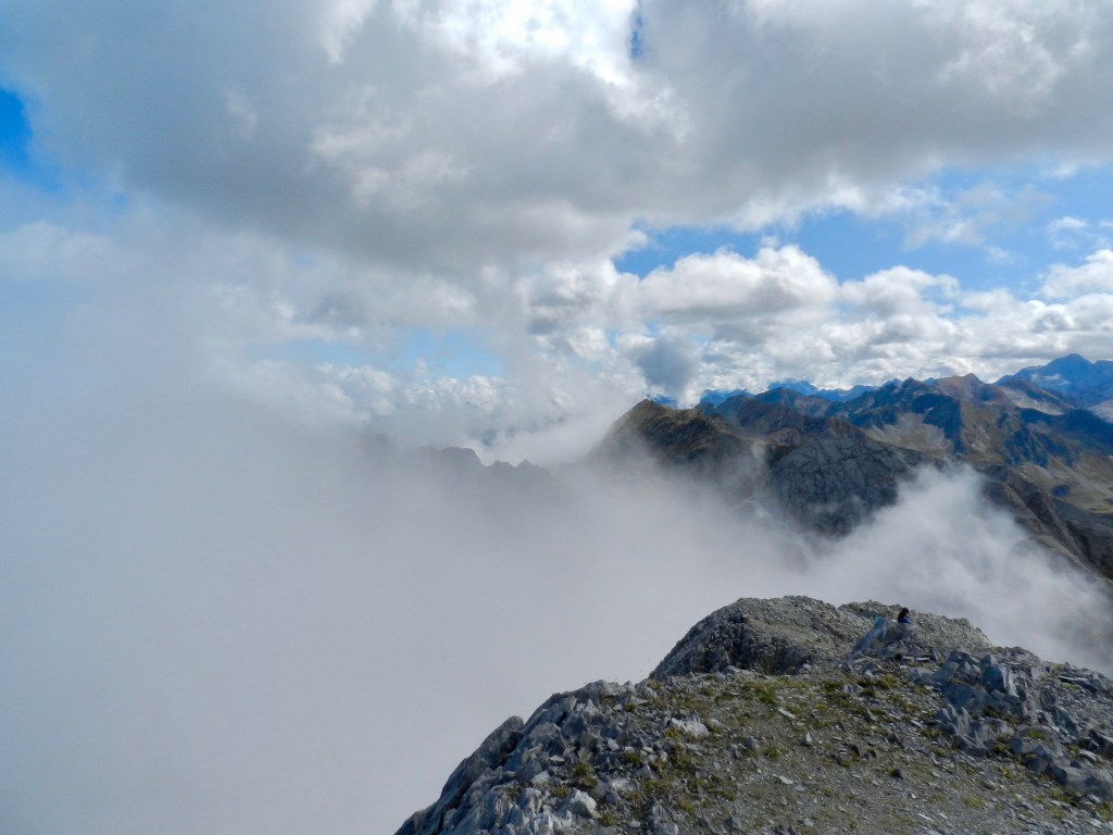Le temps commençait à changer, nous avions d’ailleurs vu à la météo qu’il y aurait de la pluie en début d’après-midi (au final on n’en a pas eu), il ne fallait pas trainer. D’ailleurs, en partant du sommet, la vue sur Gourette était complétement sous les nuages… Ca fait toujours une ambiance un peu mystique, c’est magique.