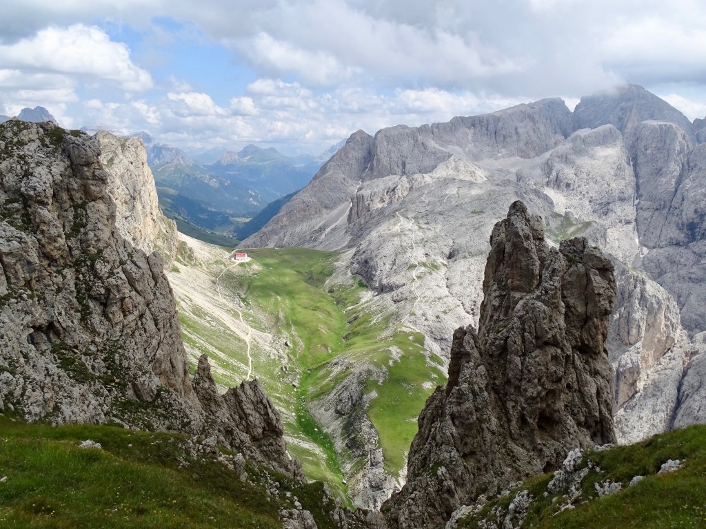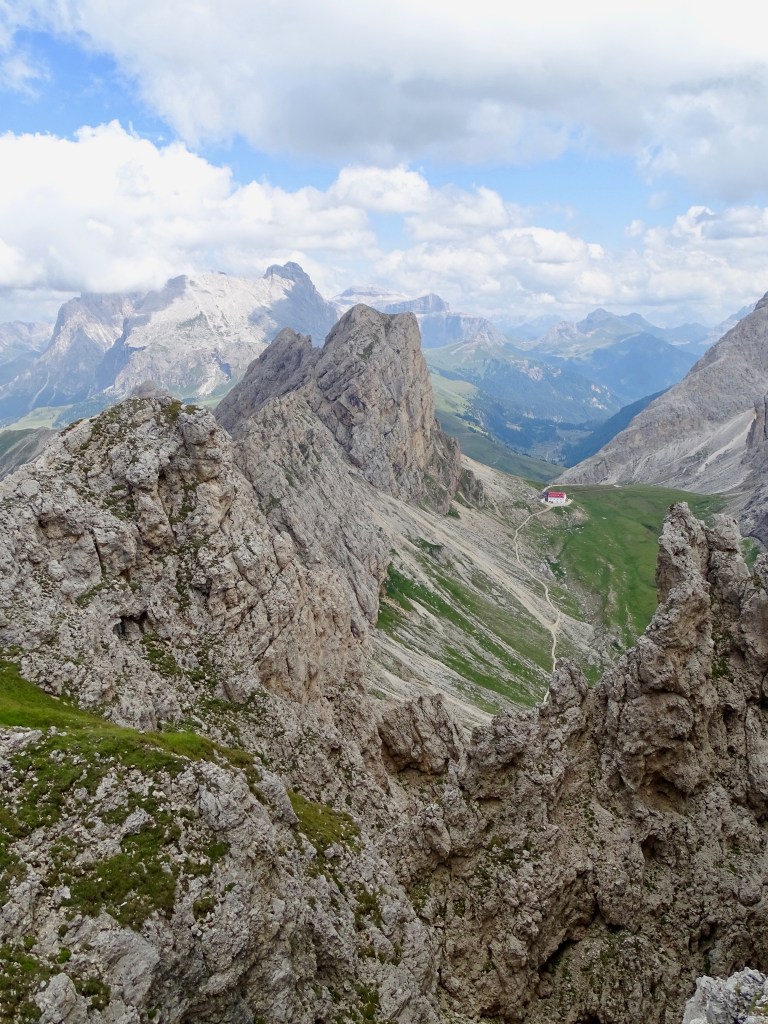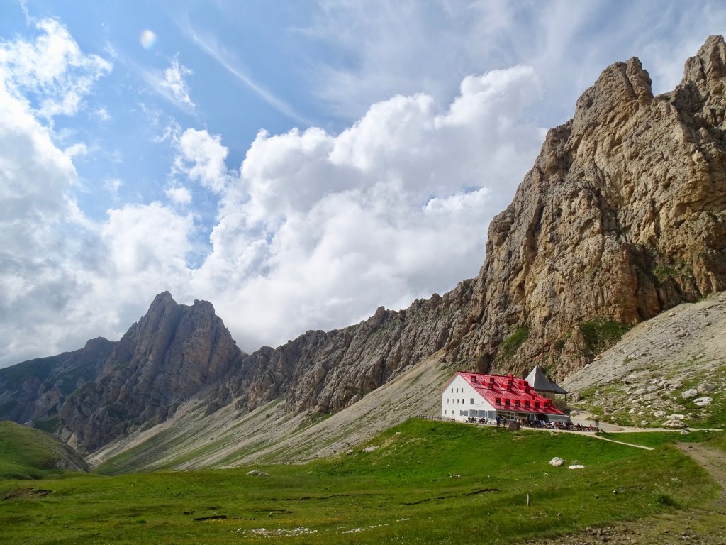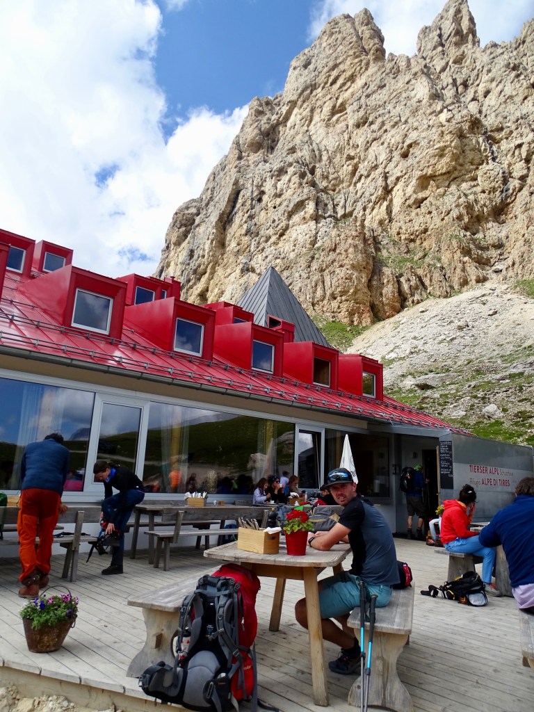 Arrivés au refuge Alpe Di Tires (2400m) un peu avant 15h (oui nous avions vraiment mis deux heures pour faire les crêtes !), où nous avons déjeuné (ou goûter vu l’heure !). Super bon. D’ailleurs le refuge est superbe (par contre beaucoup de monde car il est accessible facilement par un autre versant ) !!!