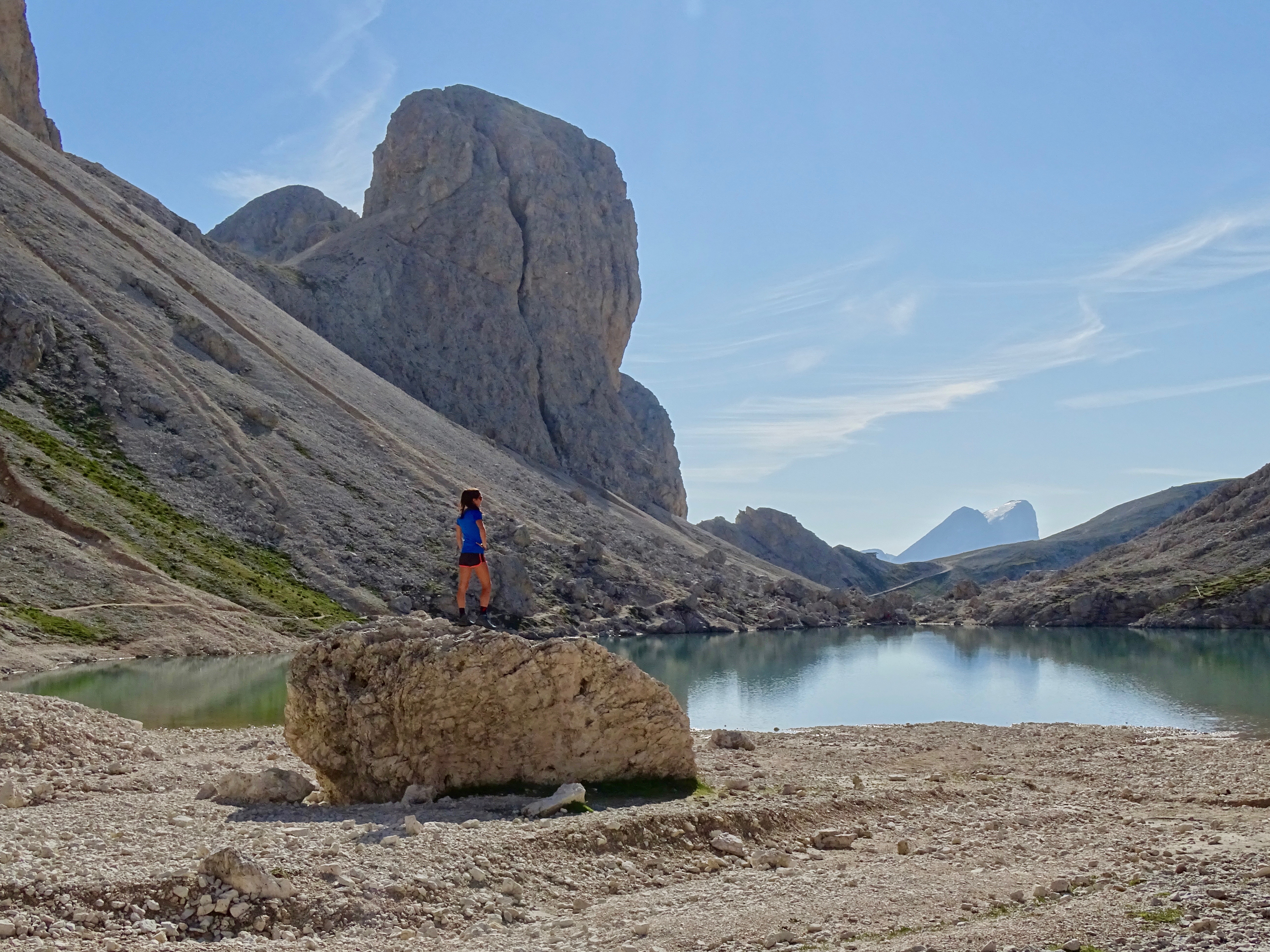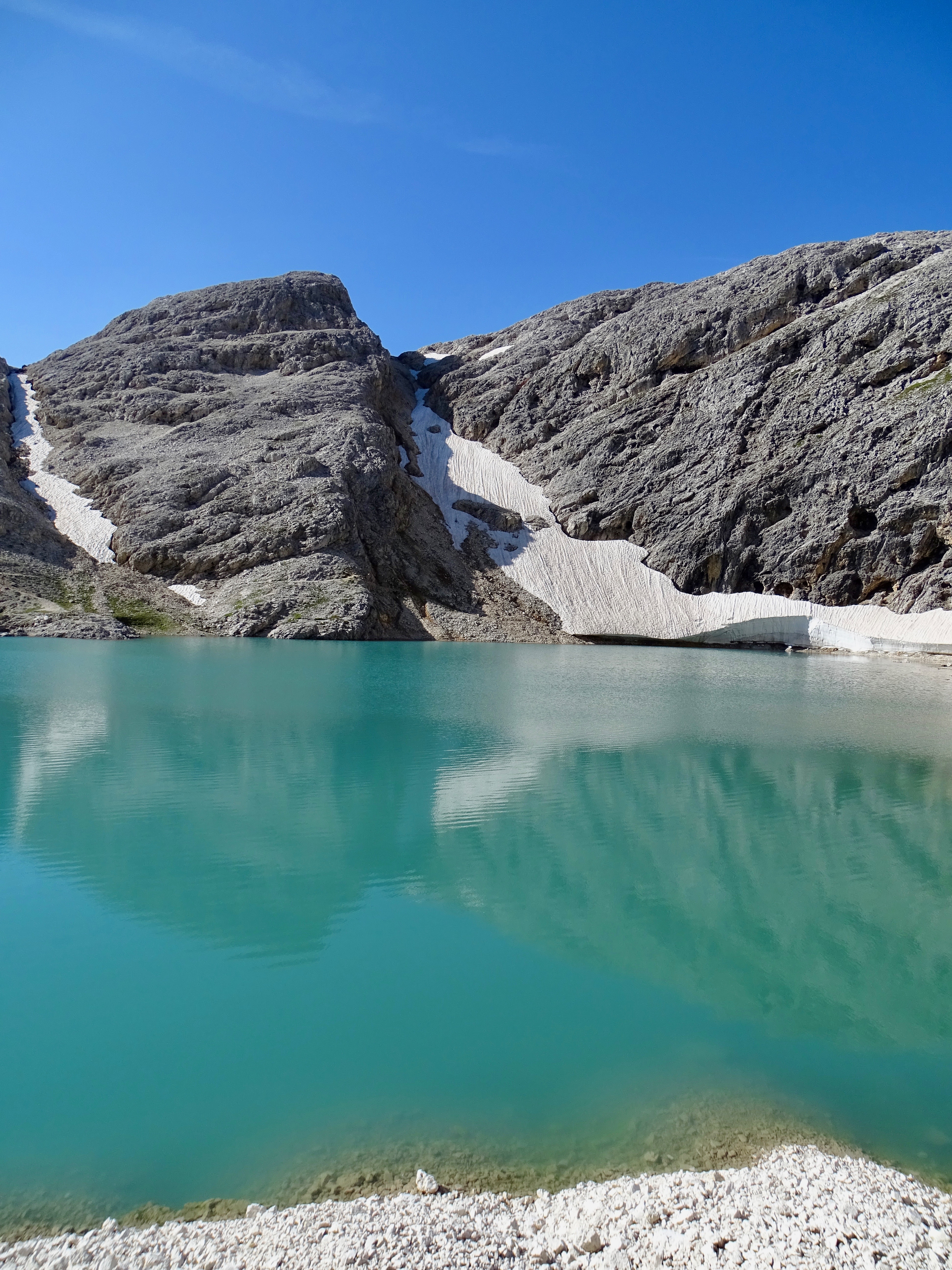 Nous avons continué jusqu’au lac d’Antermoia. Tellement beau !!!!! Avec de la neige autour !