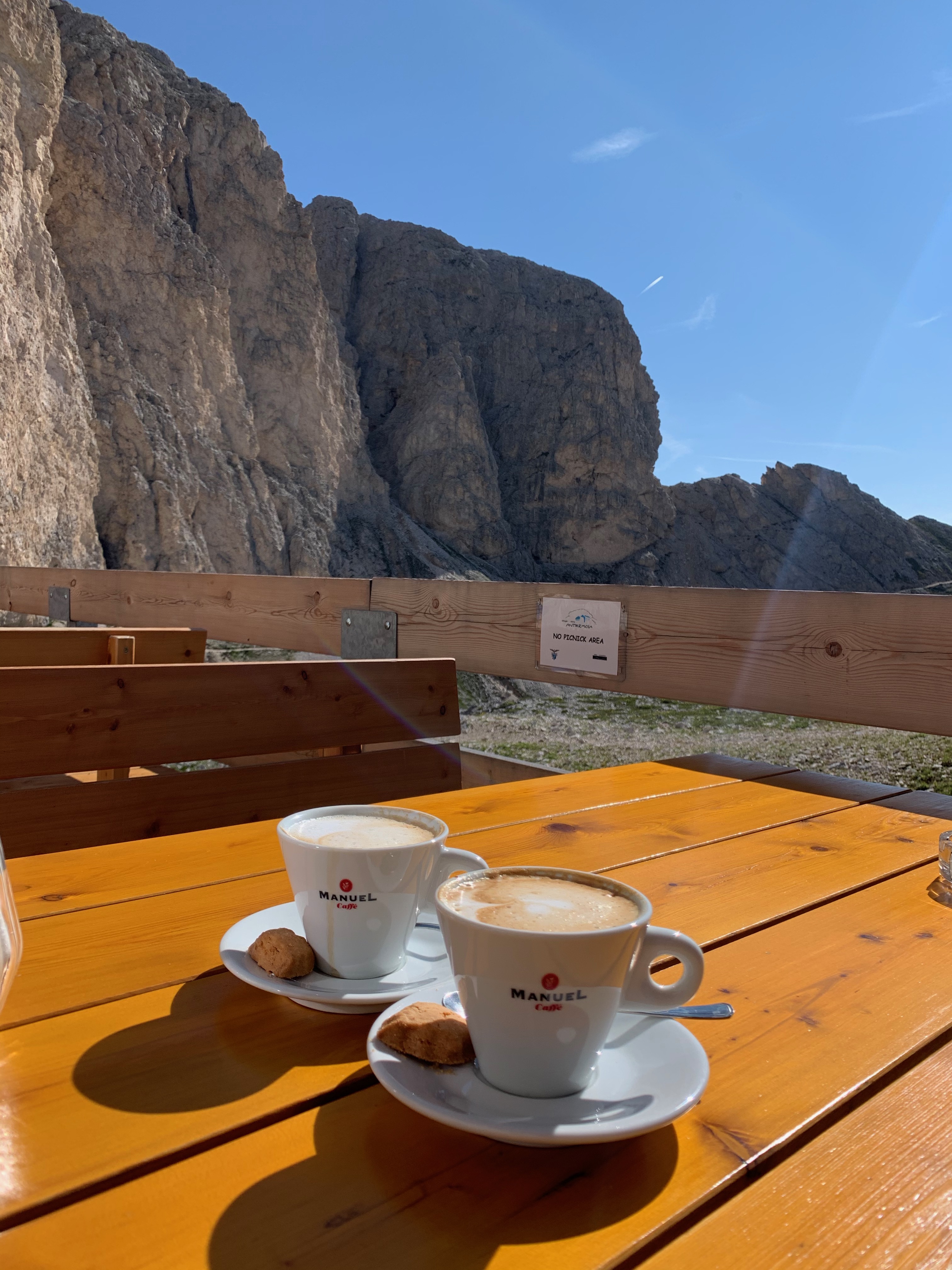 Ensuite on a pris un cappuccino au refuge du même nom du lac (refuge d’antermoa), qui est magnifique ! Ça change des vieux refuges en France franchement !!