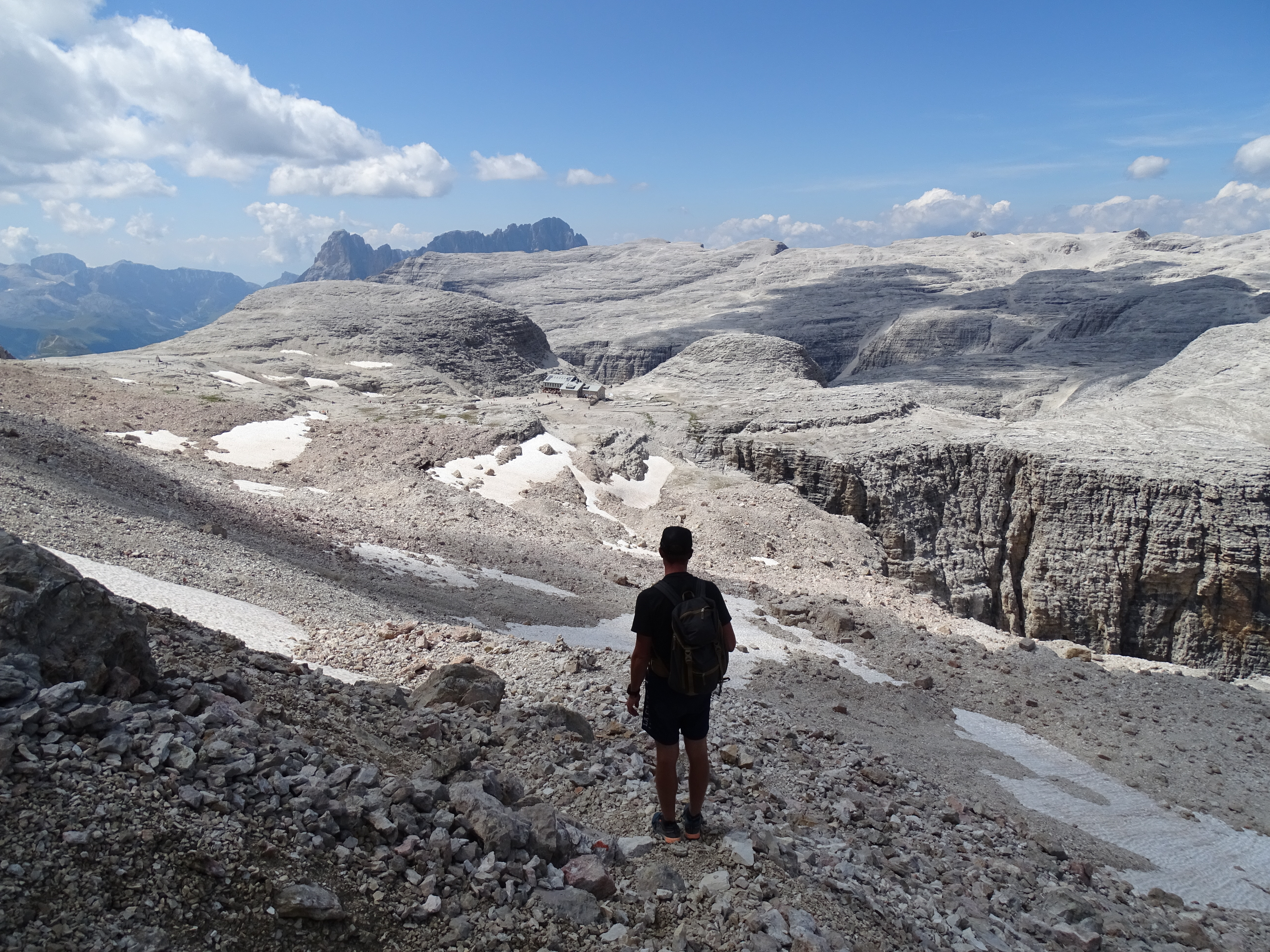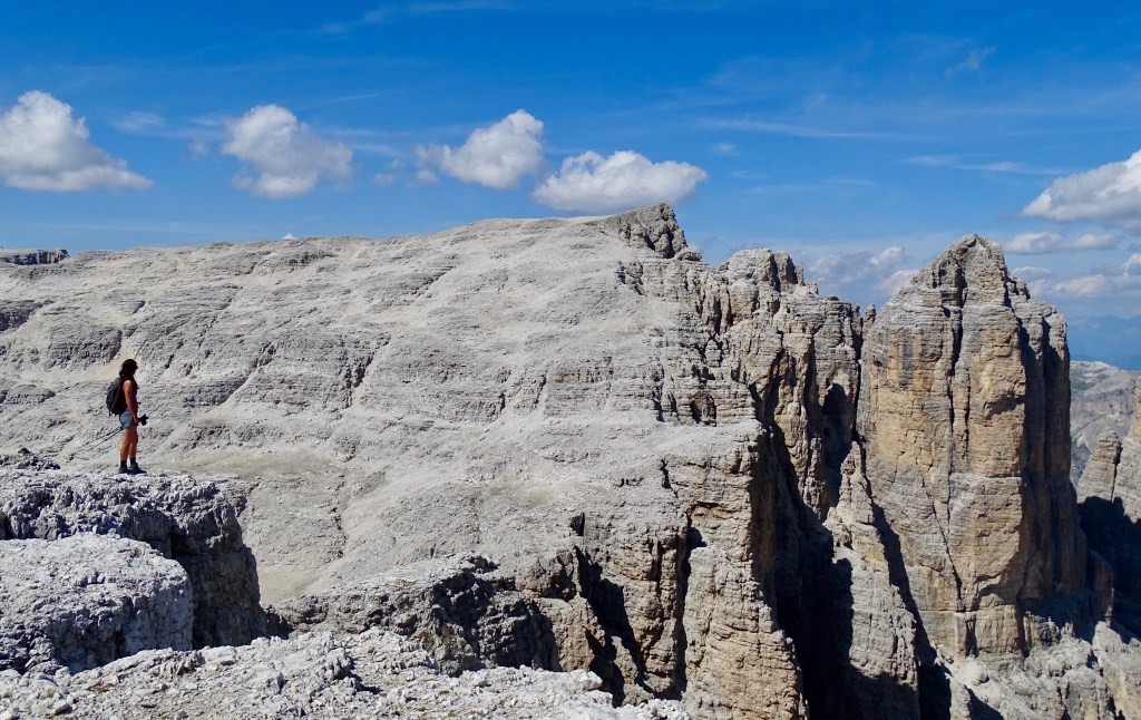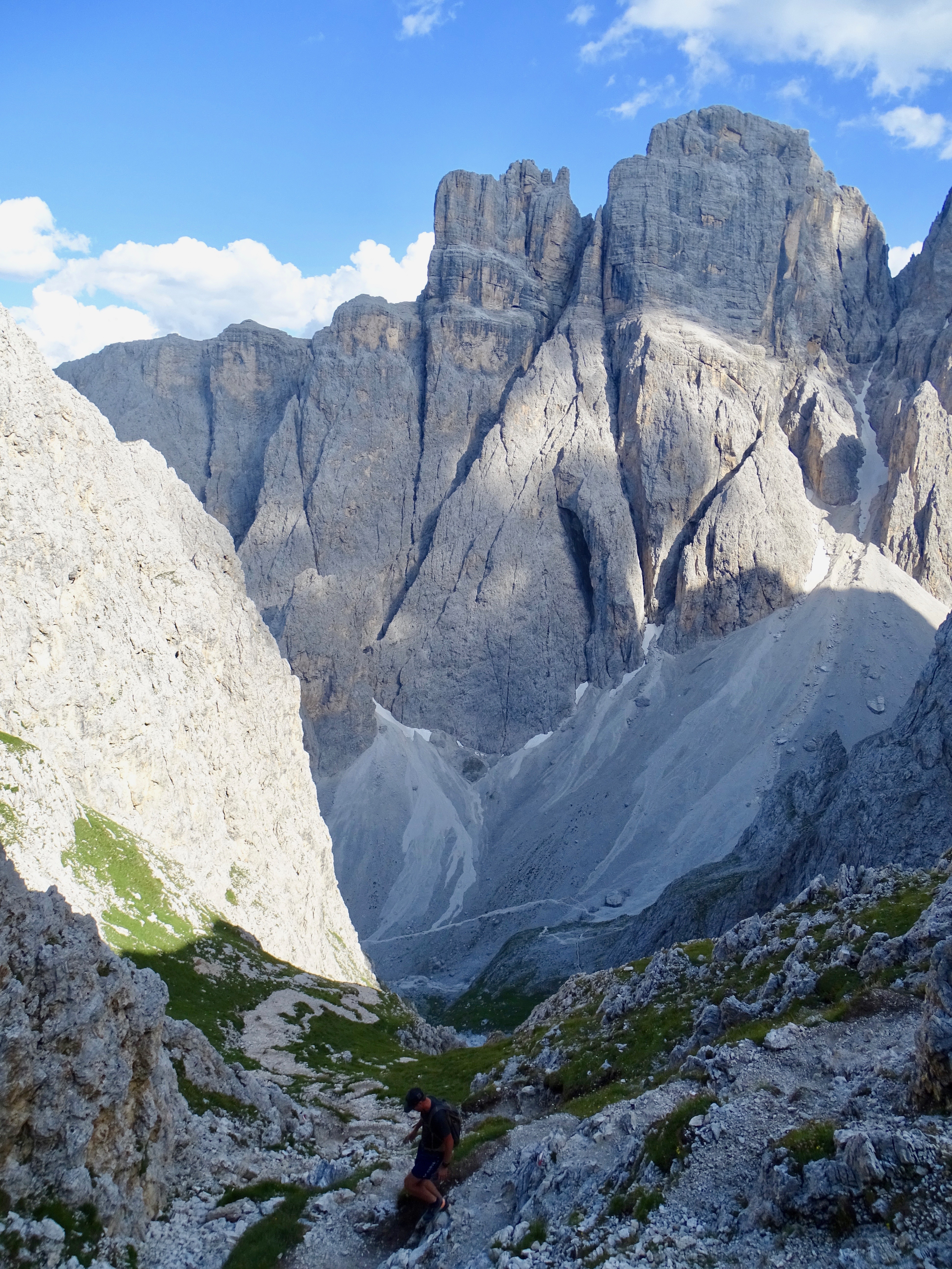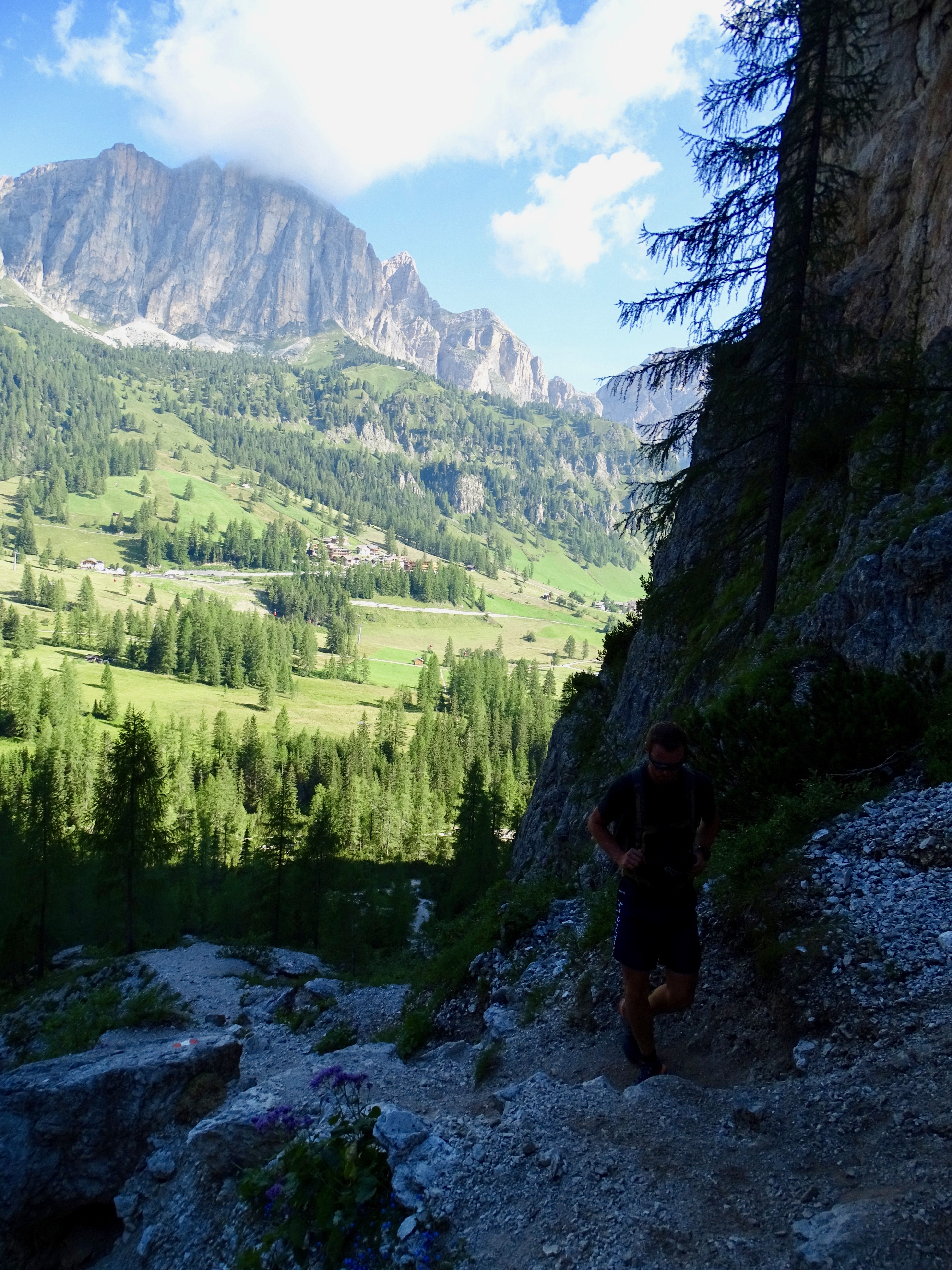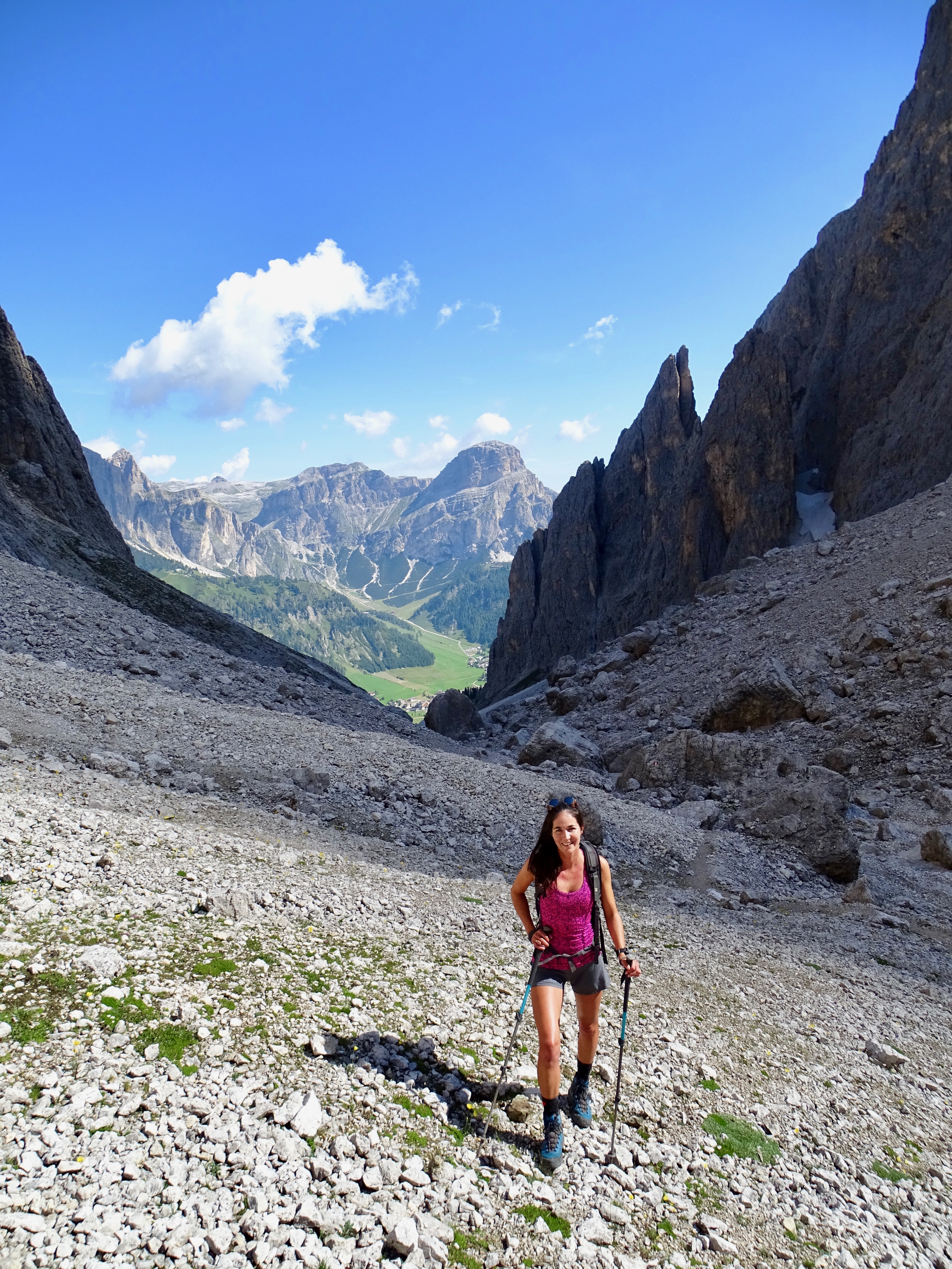 Il nous restait encore 900m de dénivelé négatif et nous voulions arriver pour 18h pour profiter du spa de l’hôtel (qui ferme à 19h). Donc nous avons pas mal tracé, enfin sauf dans les parties « escalades » (chemin 676 sur la carte, en gros si vous avez suivi c’est le chemin qui partait à droite au début de la montée du matin indiquant le refuge Pisciadu). Sublime sublime sublime avec tous les pitons rocheux autour de nous !