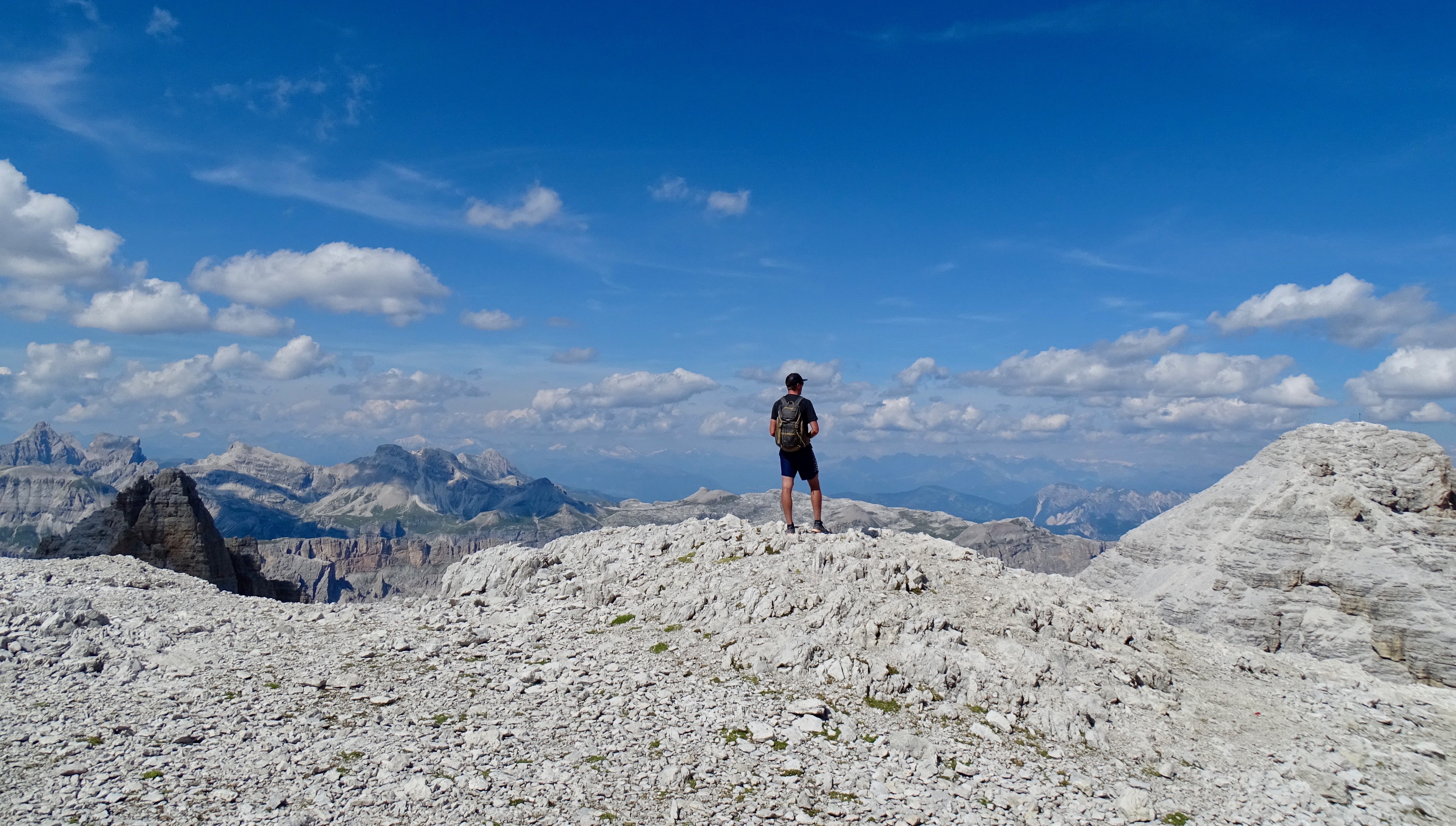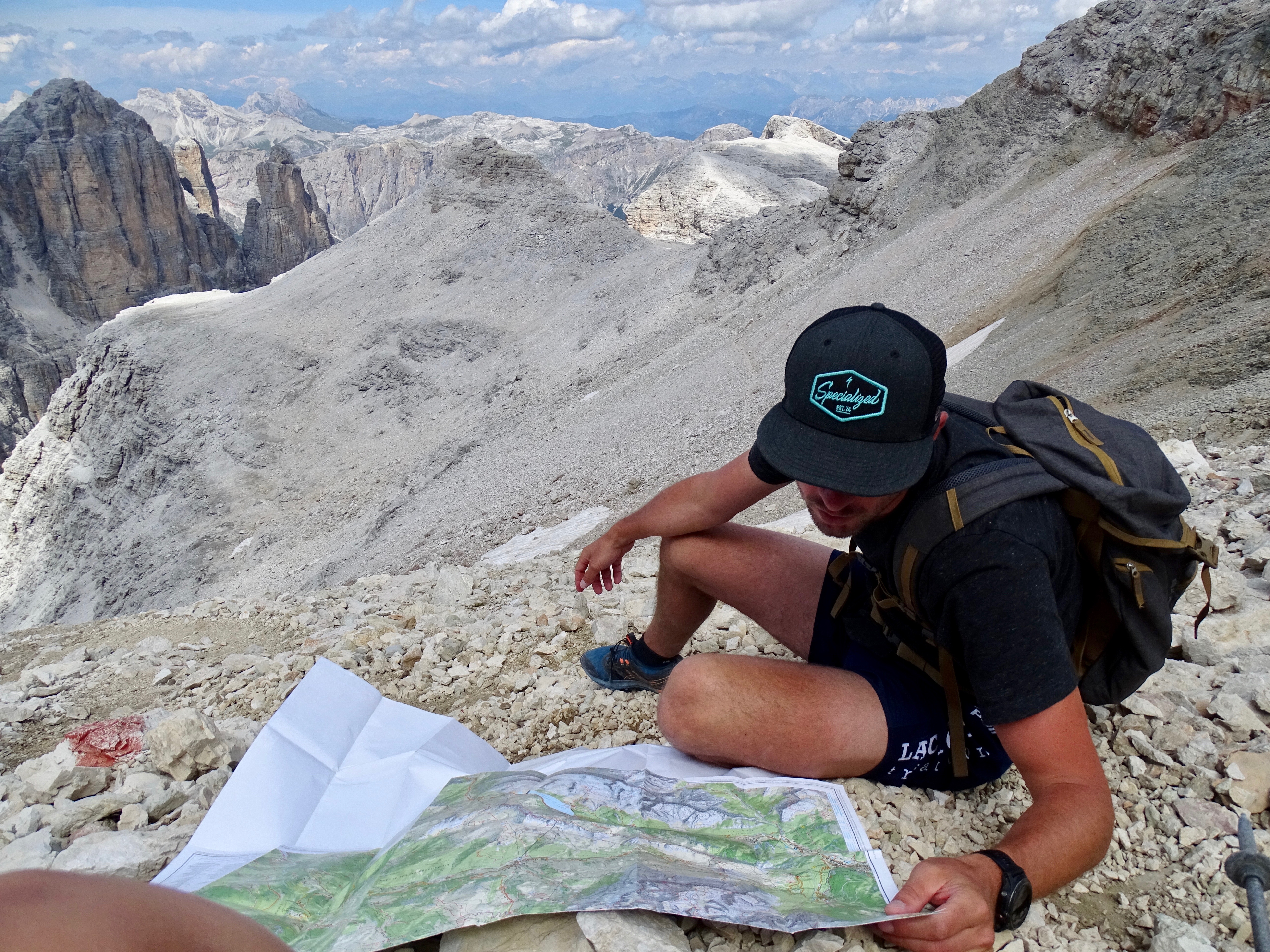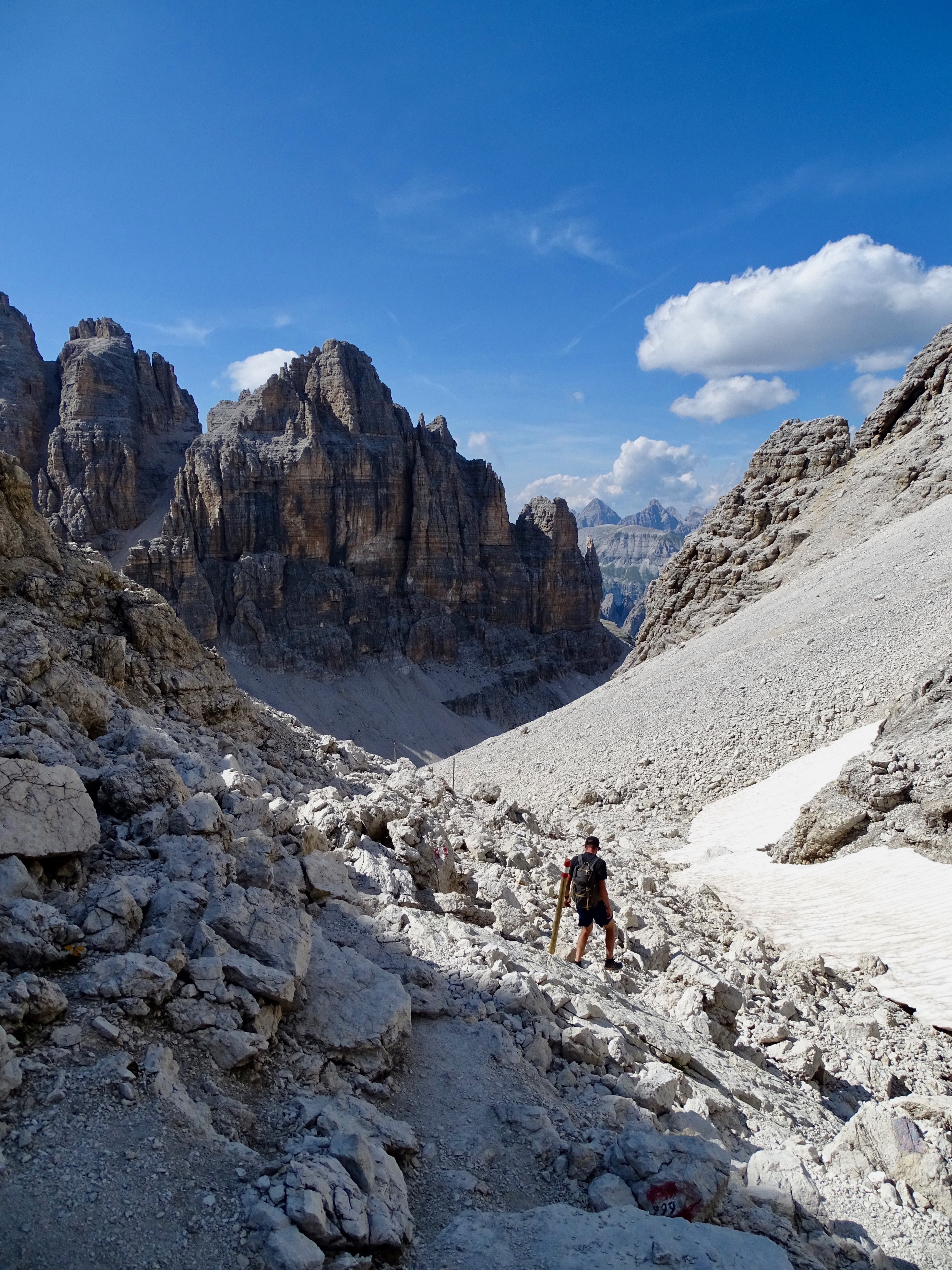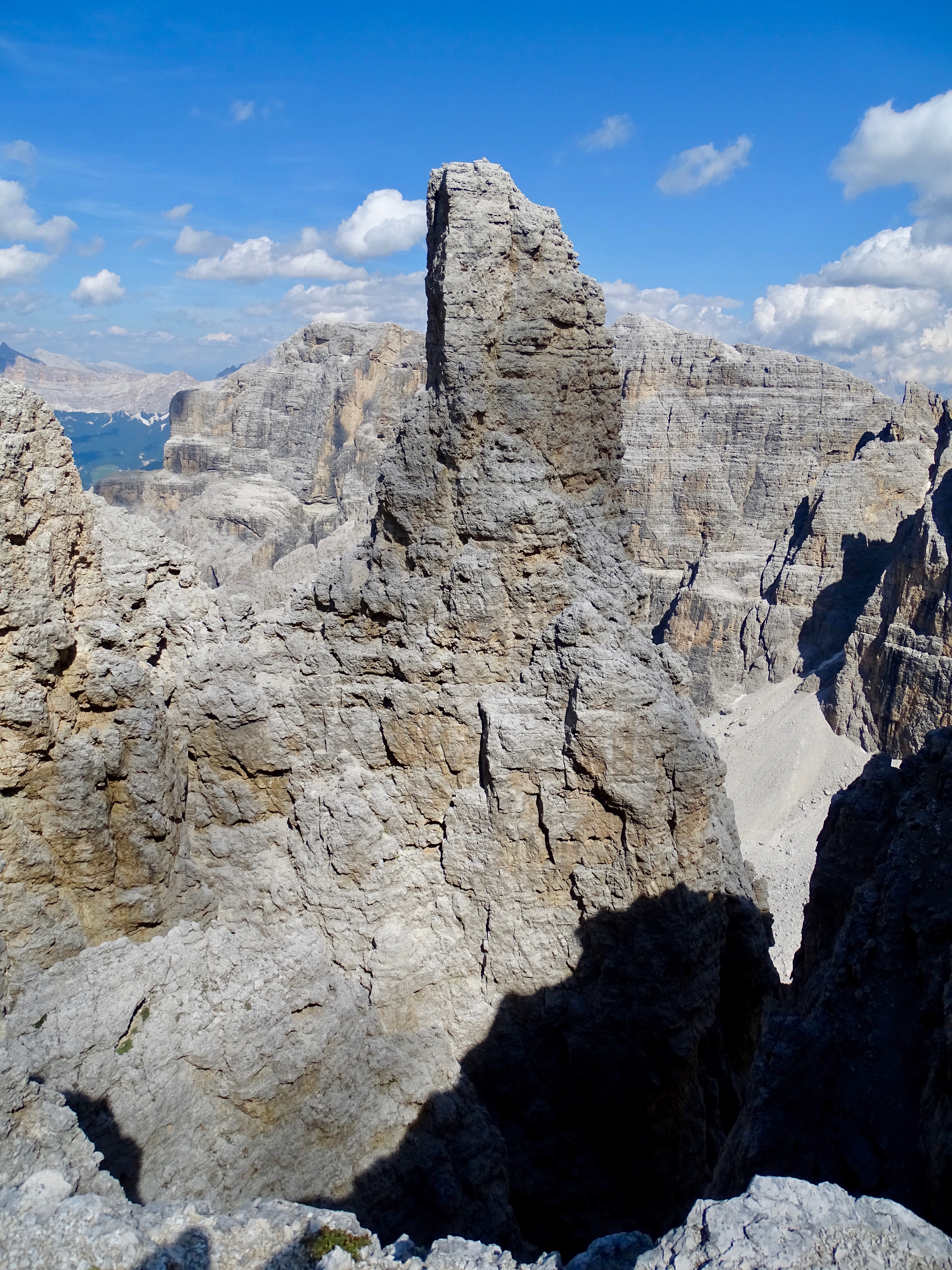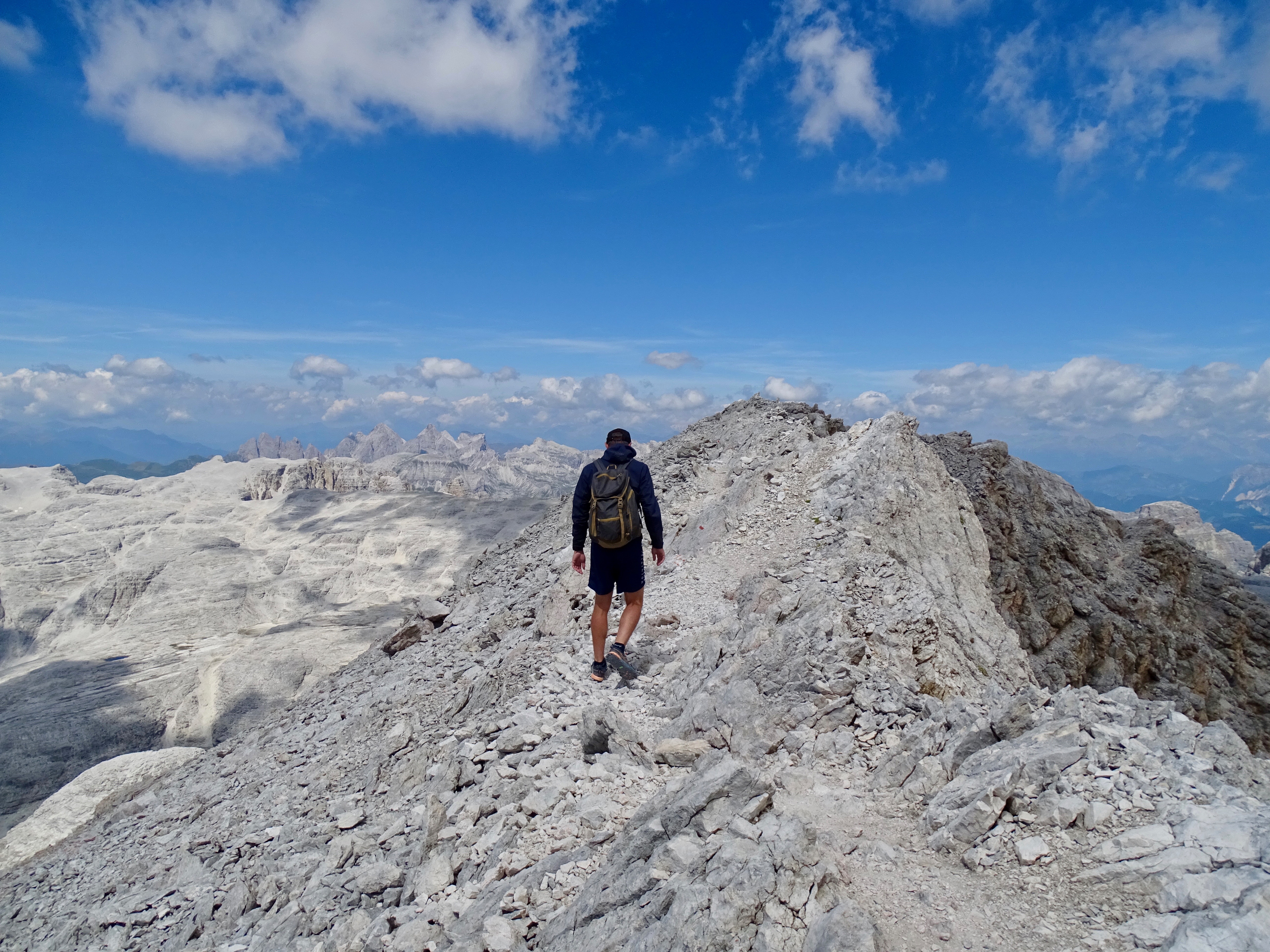 Il nous restait encore 900m de dénivelé négatif et nous voulions arriver pour 18h pour profiter du spa de l’hôtel (qui ferme à 19h). Donc nous avons pas mal tracé, enfin sauf dans les parties « escalades » (chemin 676 sur la carte, en gros si vous avez suivi c’est le chemin qui partait à droite au début de la montée du matin indiquant le refuge Pisciadu). Sublime sublime sublime avec tous les pitons rocheux autour de nous !