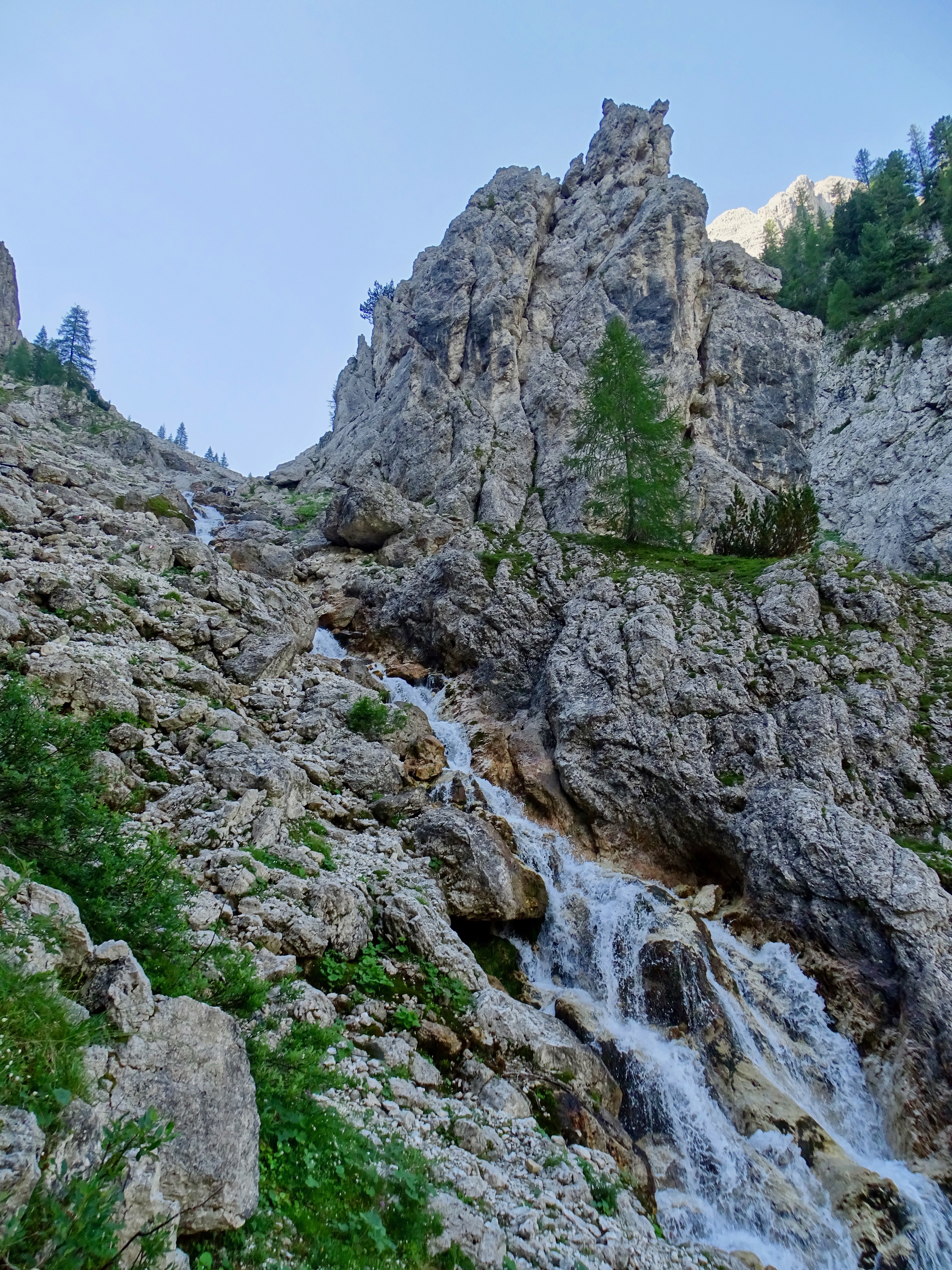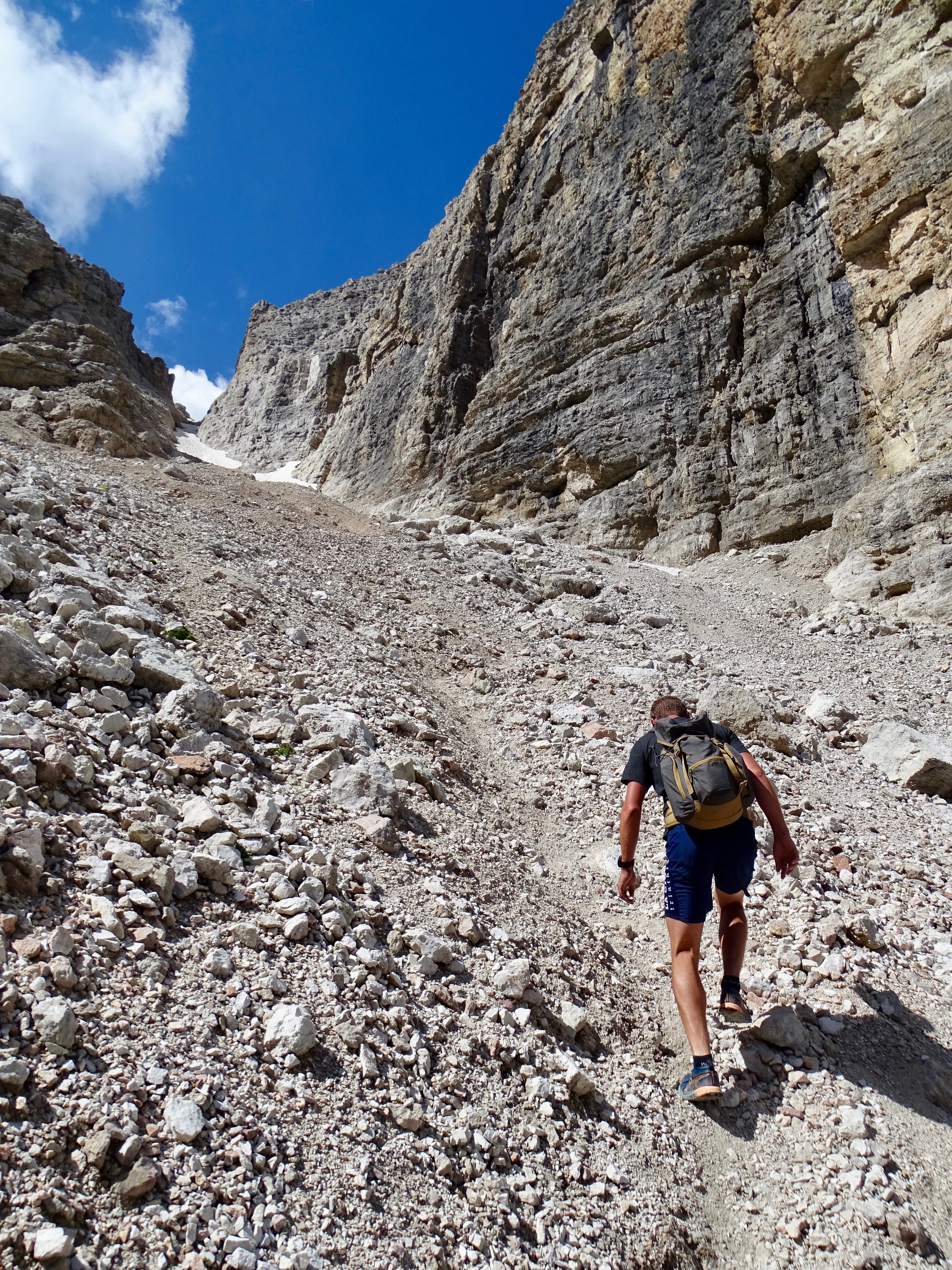 A un moment il y a un panneau indiquant le refuge Pisciadu Cavazza par la droite, où le chemin est bien tracé. Mais nous avons continué tout droit dans le pierrier.