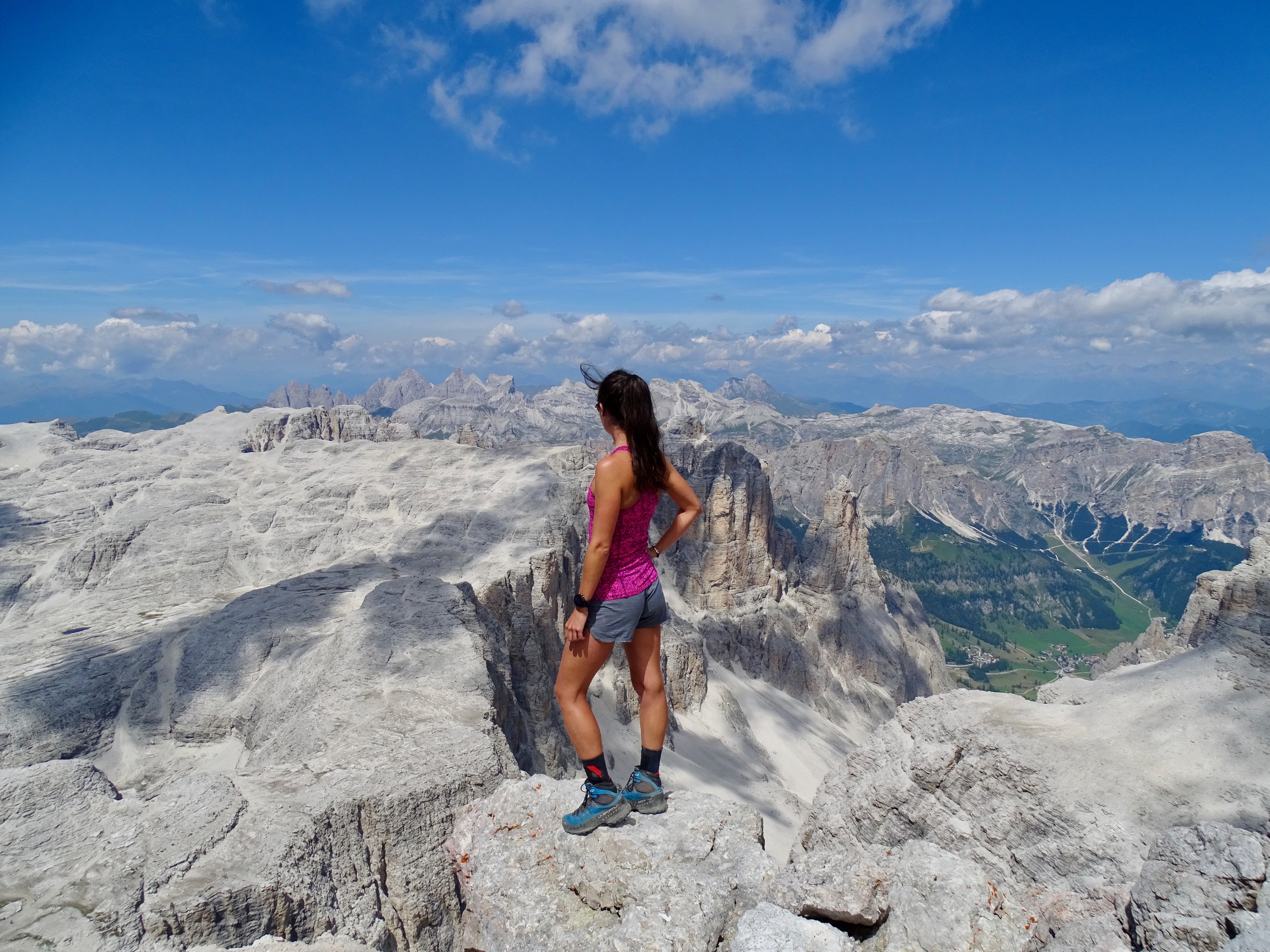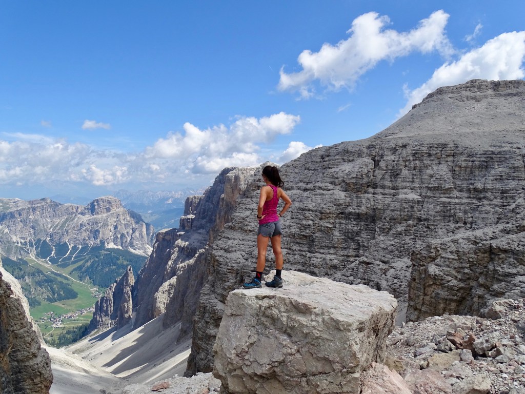 Par la vallée de Colfosco. Avant toute chose je tiens à préciser que cet itinéraire est vertigineux, risqué et qu’il est préférable de s’équiper de cordes (que nous n’avions pas !). Il existe un autre itinéraire par une autre vallée plus facile.