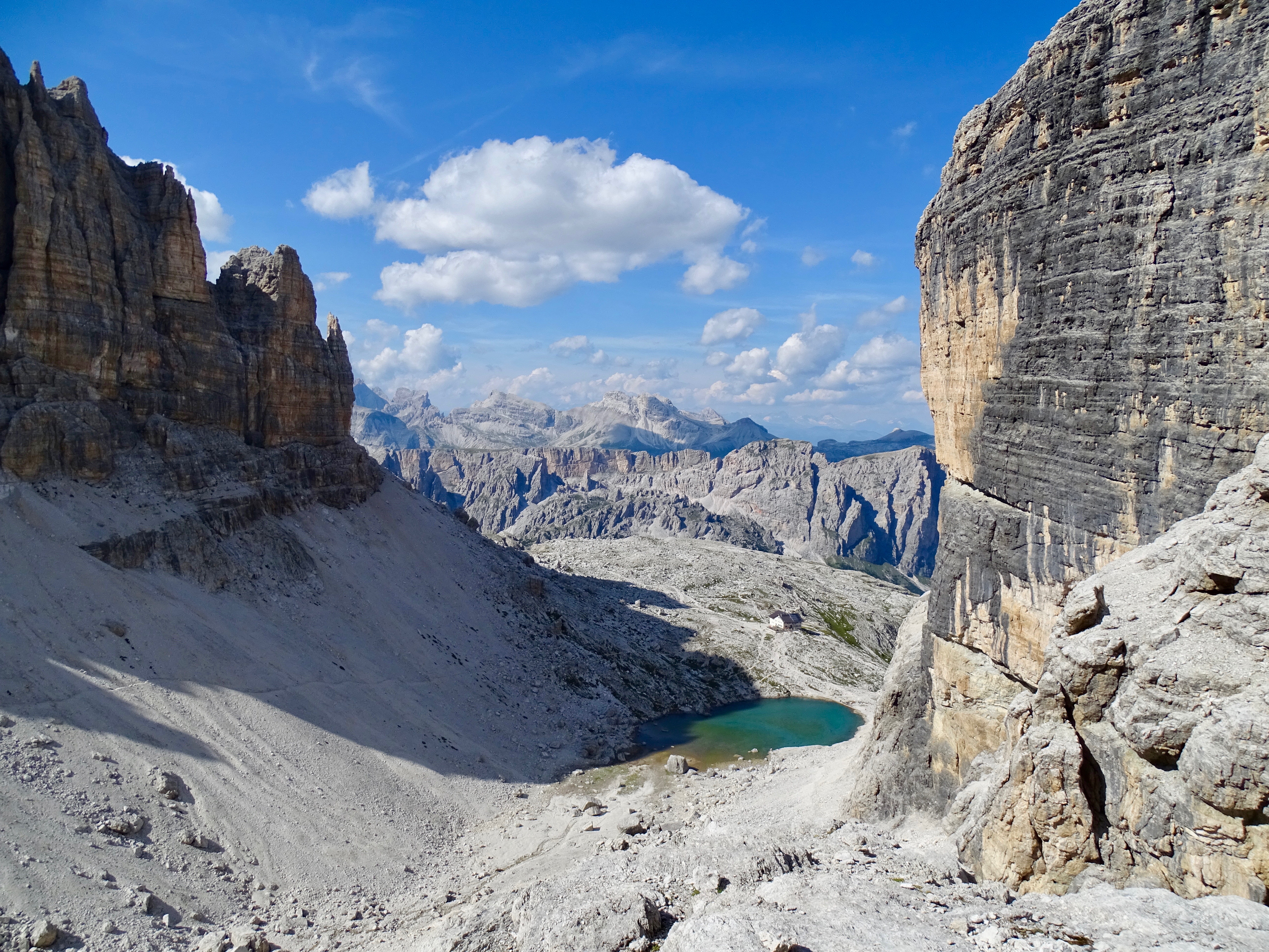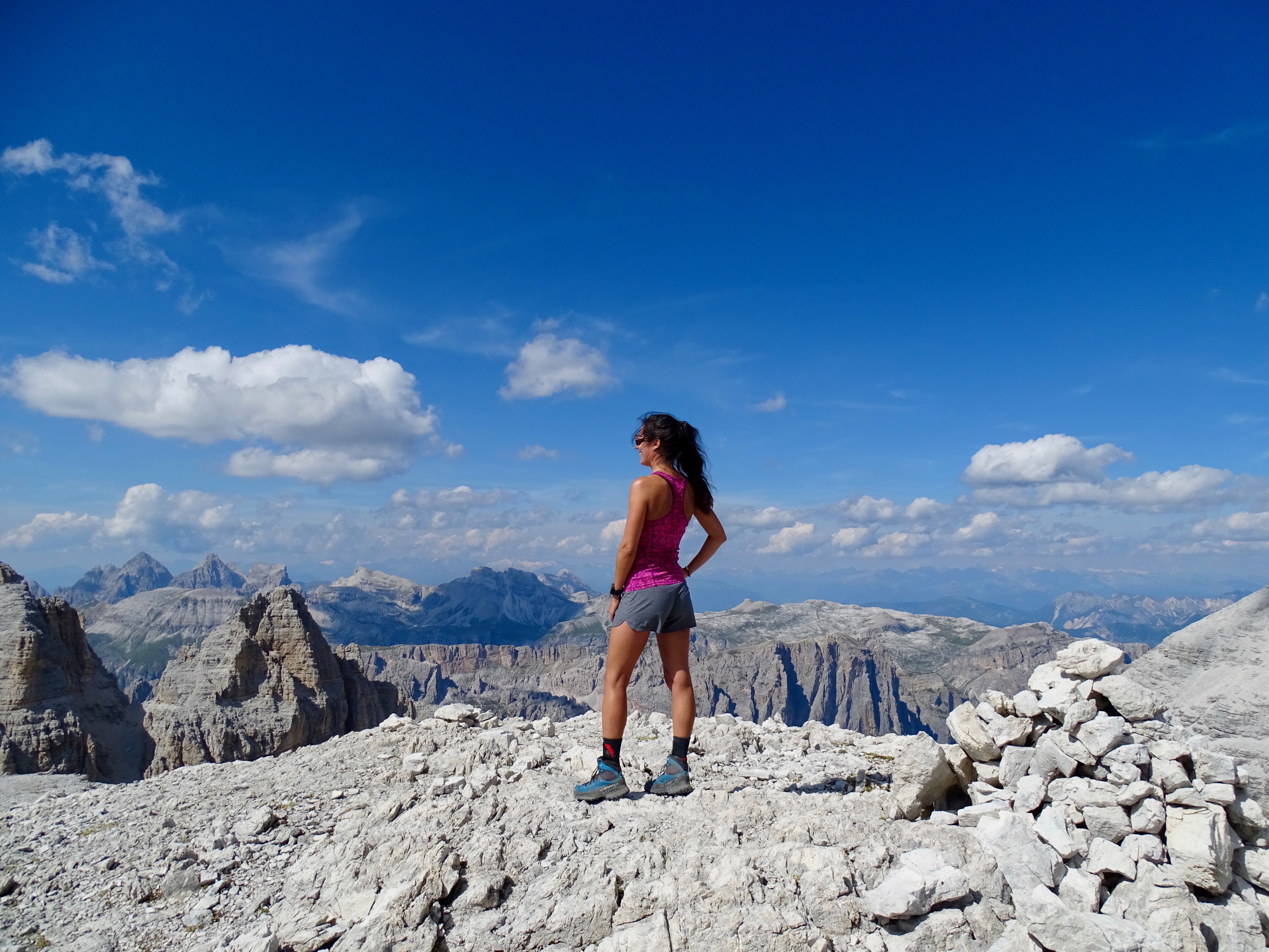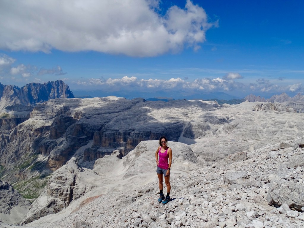 Puis descente dans la caillasse. J’étais contente car en descente je n’avais quasiment plus mal à ma cheville, faut croire qu’elle s’habituait au terrain de jeu italien ! Quelques passages scabreux avec des lignes de vie, mais facile comparé à ce qu’on avait fait auparavant !