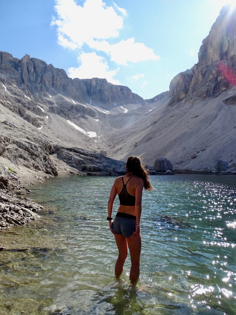 Tentative de se baigner, nous avons juste mis les pieds, elle était vraiment gelée genre moins de 10 degrés. Je pense que j’aurais pu me baigner mais à 17h, et sachant qu’on avait encore toute la descente dans la vallée (donc sans soleil) j’ai eu peur d’avoir froid en ne séchant pas ! Depuis le début du voyage je parlais espagnol, bon je me disais que les italiens pouvaient comprendre. En tout cas Guilhem ne me comprenait pas haha. Il y avait deux mecs qui se baignaient et j’ai commencé à leur baragouiner un truc en espagnol, et bah j’ai bien fait car c’était des espagnols !!