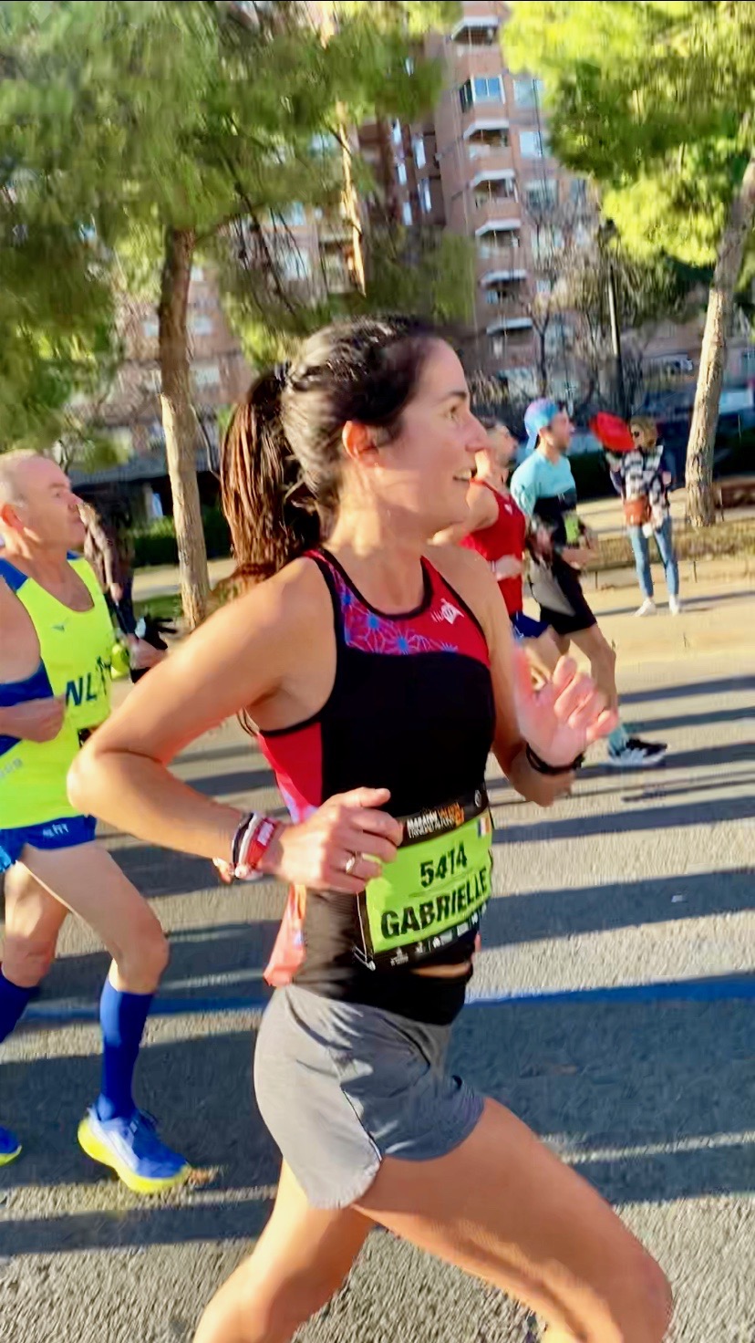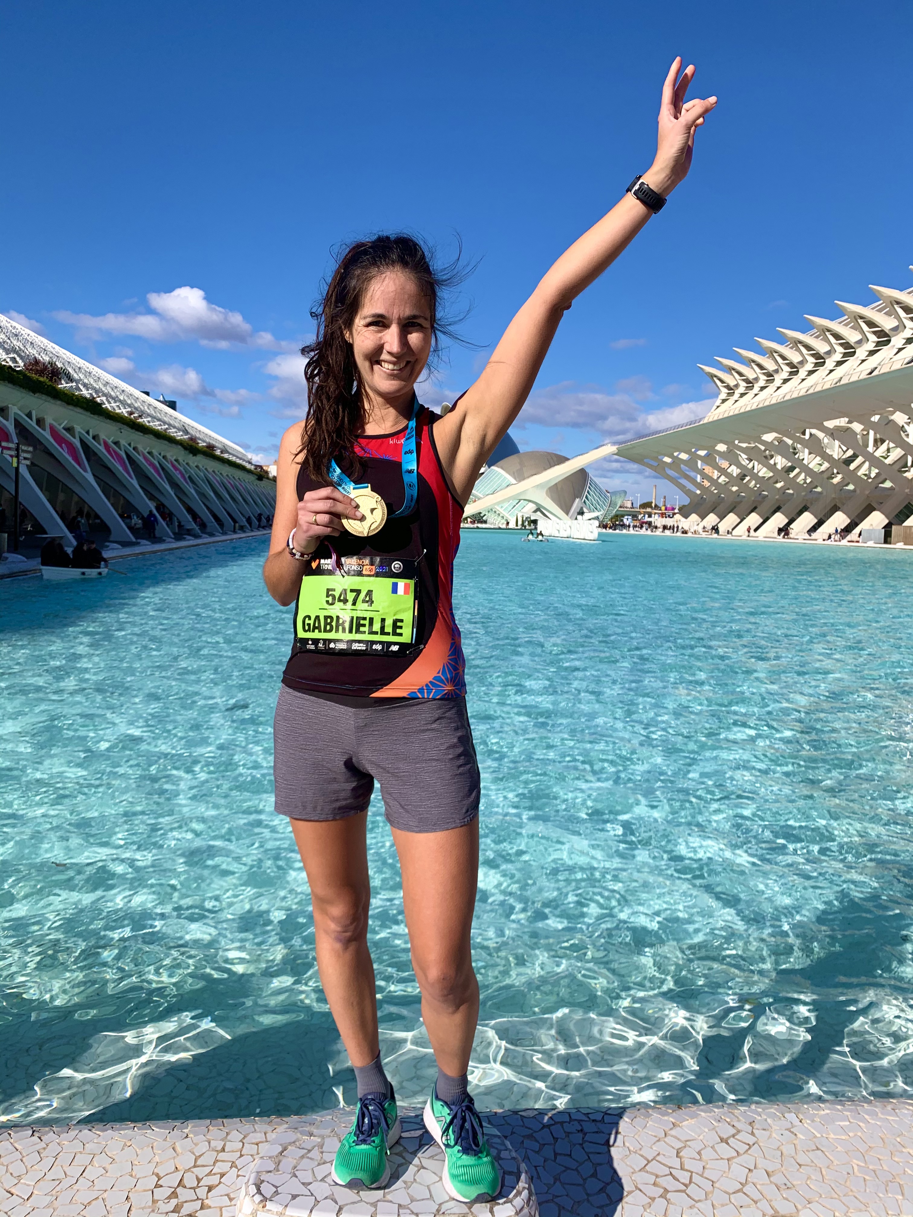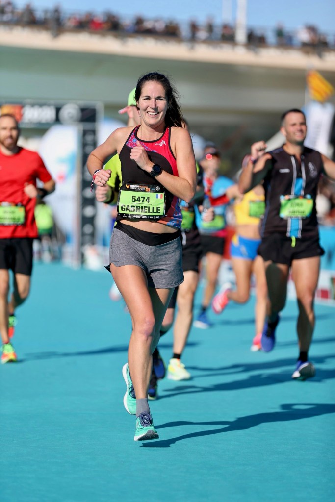 Mais au 40ème, Guitou était là, toujours avec son drapeau du valencia foot !! Il a commencé à courir avec moi, et c’était génial, cela m’a donné des ailes pour garder le même rythme !! Ambiance de folie, il était là et il y avait des milliers de personnes (bon ok à force d’être avec un marseillais j’exagère un peu). C’était génial, on criait Gabrielle, je souriais, je savais que c’était là fin, que j’allais finir ce marathon, en plus avec un superbe chrono.