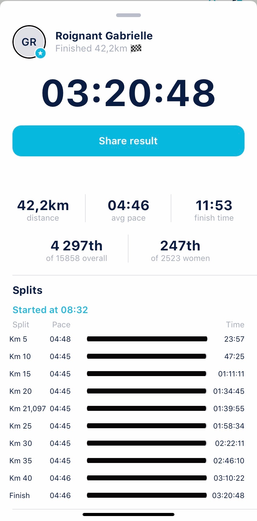 MARATHONIENNE YEAH !!!! Quelle course, que d’émotions, de kiffance, d’amour, de bienveillance, bref, j’étais heureuse à ce moment-là. 42,195km, 3h20min48s, de bonheur !