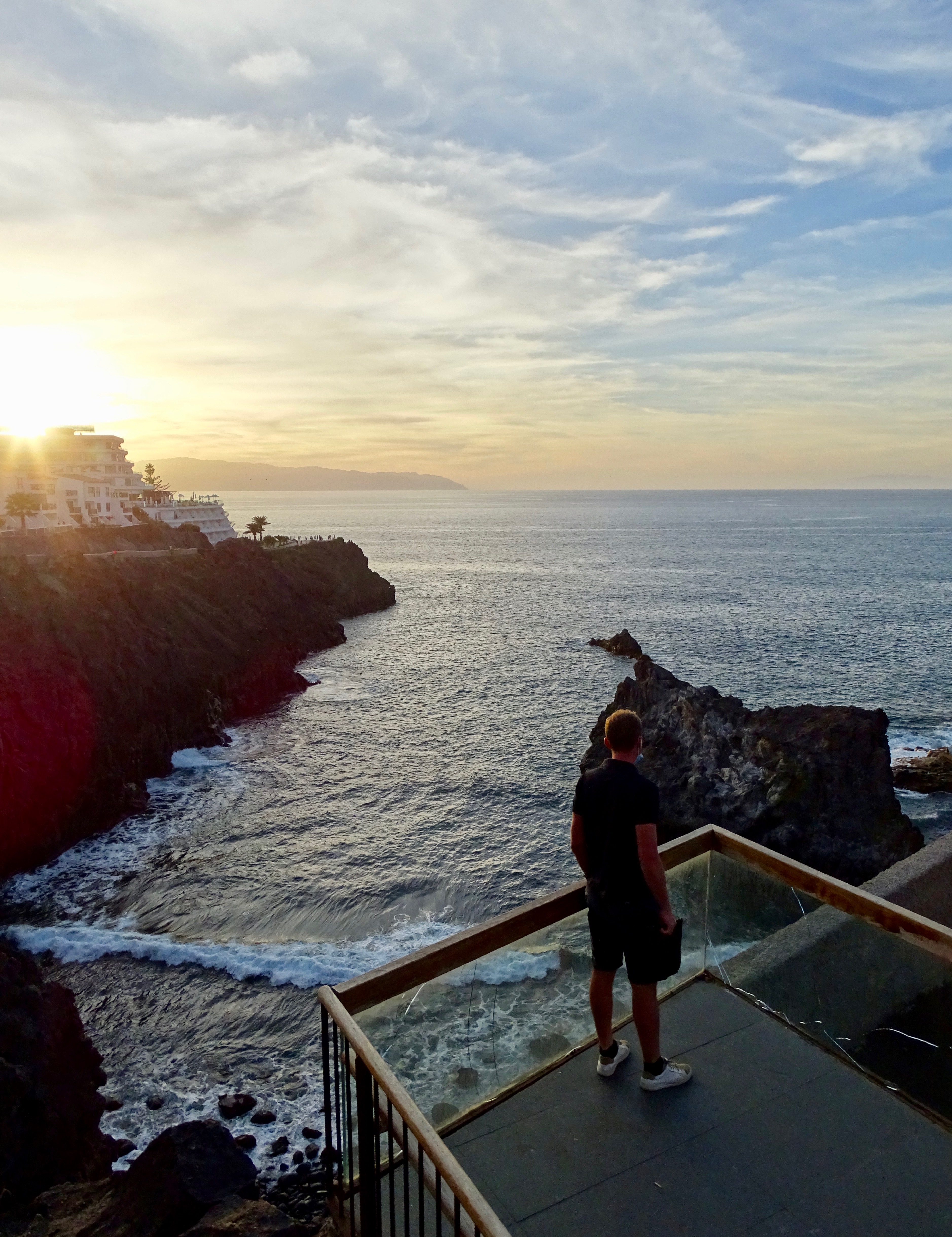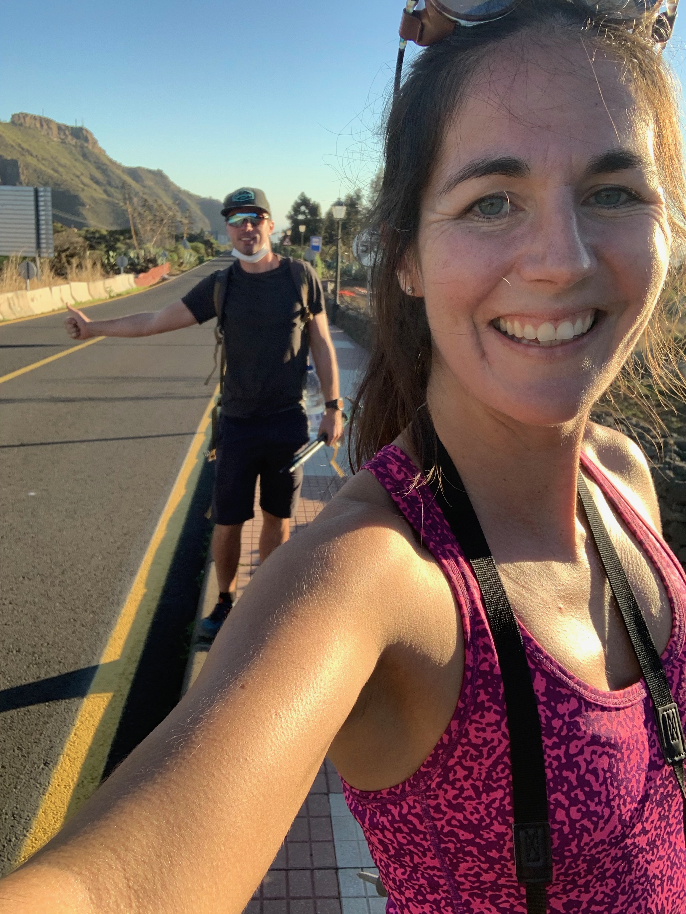 Initialement nous voulions prendre le bus jusqu’à la Costa Adeje puis un autre bus. Mais ce jour-là en Espagne, c’était les rois mages, un jour férié, du coup quasiment pas de bus. Oh oh que c’était dommage, il fallait faire du stop. Énorme nous avons été pris par le même couple que la veille (les Autrichiens), auxquels j’avais conseillé d’aller à la piscine. Ils ont beaucoup aimé (comme quoi je suis une influenceuse haha)