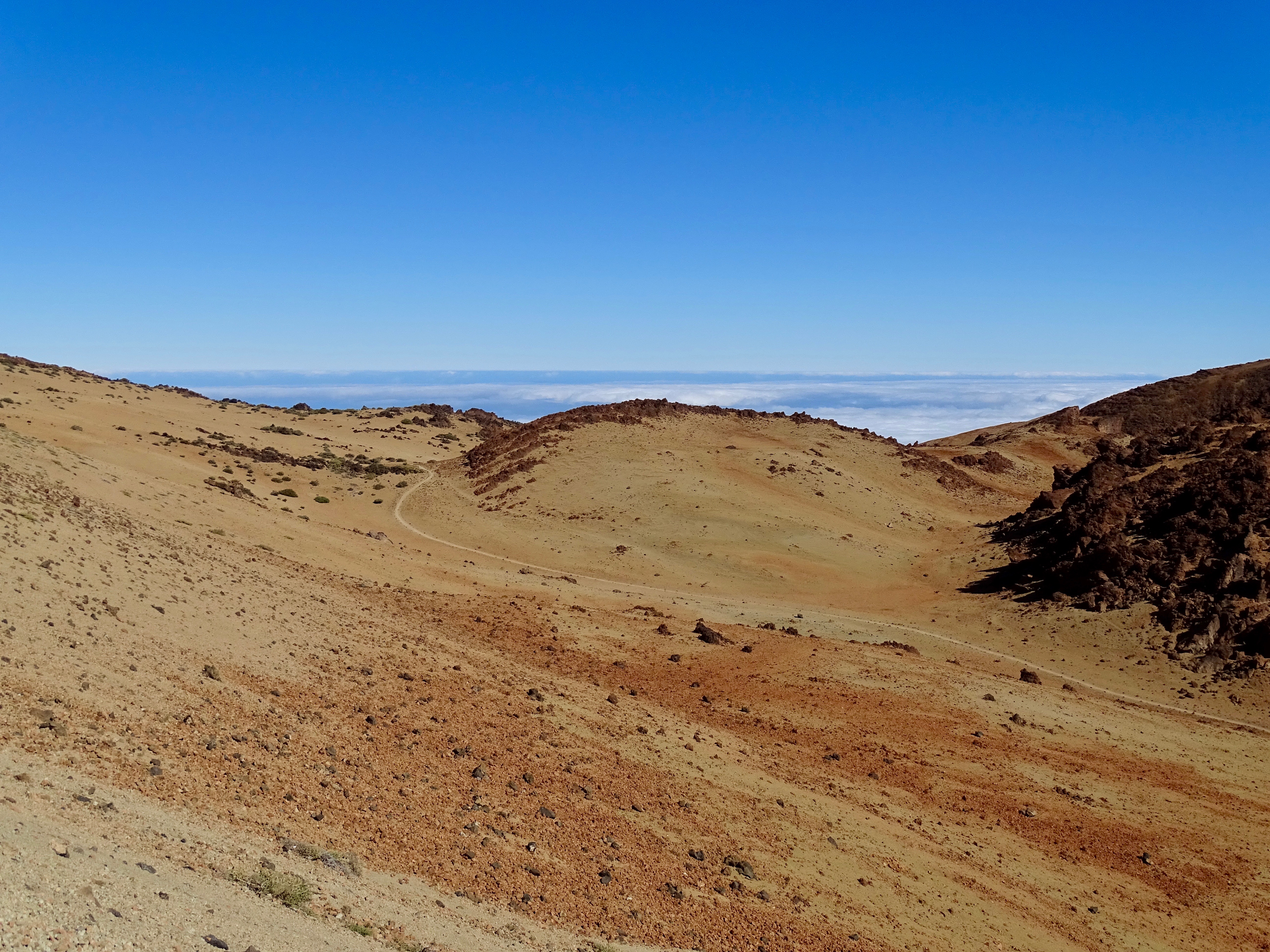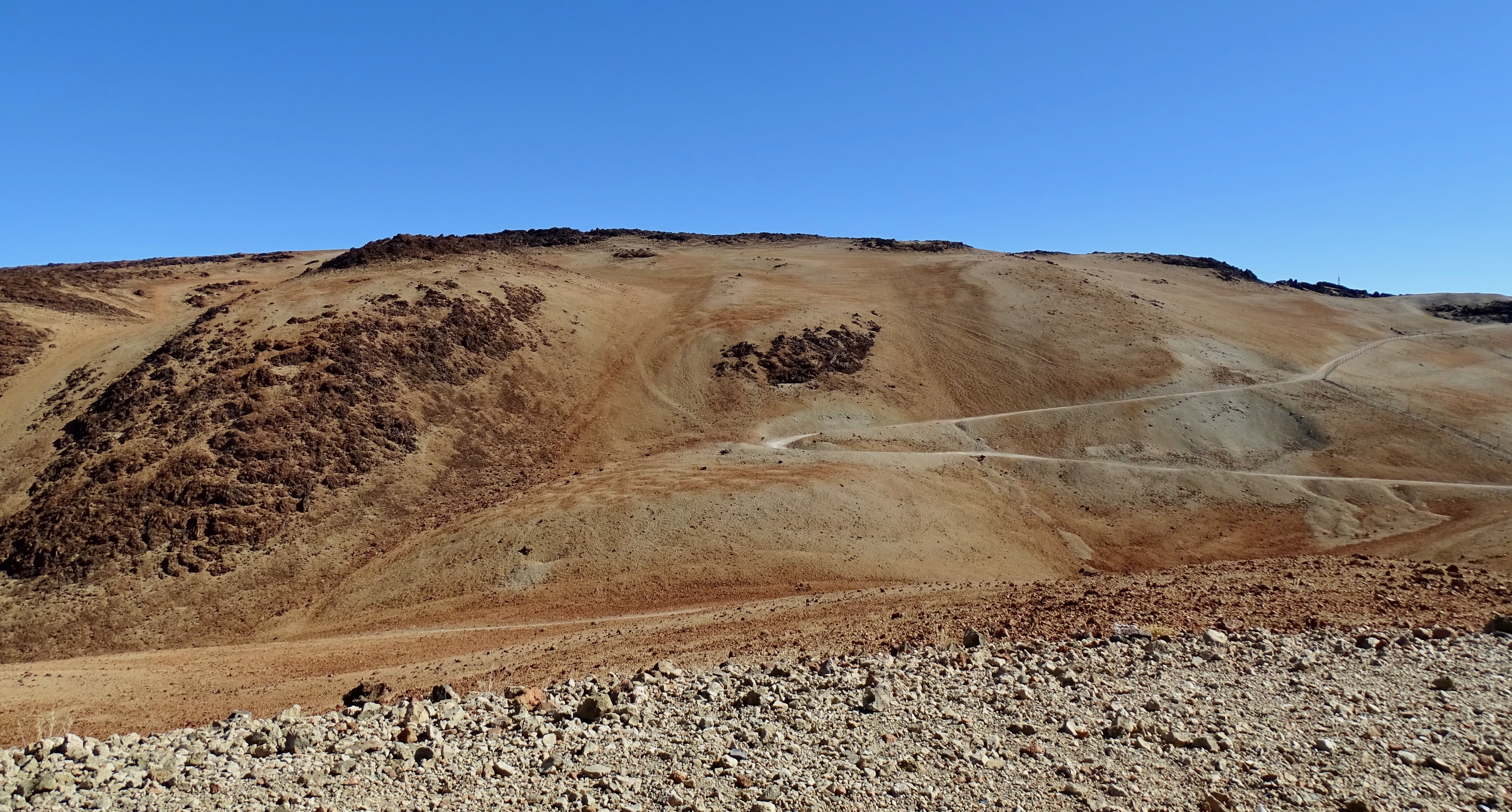 Descente, mais pas tout en bas car il y a un téléphérique qui mène les touristes quasiment en haut. D’ailleurs, nous avons vu des gens pas du tout équipés, en baskets de ville etc ! Je ne comprends pas trop, car un sommet ça se mérite à la sueur et à la force de ses petites jambes ! Enfin, cela permet aux gens de montrer facilement (et rapidement) au Teide (et nous de descendre sans se fatiguer, bon c’est aussi, parce qu’on ne voulait pas se retrouver de nuit dans le Parc à faire du stop !)