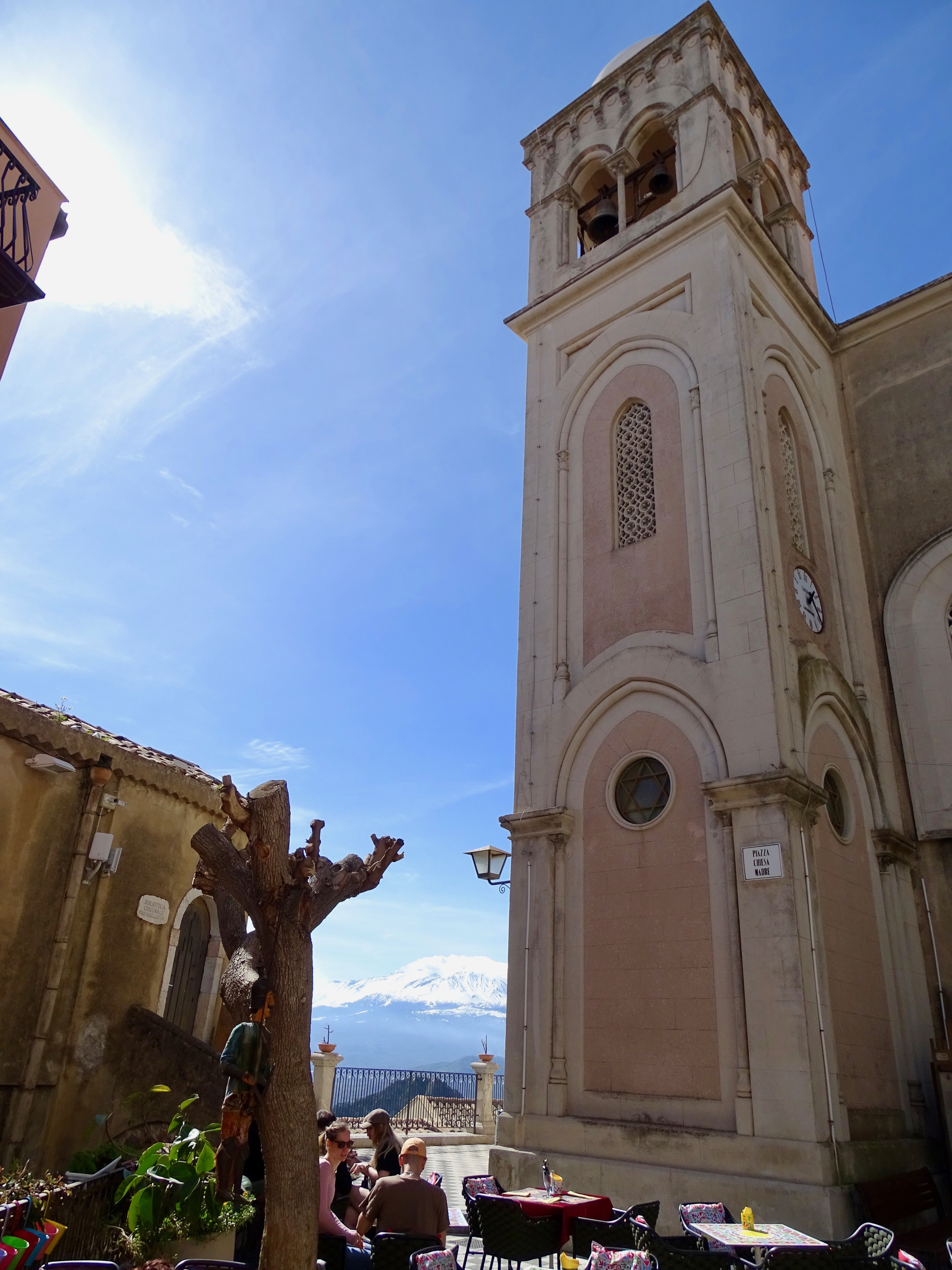 Village encore plus haut, avec l’Etna tout proche, adorable avec toutes ses petites rues où l’on se perd, la place de l’église avec vue directe sur l’Etna et les ruines du château, grandiose…