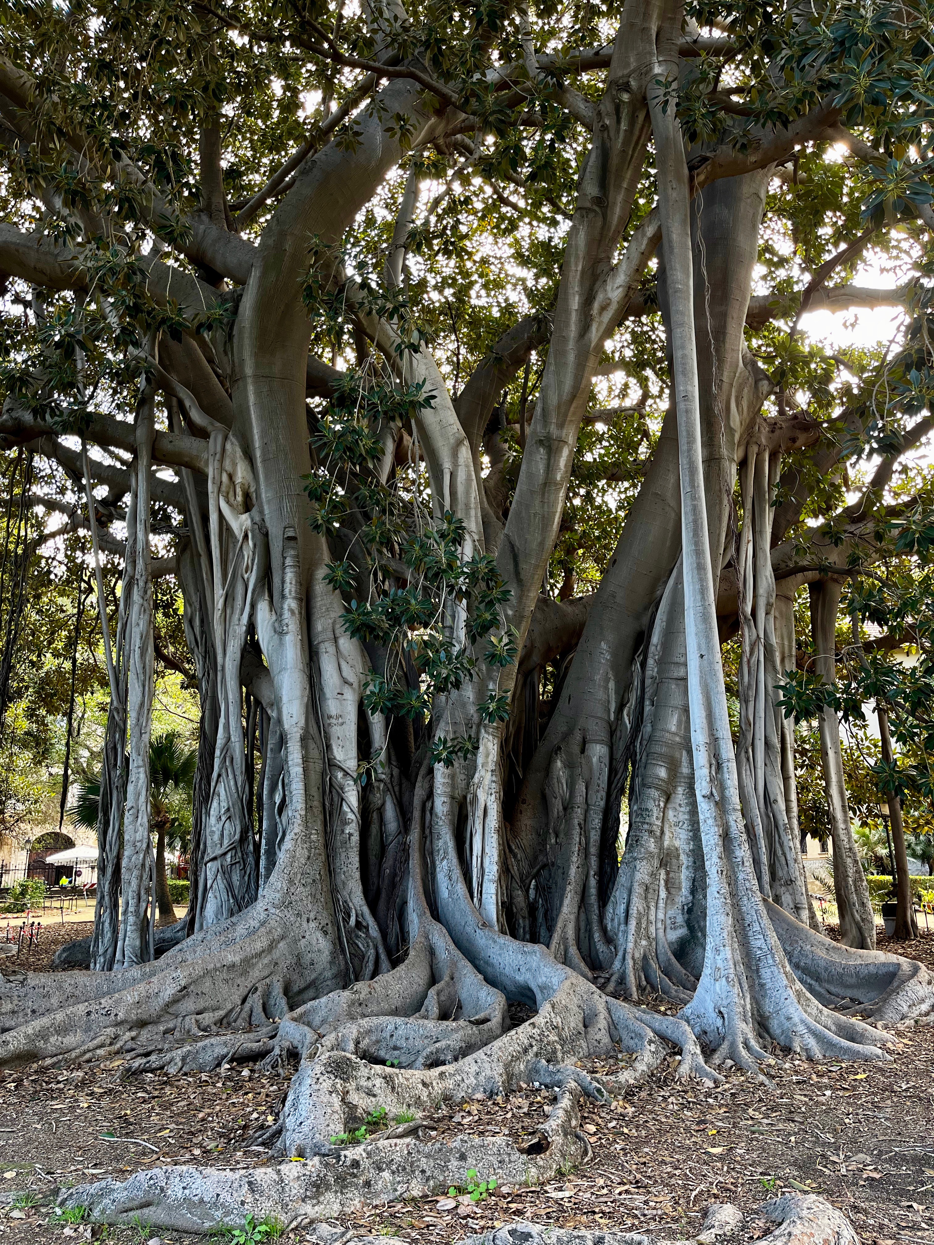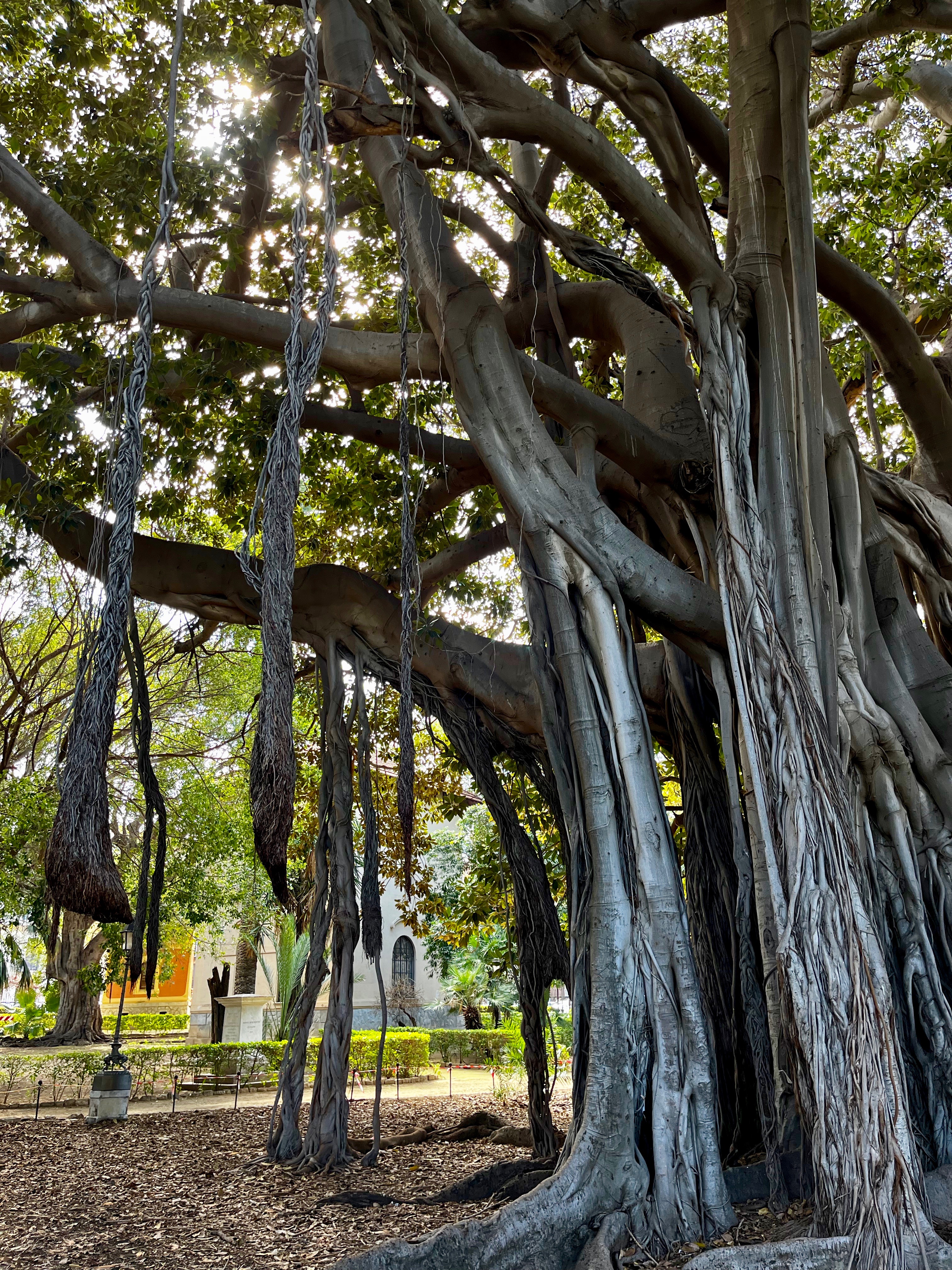 Descente d’une longue rue piétonne pour atteindre la piazza Quattro Canti + Fontana de Pretoria + visite de l’église della Martorana, trop belle et encore des petites ruelles, comme j’aime, pour tomber sur le giardino Garibaldi, avec 3 arbres incroyables… j’adore les arbres et ceux-ci étaient sublimes, ils m’ont émerveillés : des ficus.