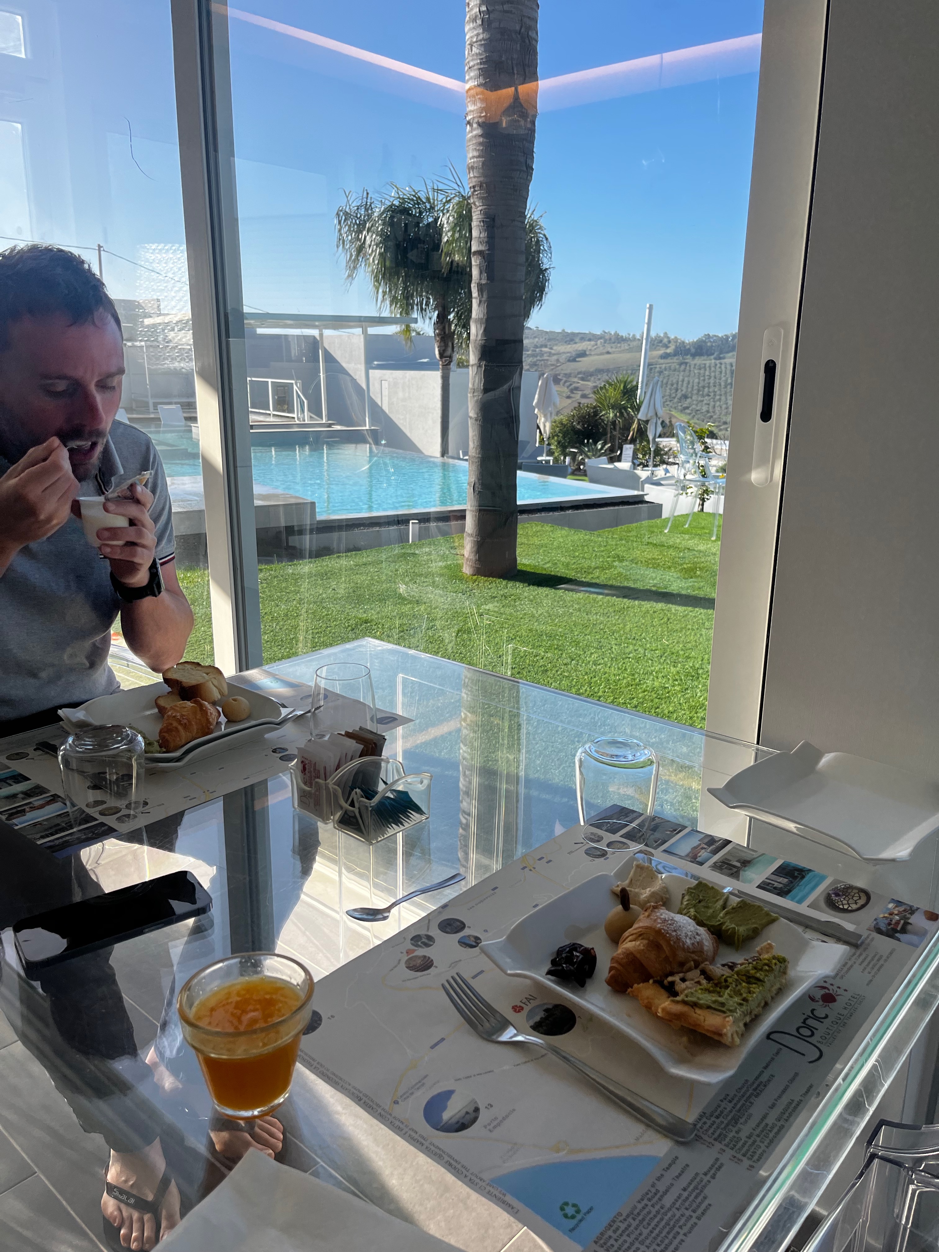 Nous sommes arrivés de nuit (19h) à l’hôtel Doric Boutique Hôtel, proche d’Agrigente. Une voiturette est venue nous chercher, comme au golf haha. Chambre top avec terrasse.
