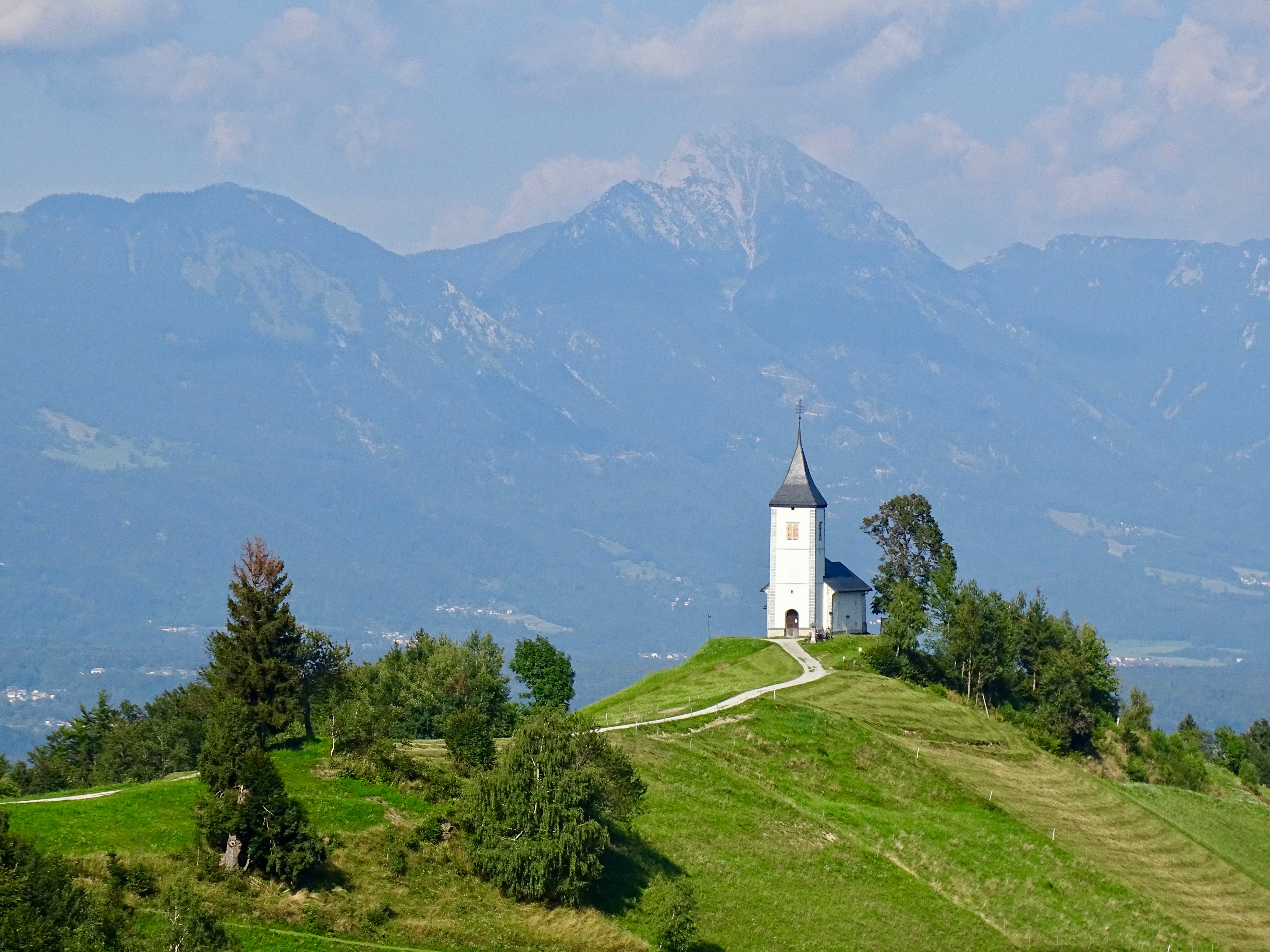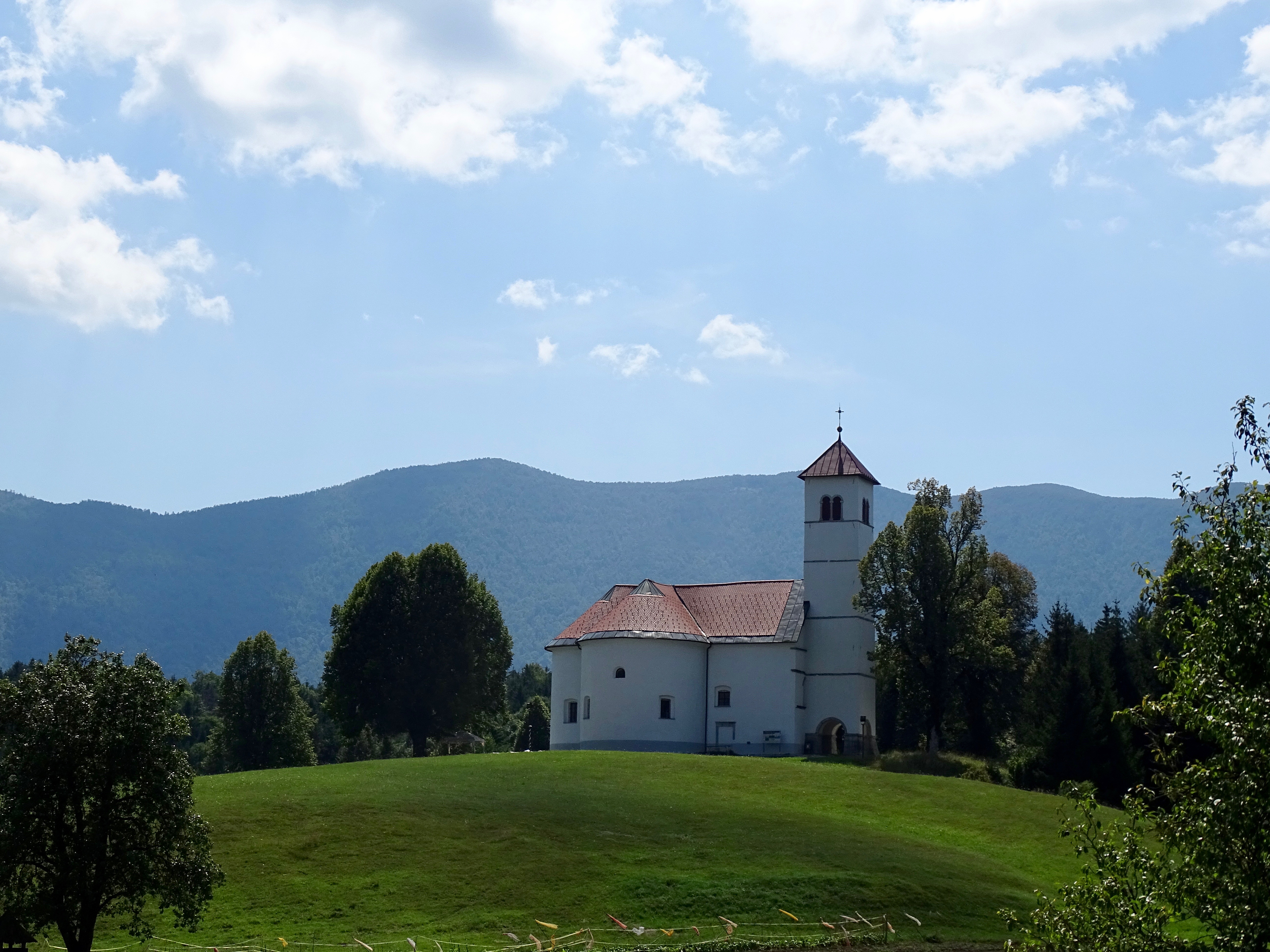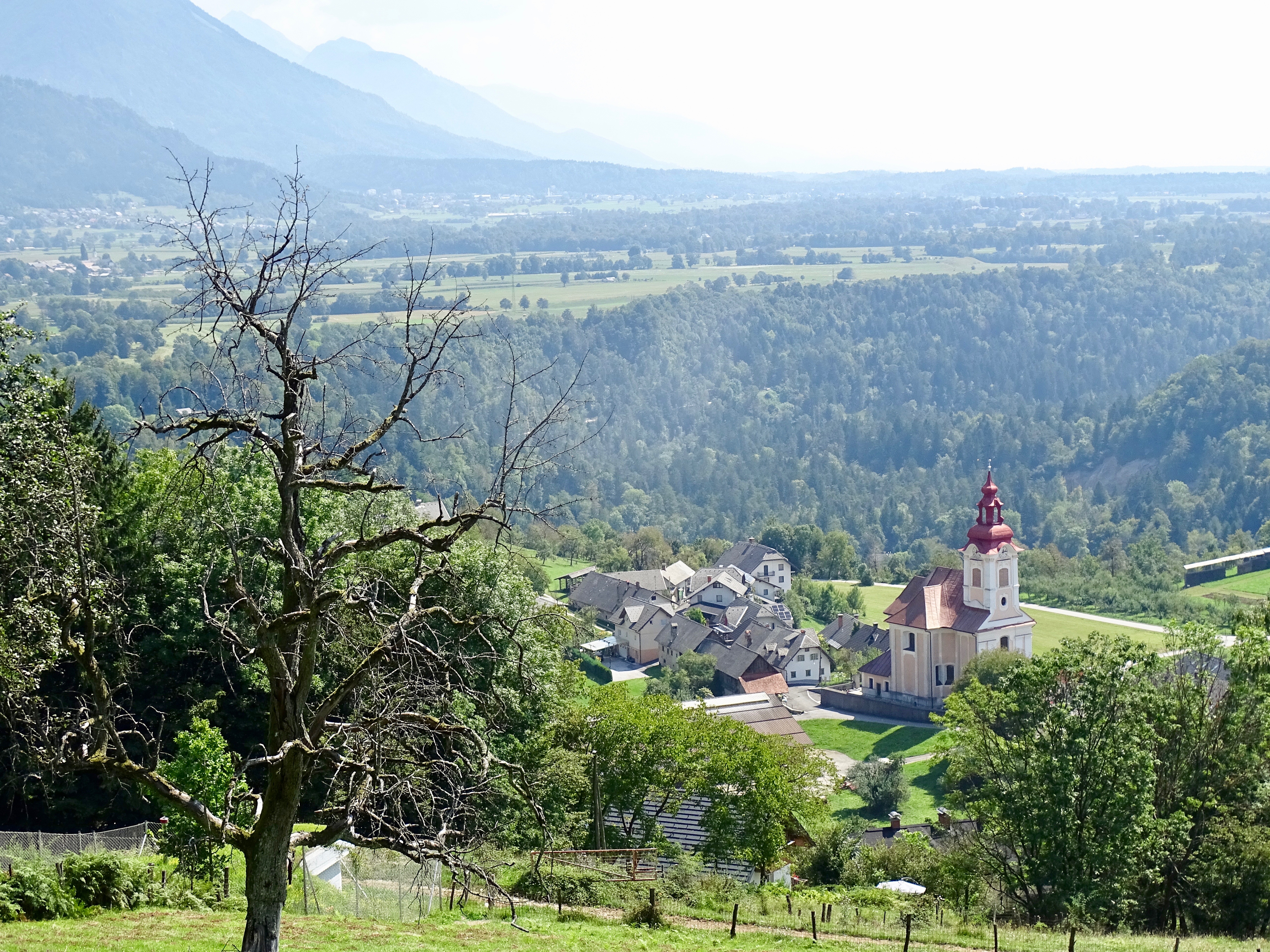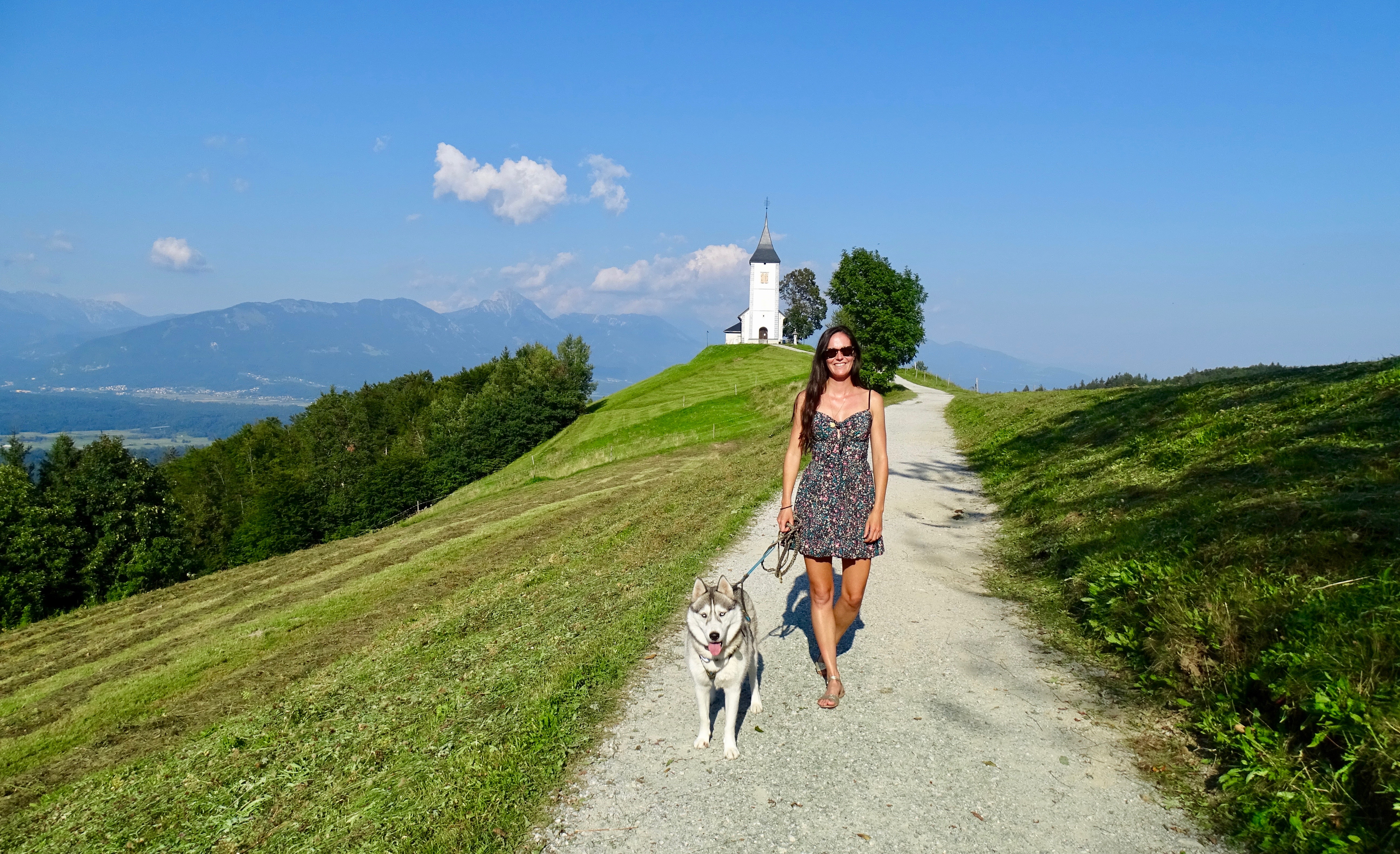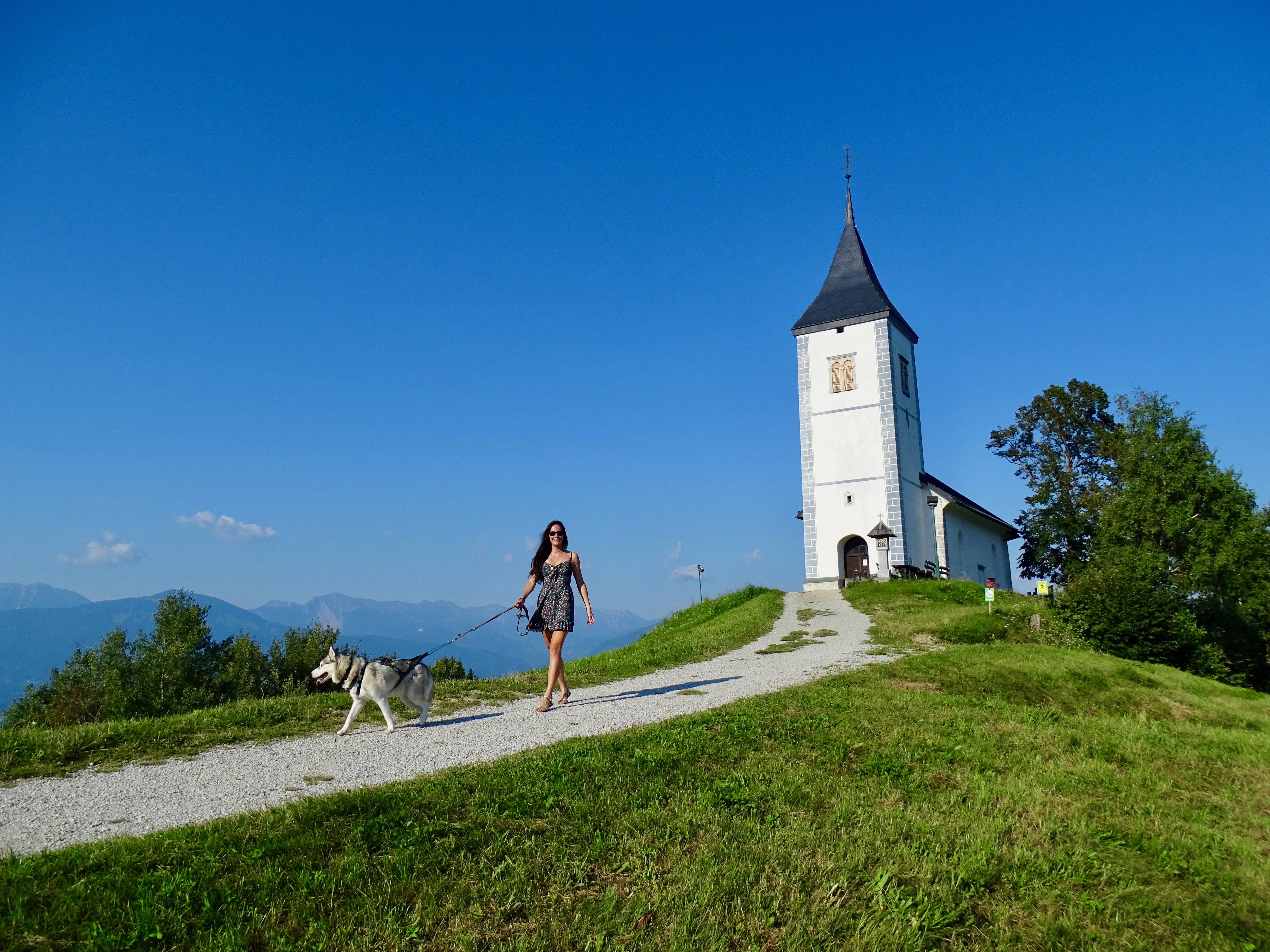 Stop à Jamnik où on accèdait par une route magnifique pour admirer une très belle église suspendue au milieu de nulle part, avec les montagnes au loin. Nous étions quasiment seuls avec les brebis ! Roxie a donc apprécié sa balade !