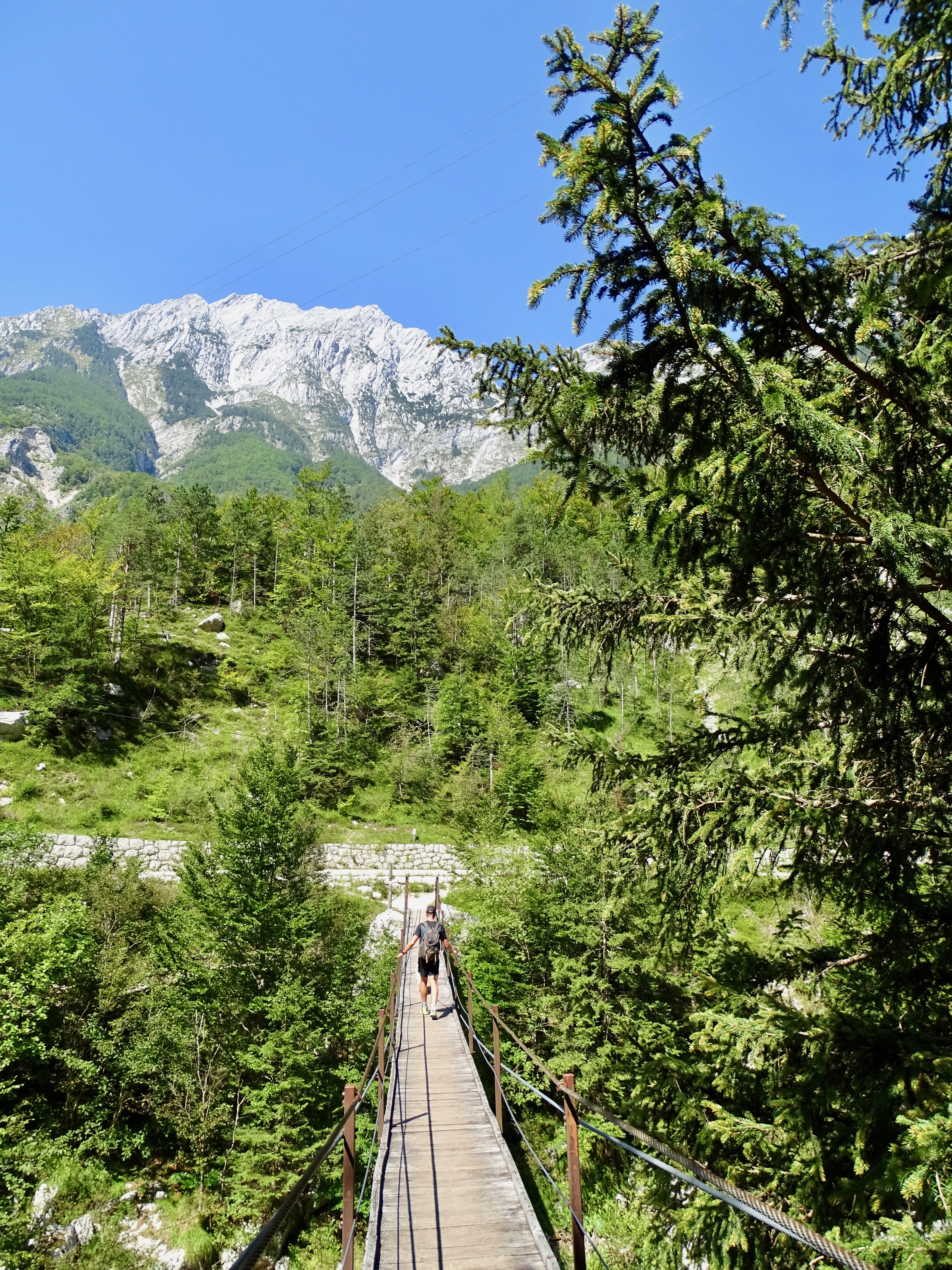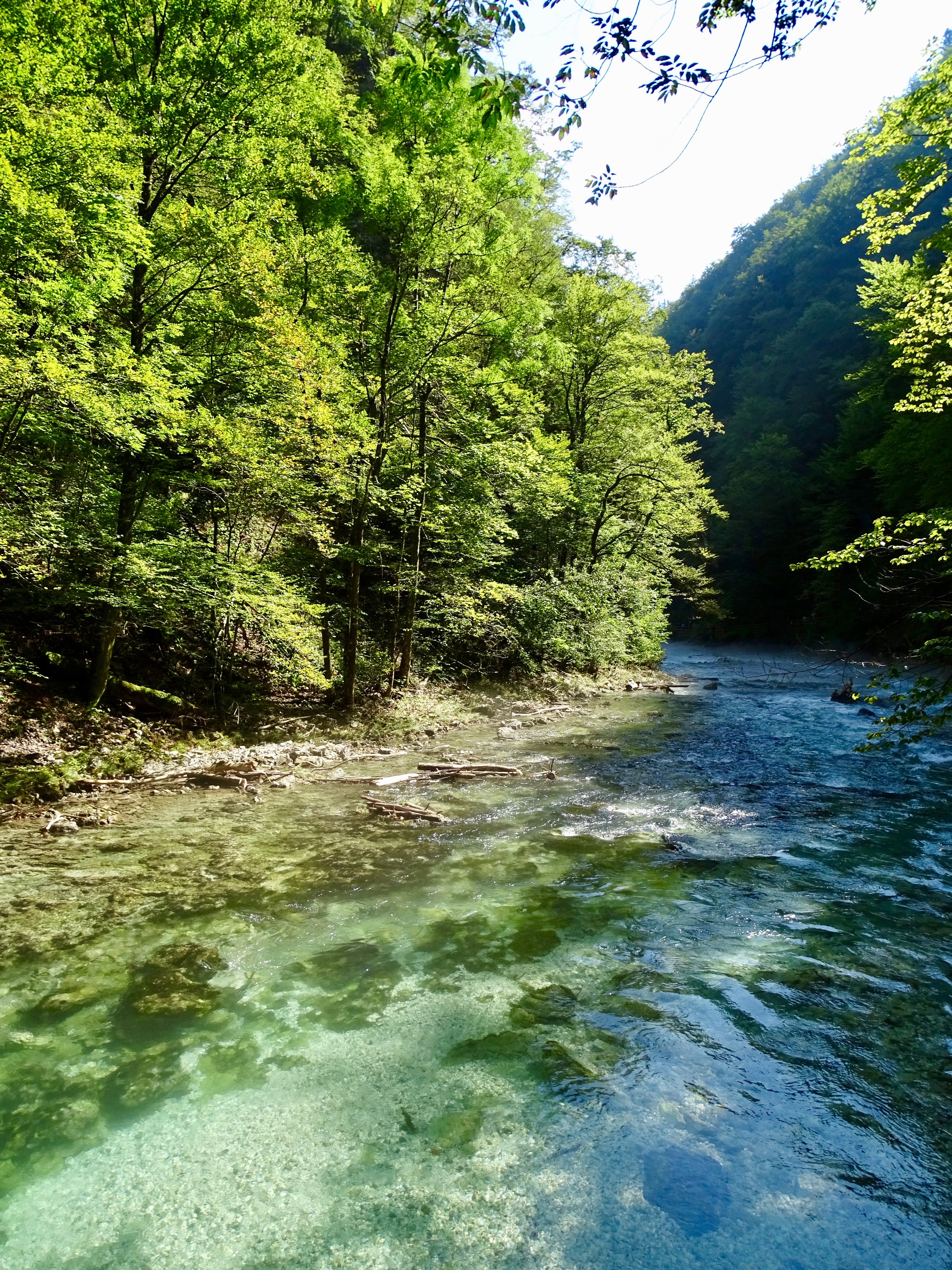 A Trenta, nous avons débuté le trail de la Soca, d’environ 20 km (nous en avons fait 15) qui longe la rivière de la Soca entre Trenta et Bovec, avec passage de passerelles, gorges, notamment Velika Korita.