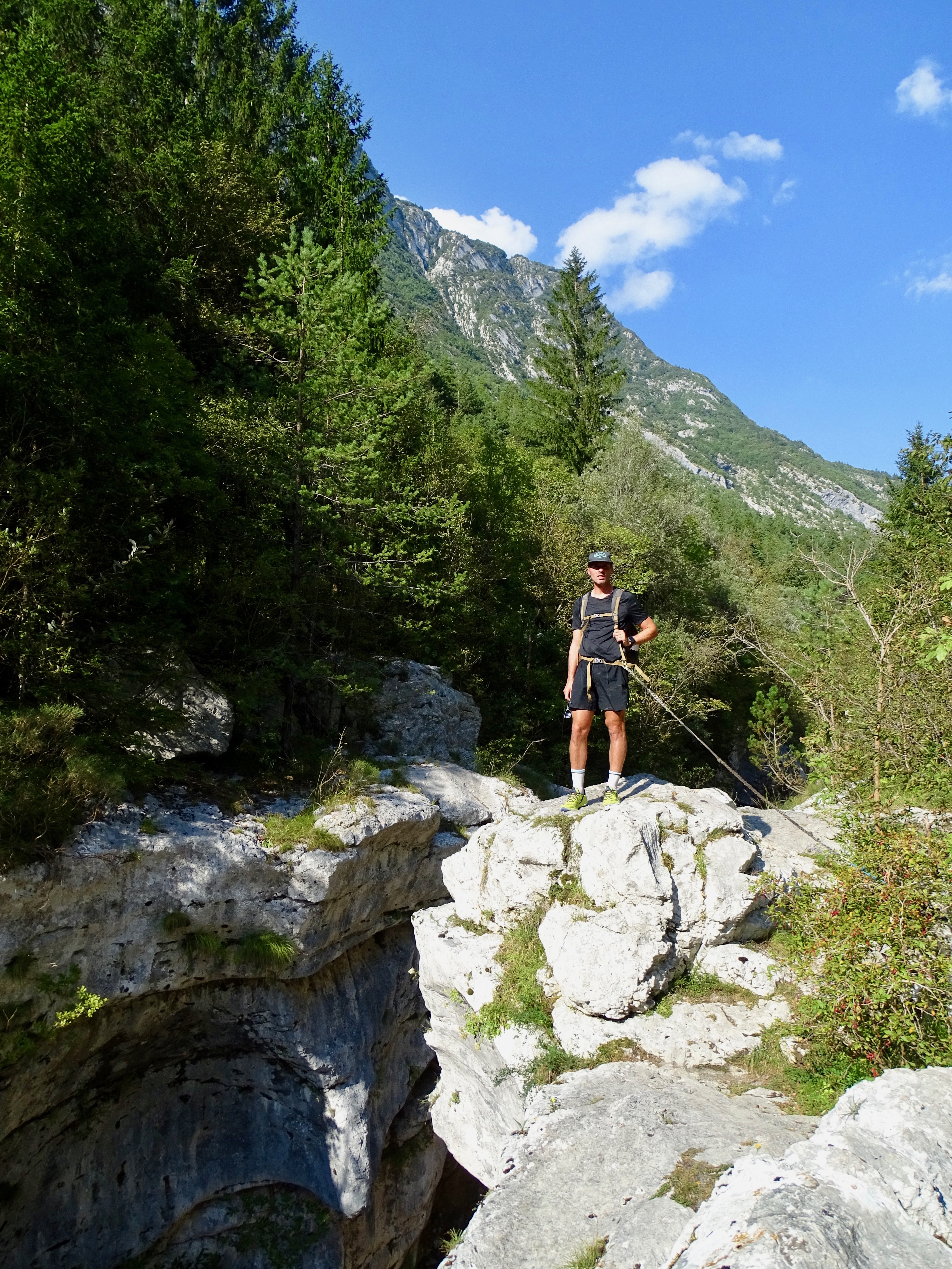 Vers Soca, au niveau du pont, il y a une petite gorge et nous nous sommes posés pour nous baigner (enfin moi et une tentative pour Guilhem… tentative ratée…).