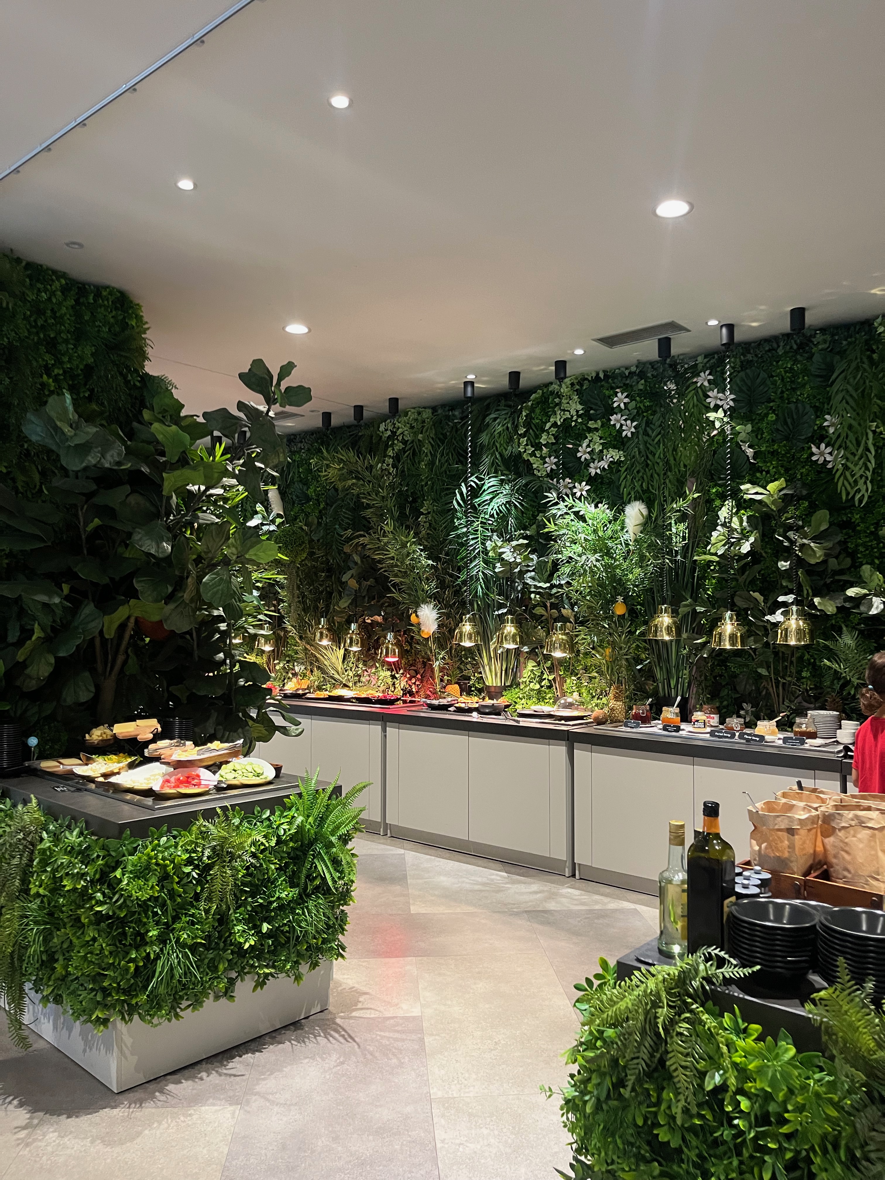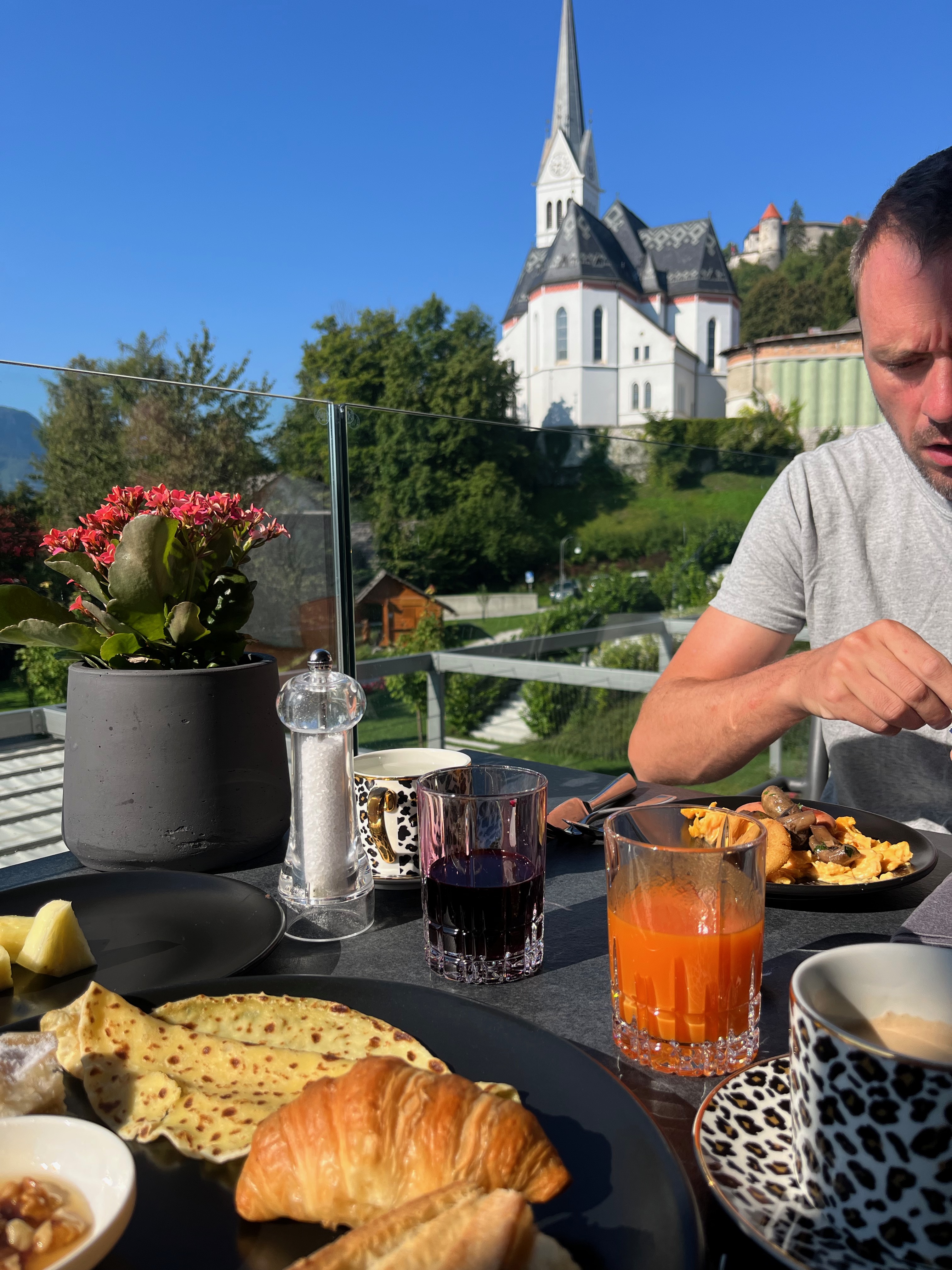 Le petit dej de l’hôtel était top top… déjà la déco est incroyable, on se croyait dans une jungle ! On a déjeuné en terrasse avec une vue magnifique sur l’église et le lac qu’on apercevait derrière les arbres. Mention spéciale pour les tasses au design léopard et les excellentes crêpes (18/20 pour ce petit dej).