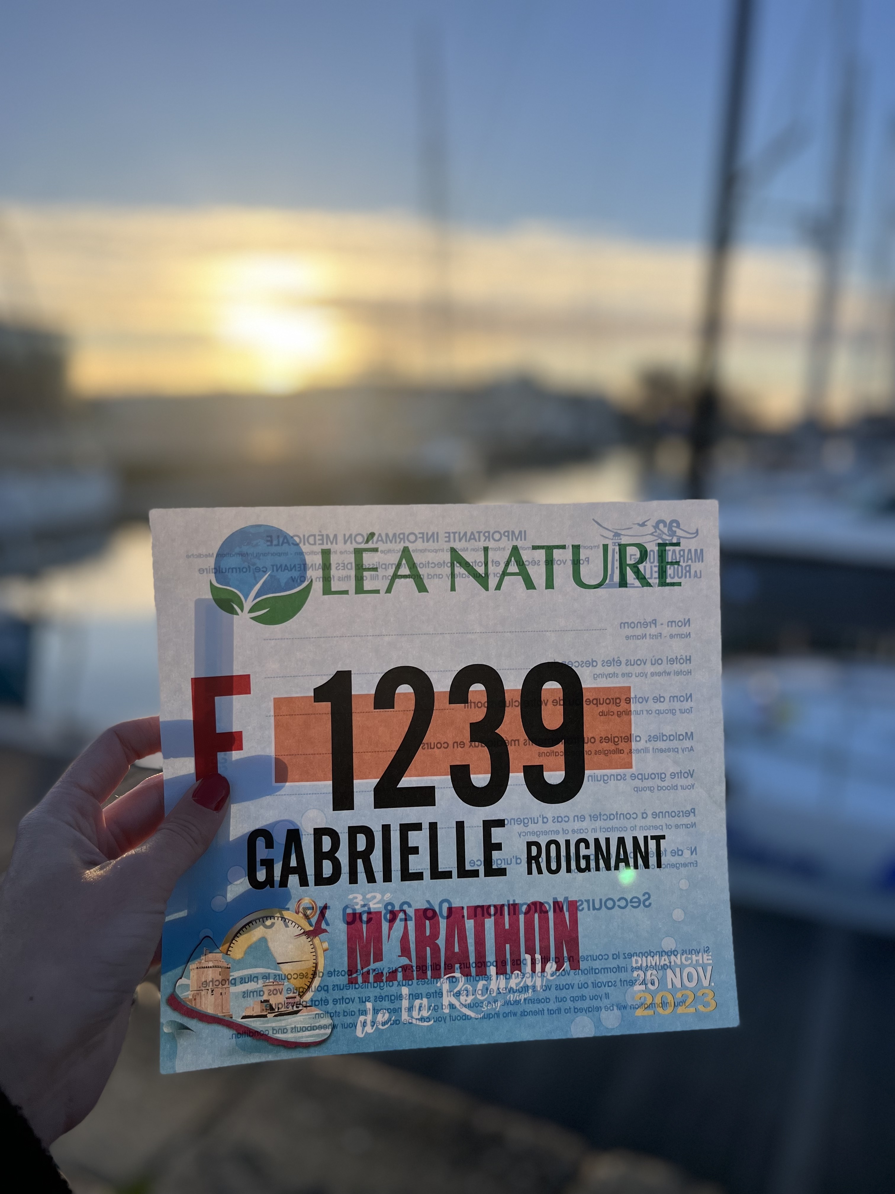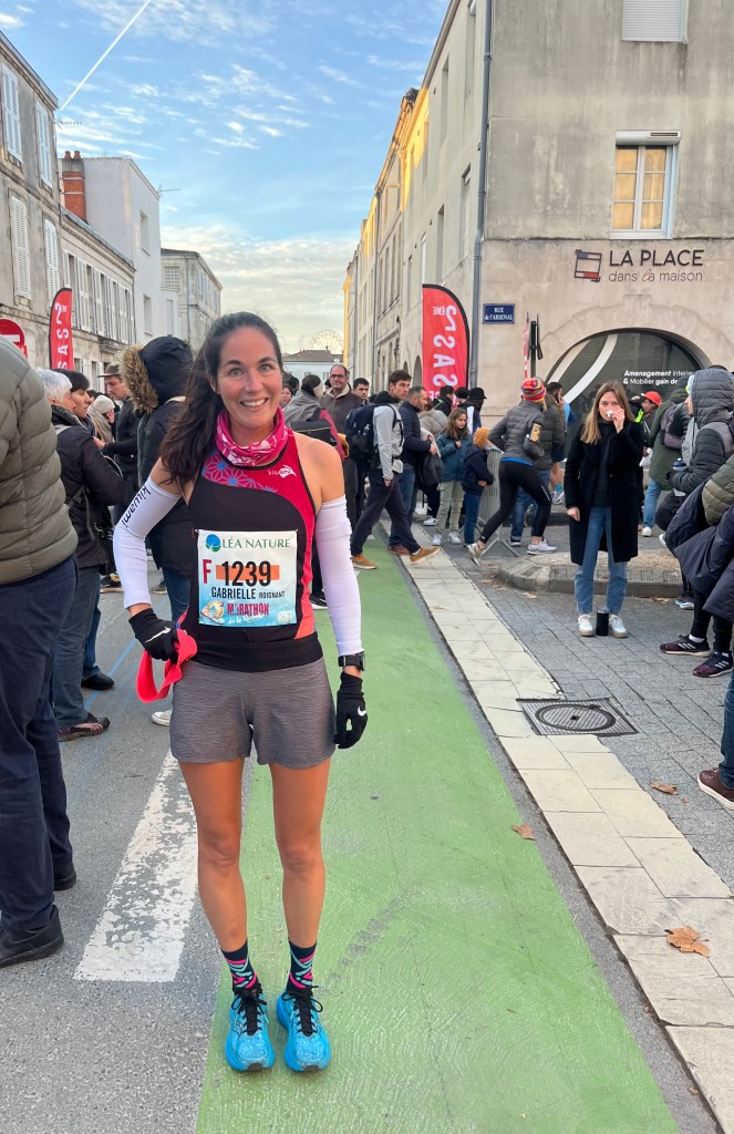 Mon coach m’a dit de prendre un anti inflammatoire. Ma belle mère m’a donc fait une ordonnance et le mercredi j’ai pris le médoc. Sauf que je réagis souvent mal aux médicaments du coup j’ai transpiré toute la nuit et j’ai eu des énormes douleurs à l’estomac !! Ces douleurs au bide ont duré jusqu’à la veille de la course, alors que j’ai arrêté directement de prendre le médicament !! Du coup j’étais un peu inquiète… Si cela ne suffisait pas, en me réveillant le samedi matin j’avais des plaques rouges et des boutons sur tout le corps. Heureusement je savais que ce n’était pas grave car j’avais eu ce même phénomène avant mon IRONMAN, cela s’appelle le stress et le psychologique qui joue sur mon corps. Mais en allant chercher mon dossard, en voyant toute l’émulation, j’étais tellement heureuse d’être là et de me lancer une nouvelle fois sur un marathon. D’un coup je me suis sentie mieux. Je pense sincèrement que le psychologique m’a un peu impactée cette semaine d’avant course, pour ne pas dire beaucoup.