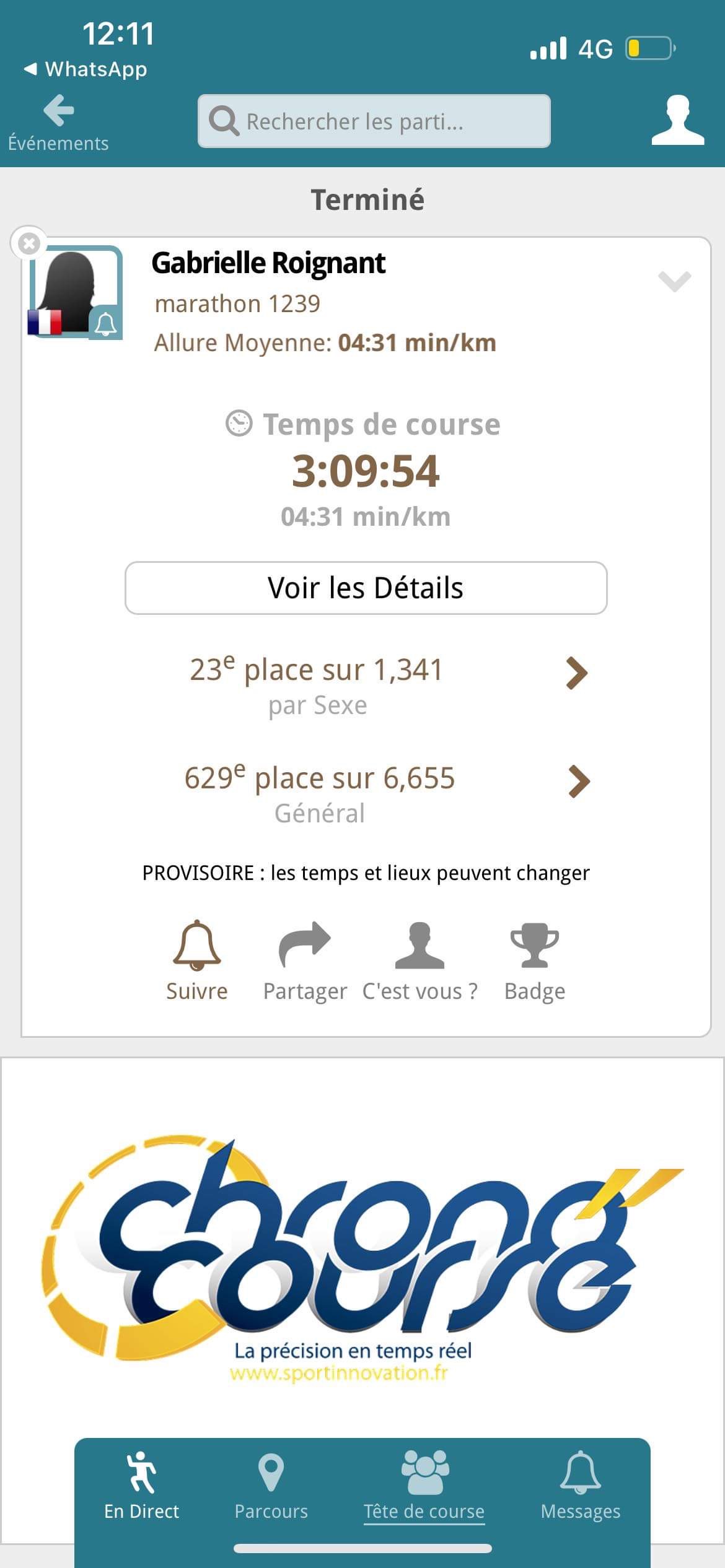 J’ai attendu Laurent, il est arrivé peu de temps après moi, trop contente pour lui. C’était son premier. Puis Jules et Pierre-Yves ont fait le 3h12, contrat rempli comme checké pendant la course. Finalement nous avions formé un super groupe. Pierre-Yves avait raison, il m’a dit tu vois je savais que tu allais tous nous fumer. Et il m’a fait un compliment : «je pense d’ailleurs que tu peux encore aller très loin sur marathon vu la facilité dans laquelle tu étais ». Alors à quand le prochain ?