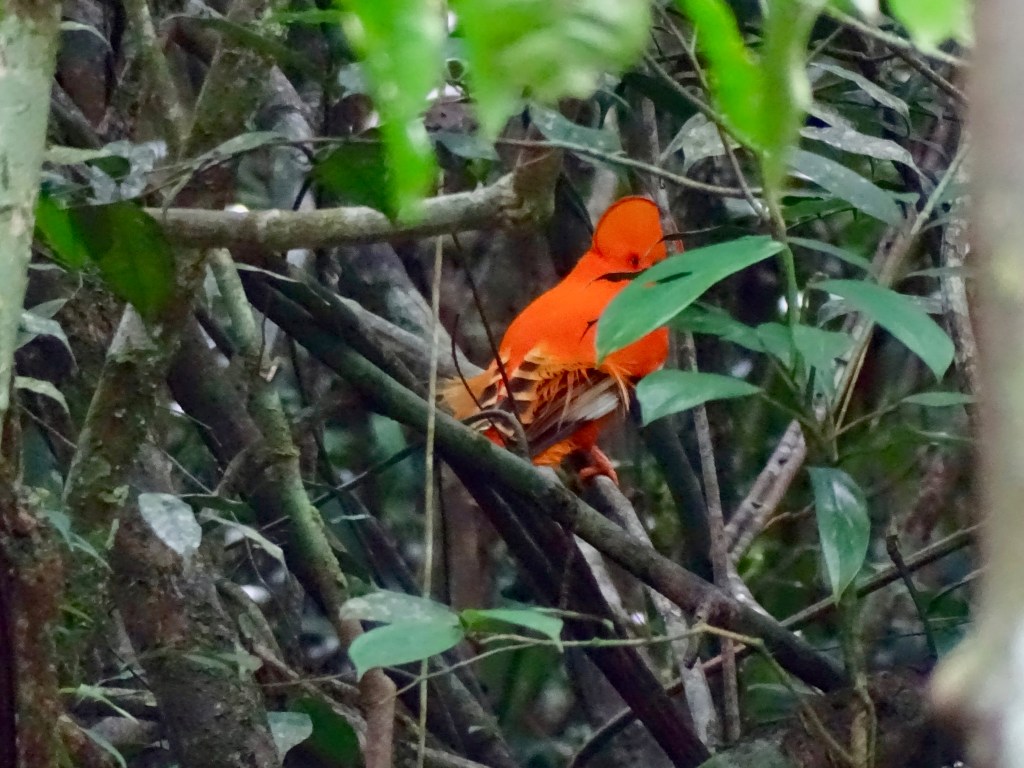 Direction le sentier Roche Coq, on a un peu galéré à trouver car pas de panneau et pas de réseau. Finalement, nous sommes un peu revenus sur nos pas, on n’était pas à cela près, sur la «dirty road» ! Ce sentier est très très rapide, en tout 1,5km. Le but de cette rando est d’observer les oiseaux Roche Coq. Nous avons donc passé pas mal de temps à l’observatoire, au niveau d’une grotte, pour les observer. C’était magique. Les mâles sont orange et les femelles marron, moins belles et reconnaissables.