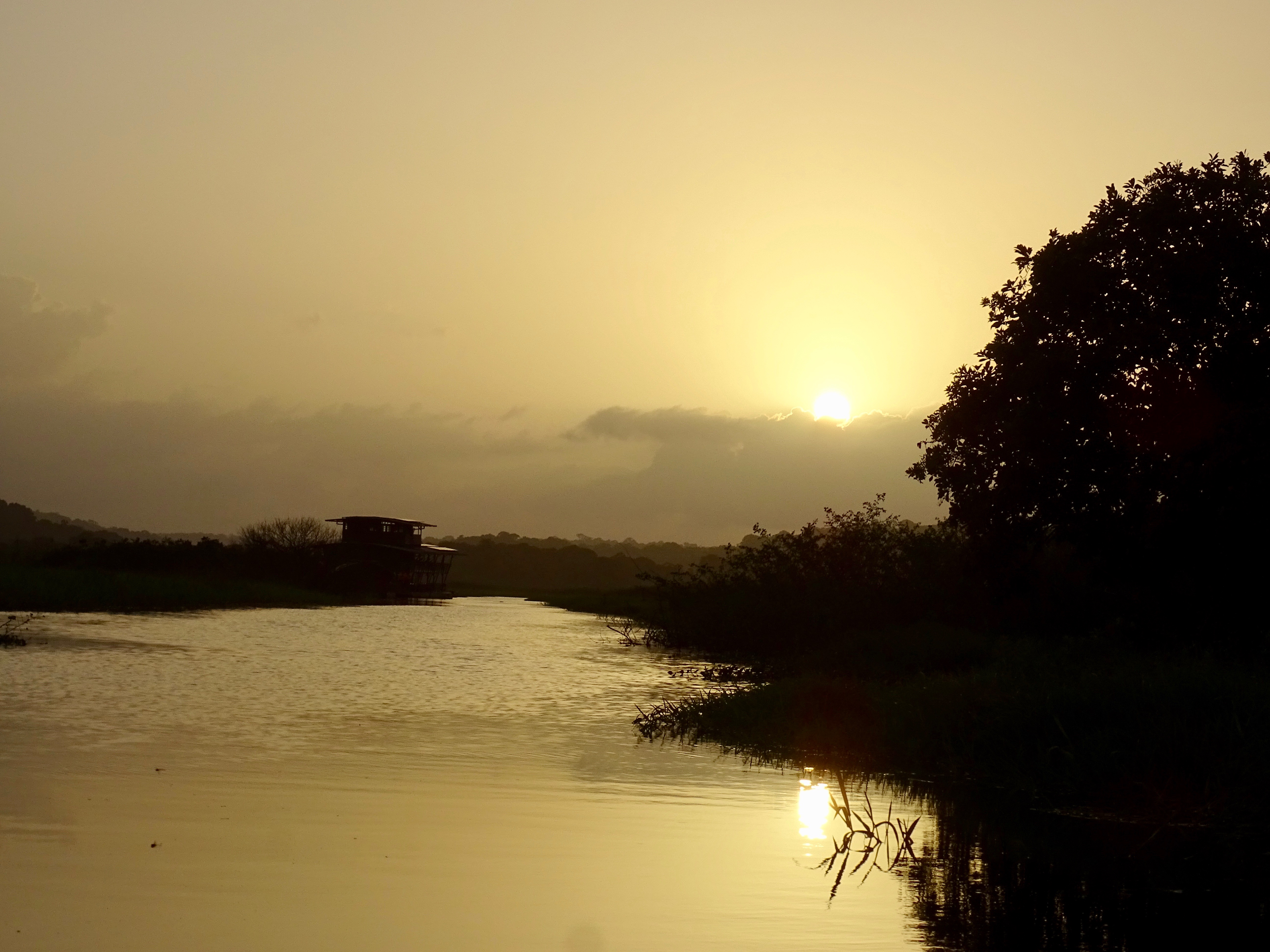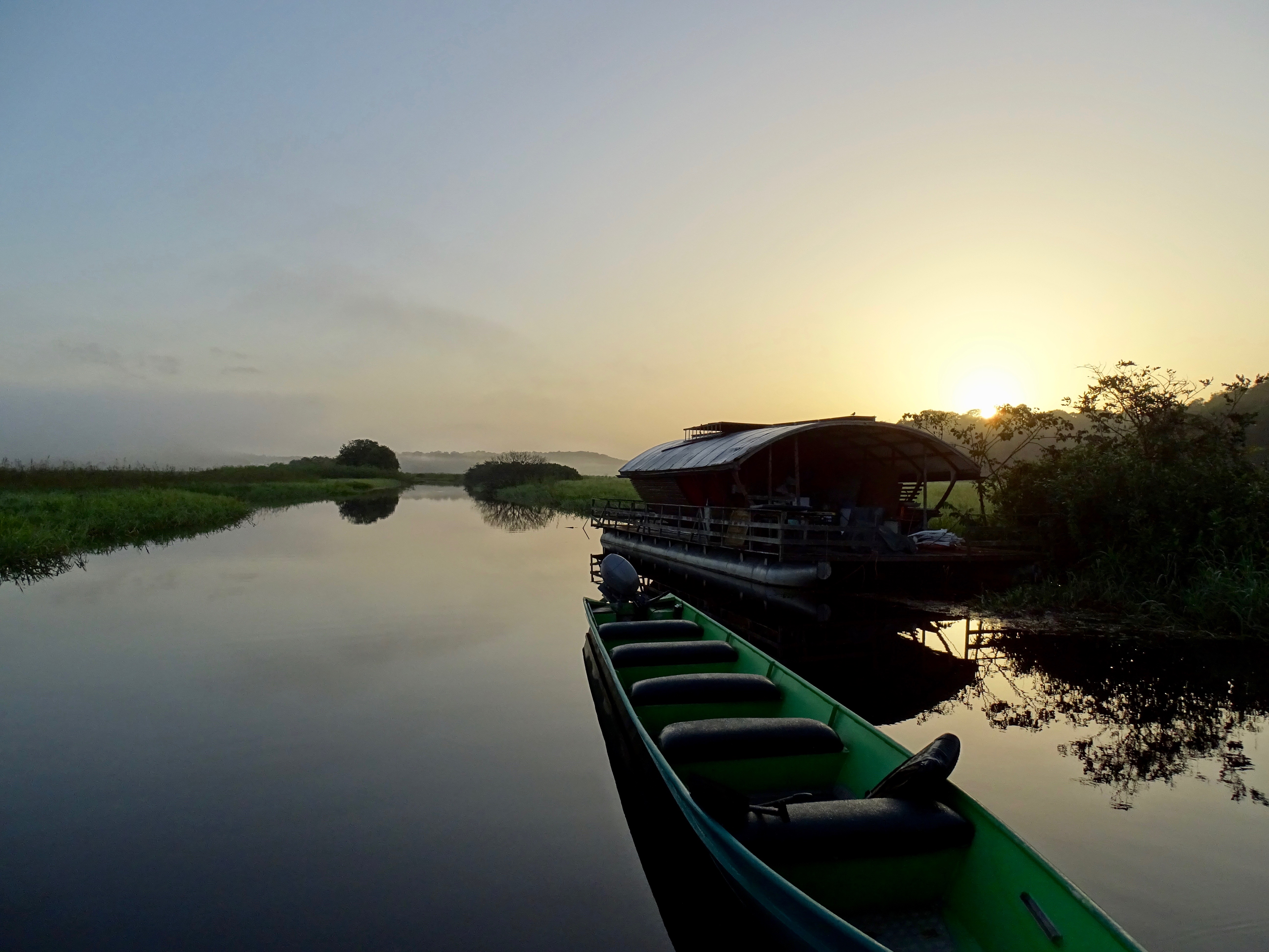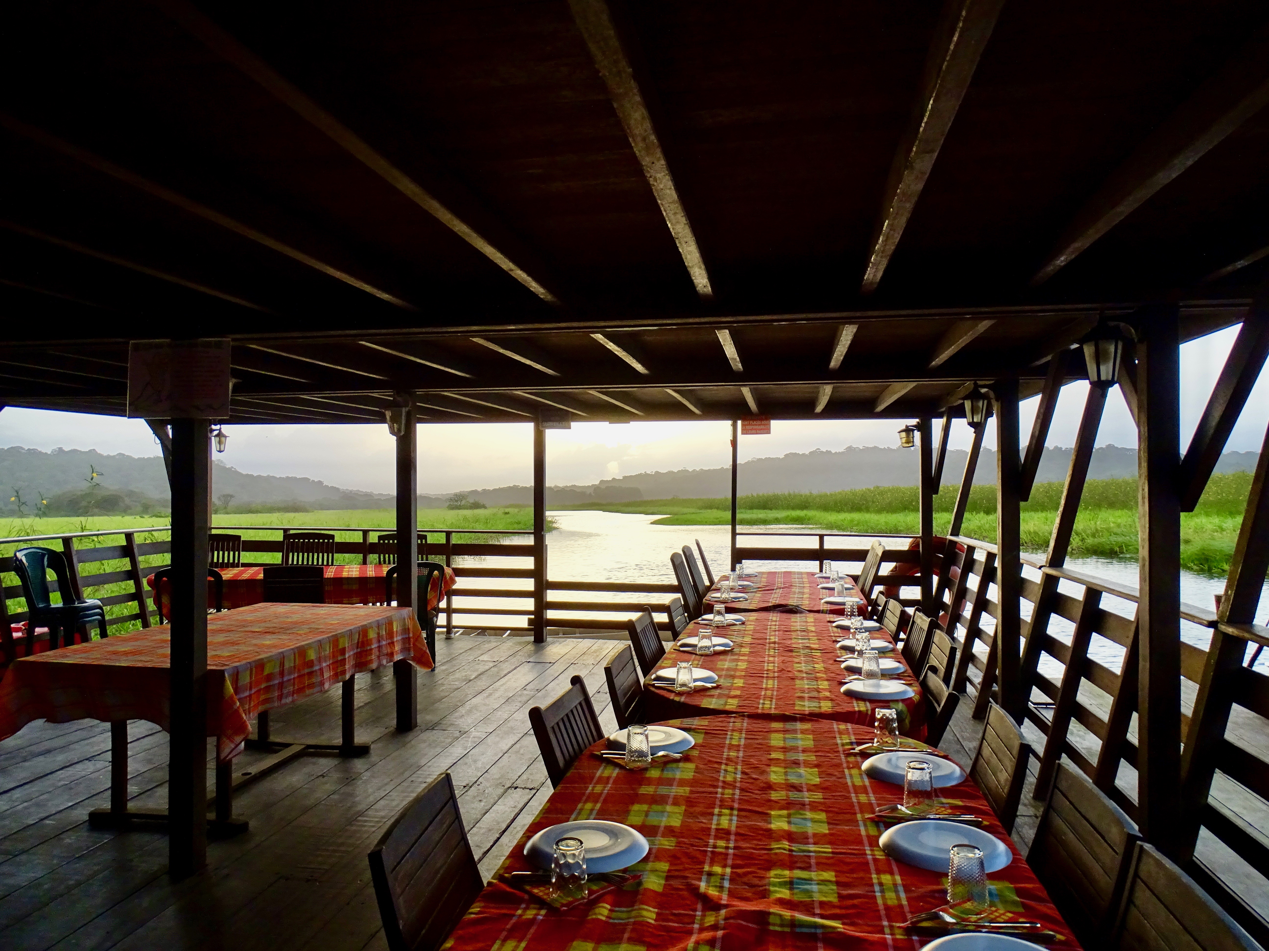 Arrivés à l’écolodge flottant sur les marais, nous avons découvert notre belle chambre ouverte sur les marais. Apéro face au coucher du soleil, sublime. Puis un très bon dîner, un gratin de planteur notamment. On mangeait vraiment bien en Guyane !