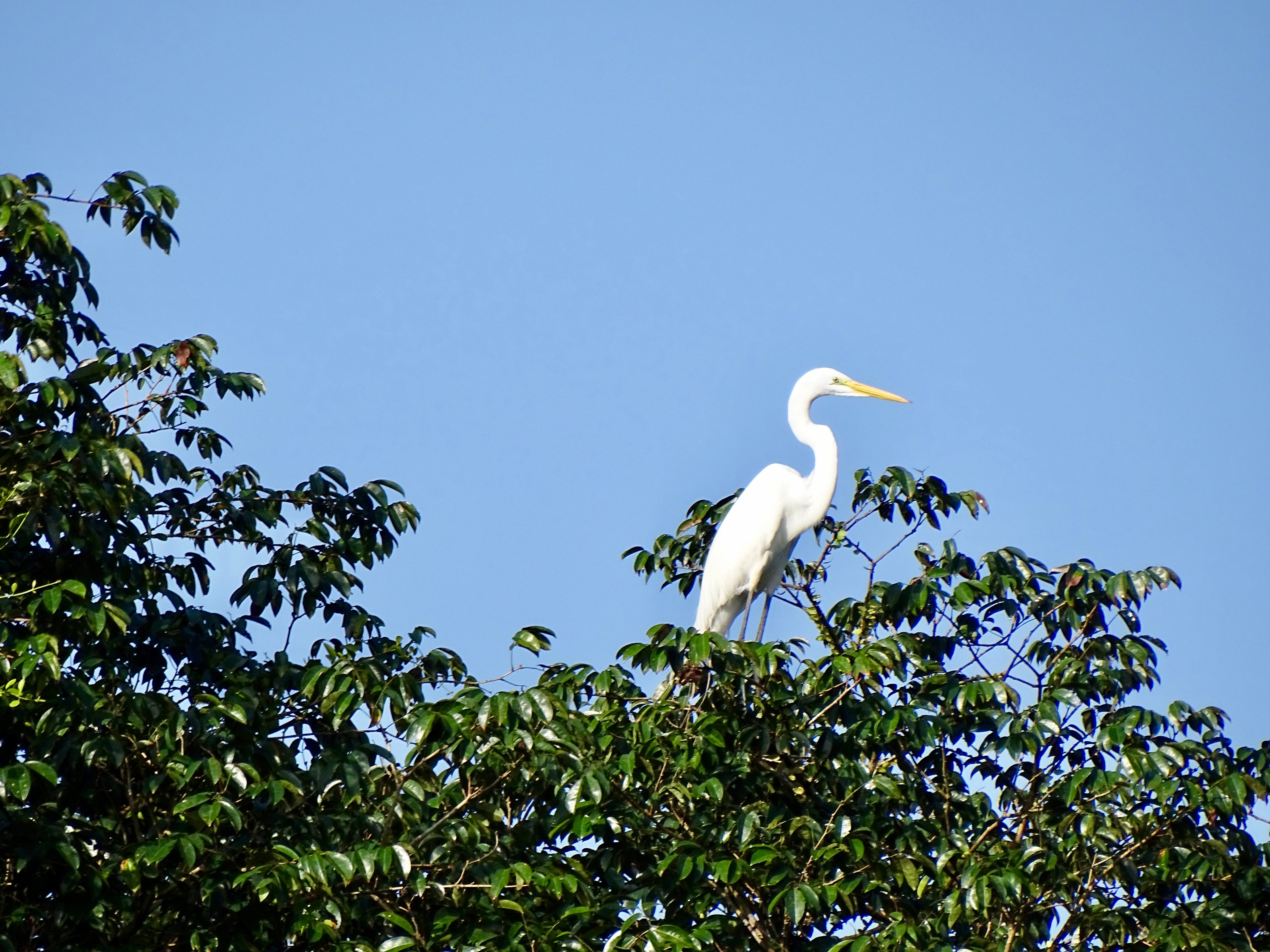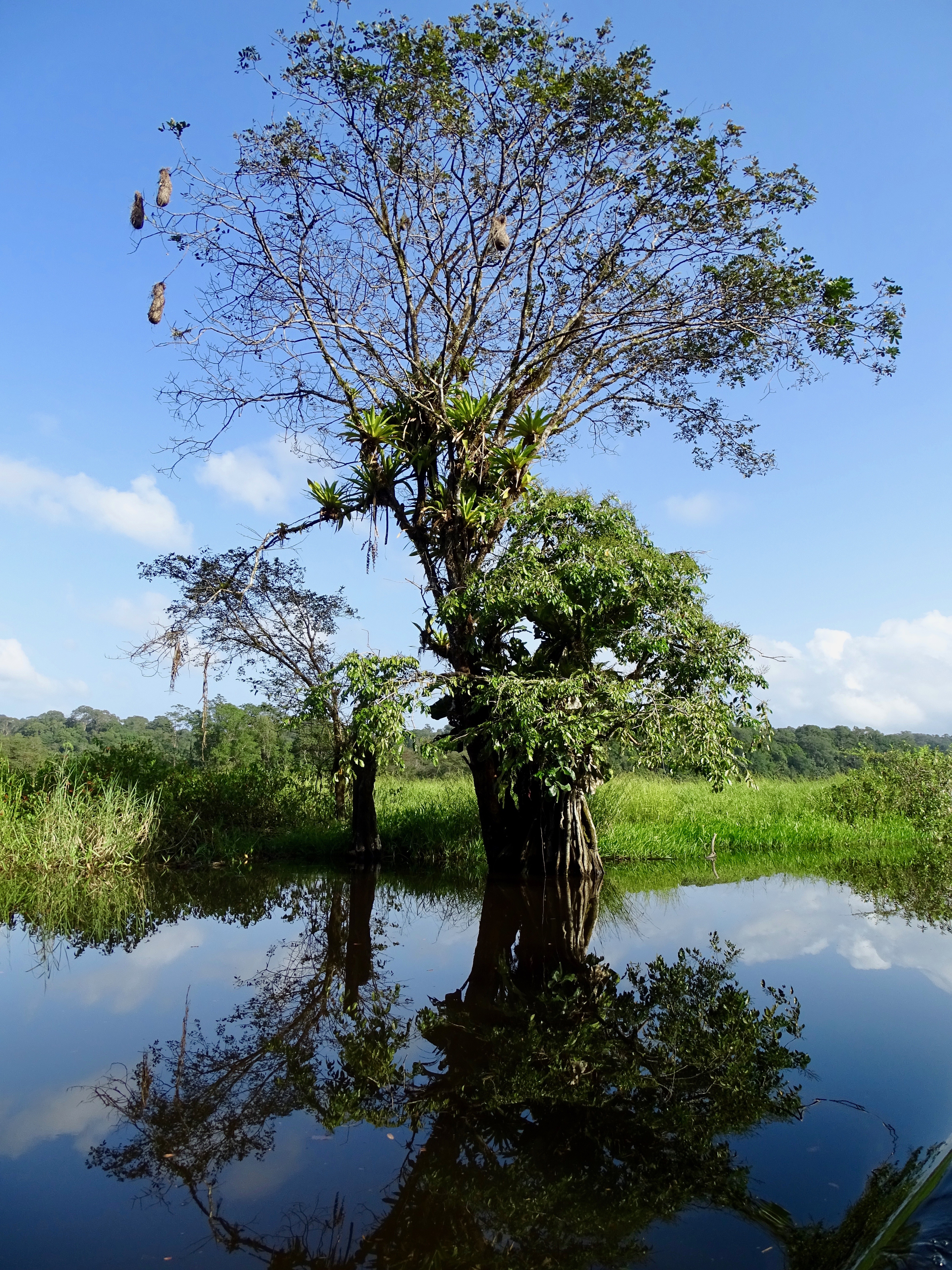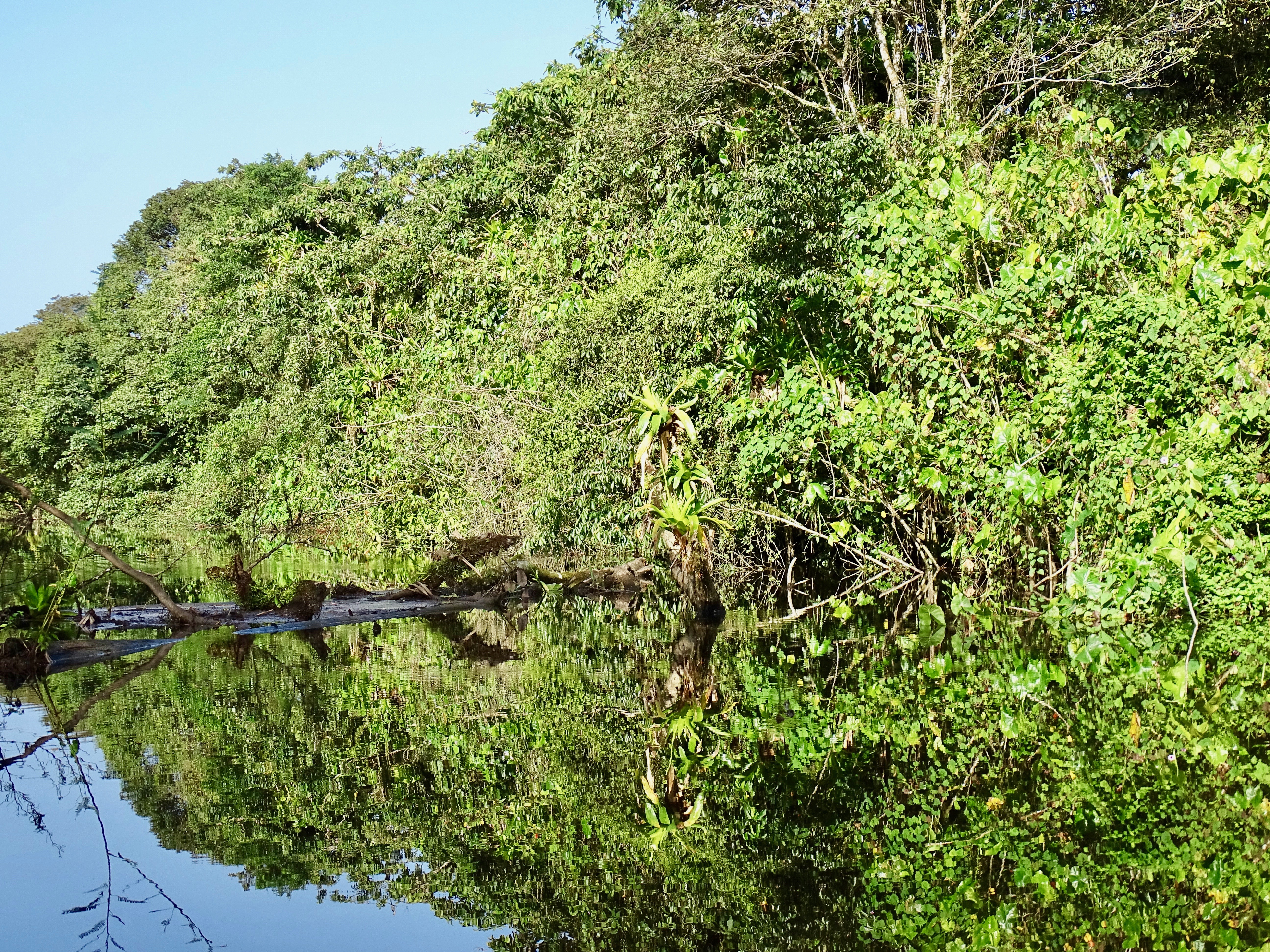 Vers 15h30, il fallait quitter la canopée, à regret bien sûr. Le retour en pirogue était bien ensoleillé, même chaud et plus rapide grâce au courant et à la montée des eaux (évitant de ralentir aux passages arborés).