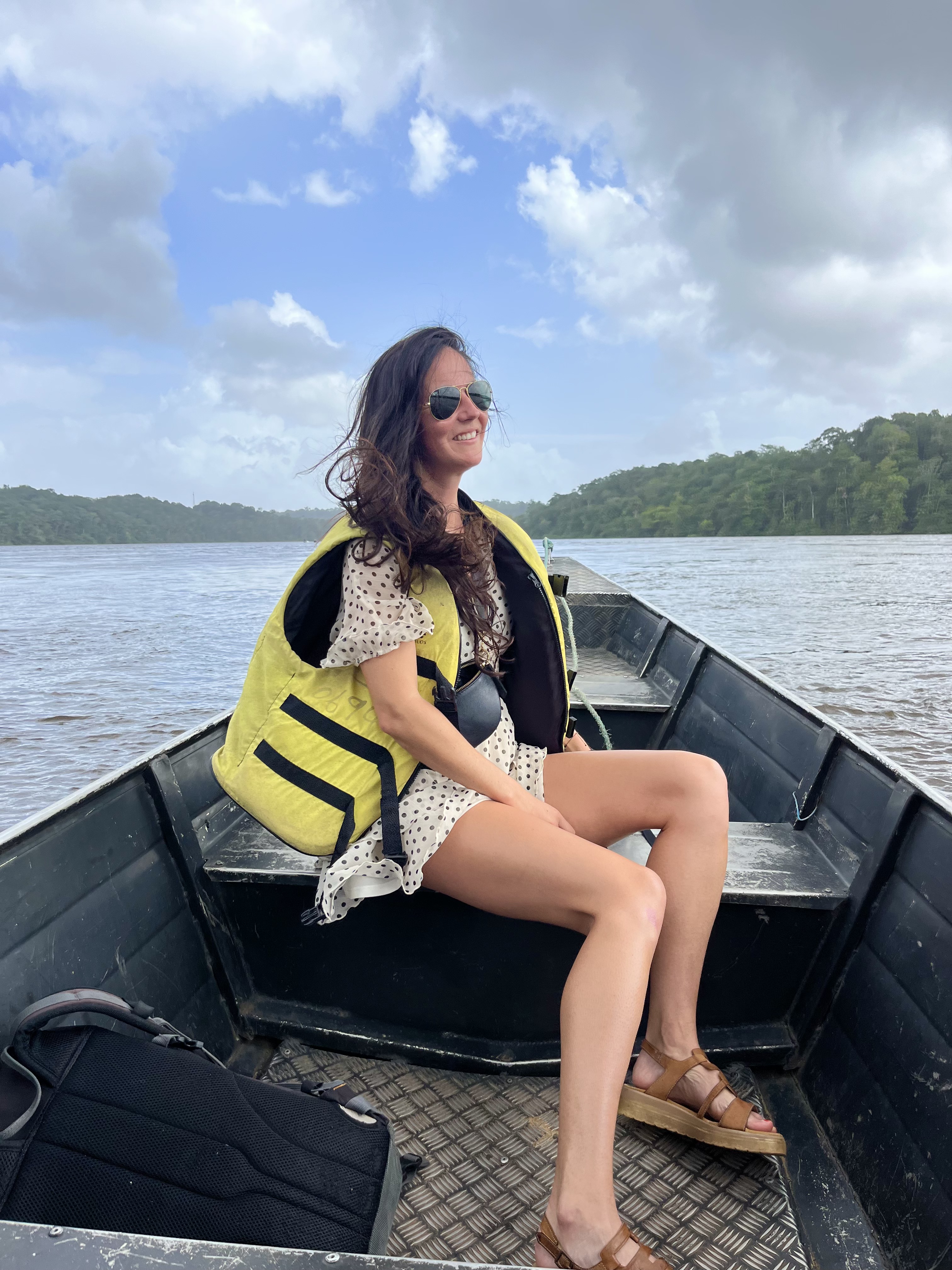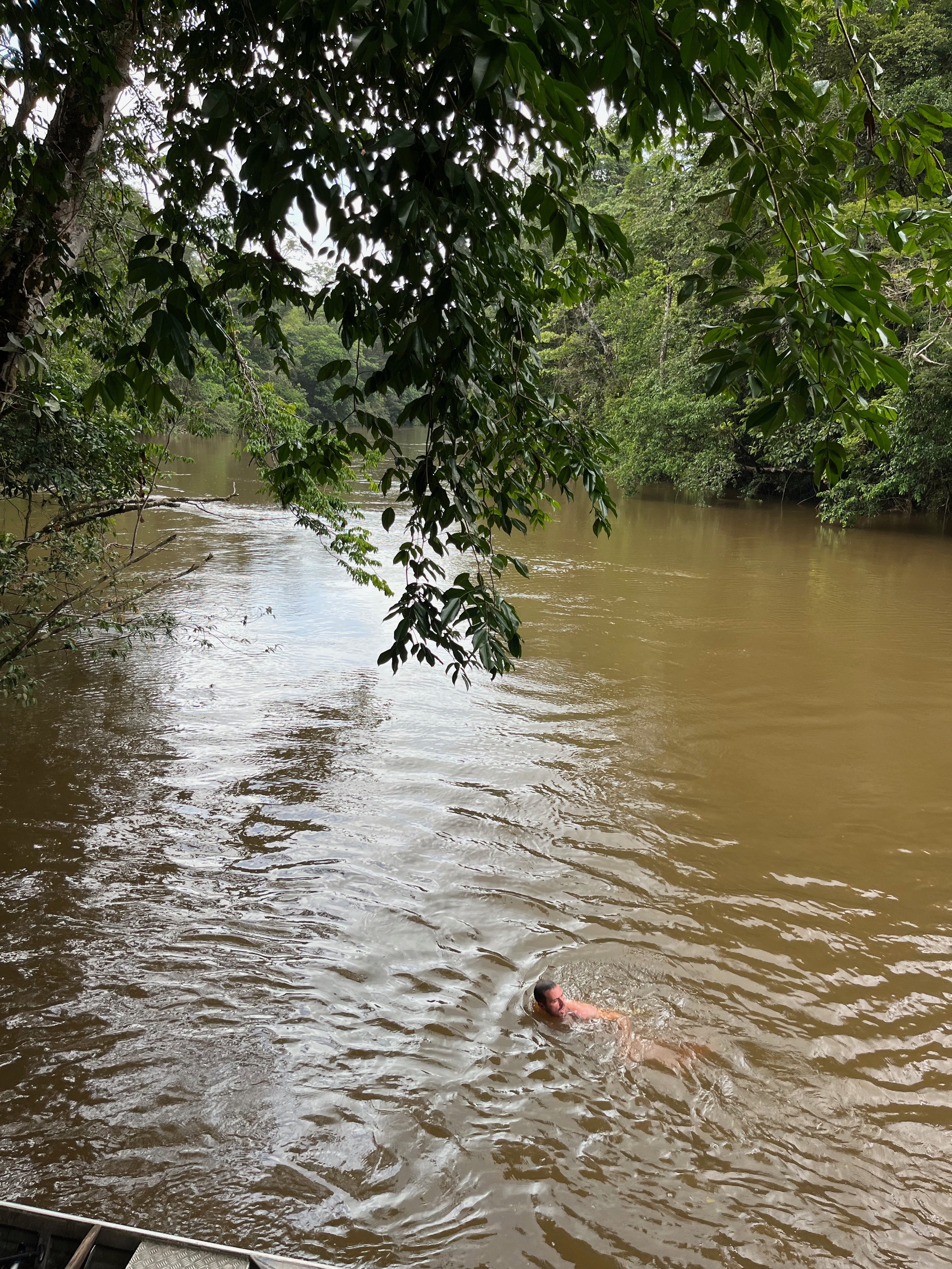 Nous sommes partis en pirogue pour une excursion jusqu’à la crique Wapu. J’étais la seule en maillot dans la pirogue, je n’ai pas compris sur le coup. J’étais persuadée que la crique était une petite plage et qu’on pouvait se baigner (et ou était le problème de nager avec des caimans ?!)