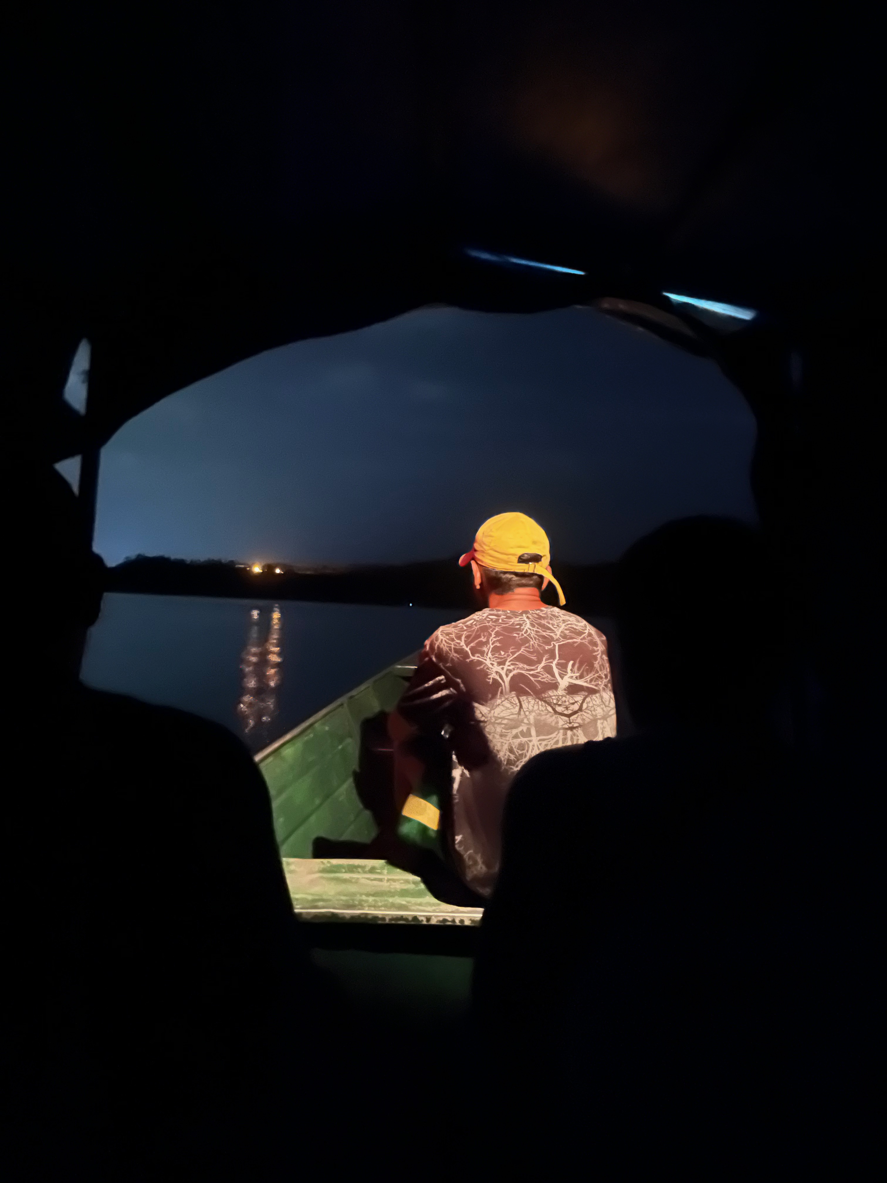 La journée n’était pas terminée. Déjà, avant de quitter notre chambre, nous avions repéré un immense caïman, impressionnant dans la nuit, avec ses yeux. Nous sommes donc partis à la découverte de caïmans, en pirogue de nuit. Ambiance incroyable… et nous en avons vu plusieurs : deux bébés puis deux grands. On pouvait les repérer grâce à leurs yeux luisants dans la nuit…