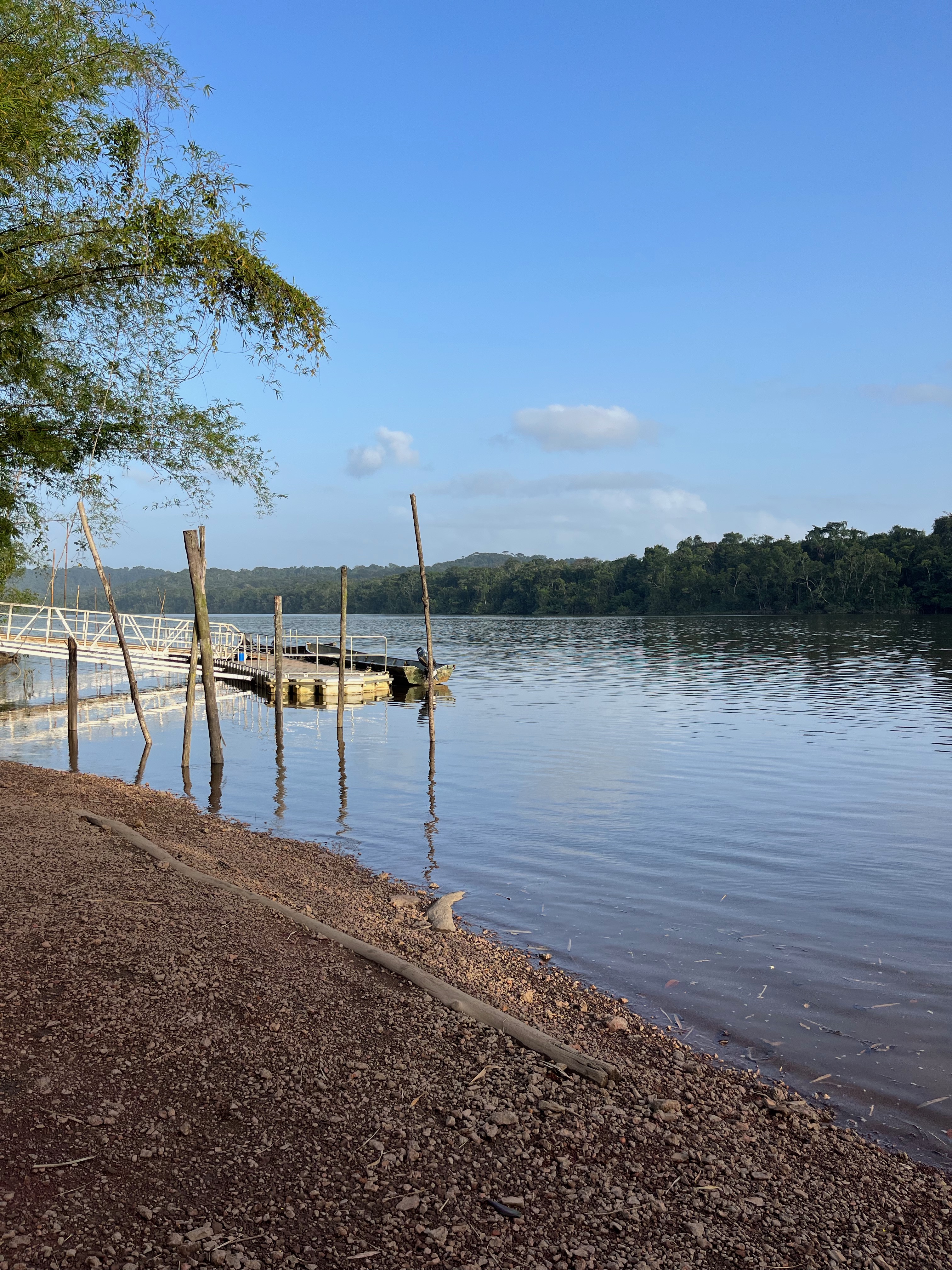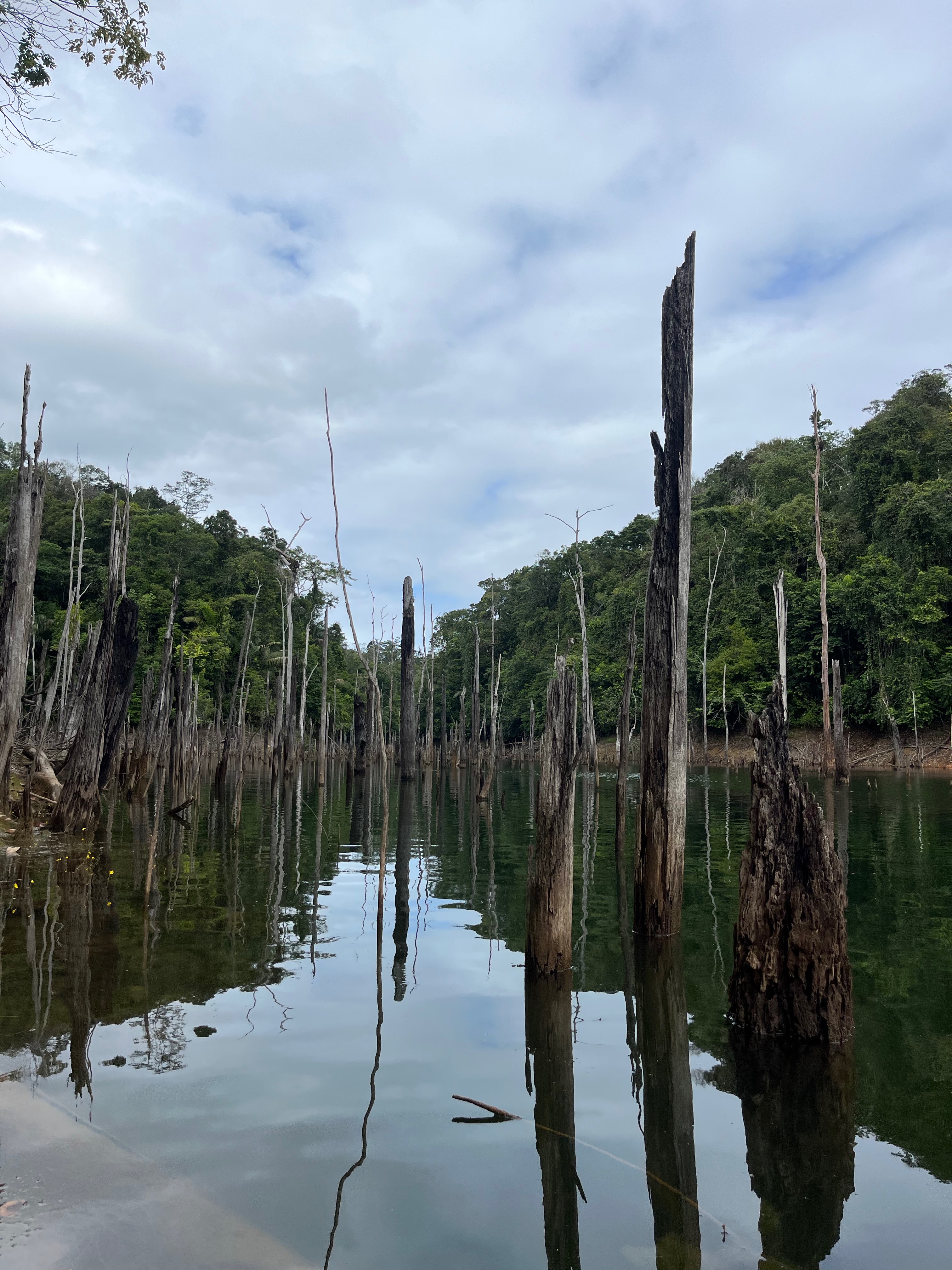 Durant la matinée, nous avons visité les petits lacets du lac, c’était magique, avec les troncs d’arbres baignant dans l’eau. C’est un lac artificiel fermé par le barrage et qui recouvre une partie de forêt. On a vu des toucans et des singes. Nous déambulions doucement, en essayant d’éviter les arbres. Yann, notre guide, nous racontait des anecdotes.