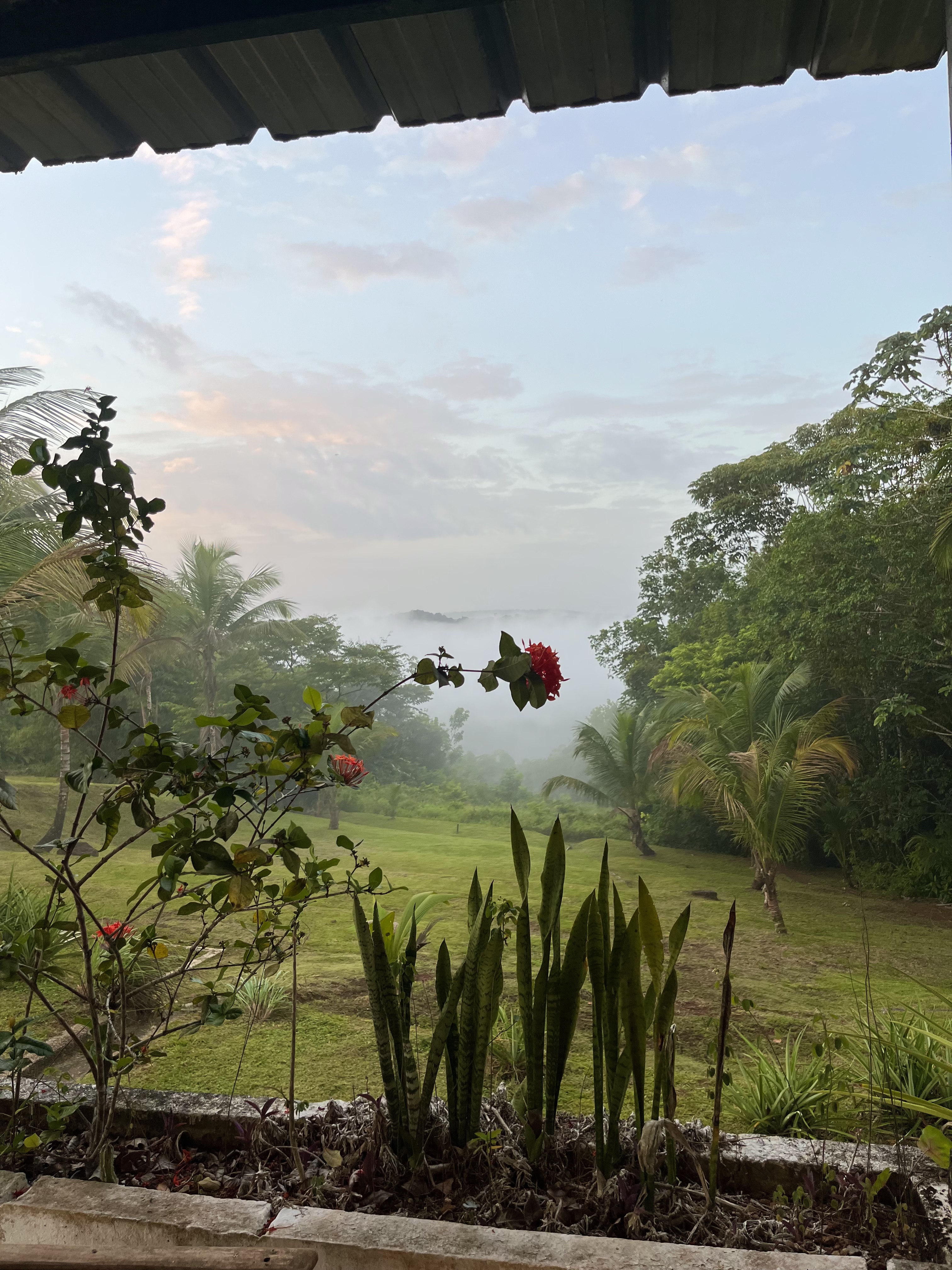 Réveil à 6h du matin par les singes hurleurs… oh la la impressionnant…On s’est quand même rendormis, au rythme des gouttes d’eau. Pourtant, en nous réveillant, il ne pleuvait plus, et même du ciel bleu. Une très belle journée s’annonçait. Petit déjeuner avec des crêpes, miam !