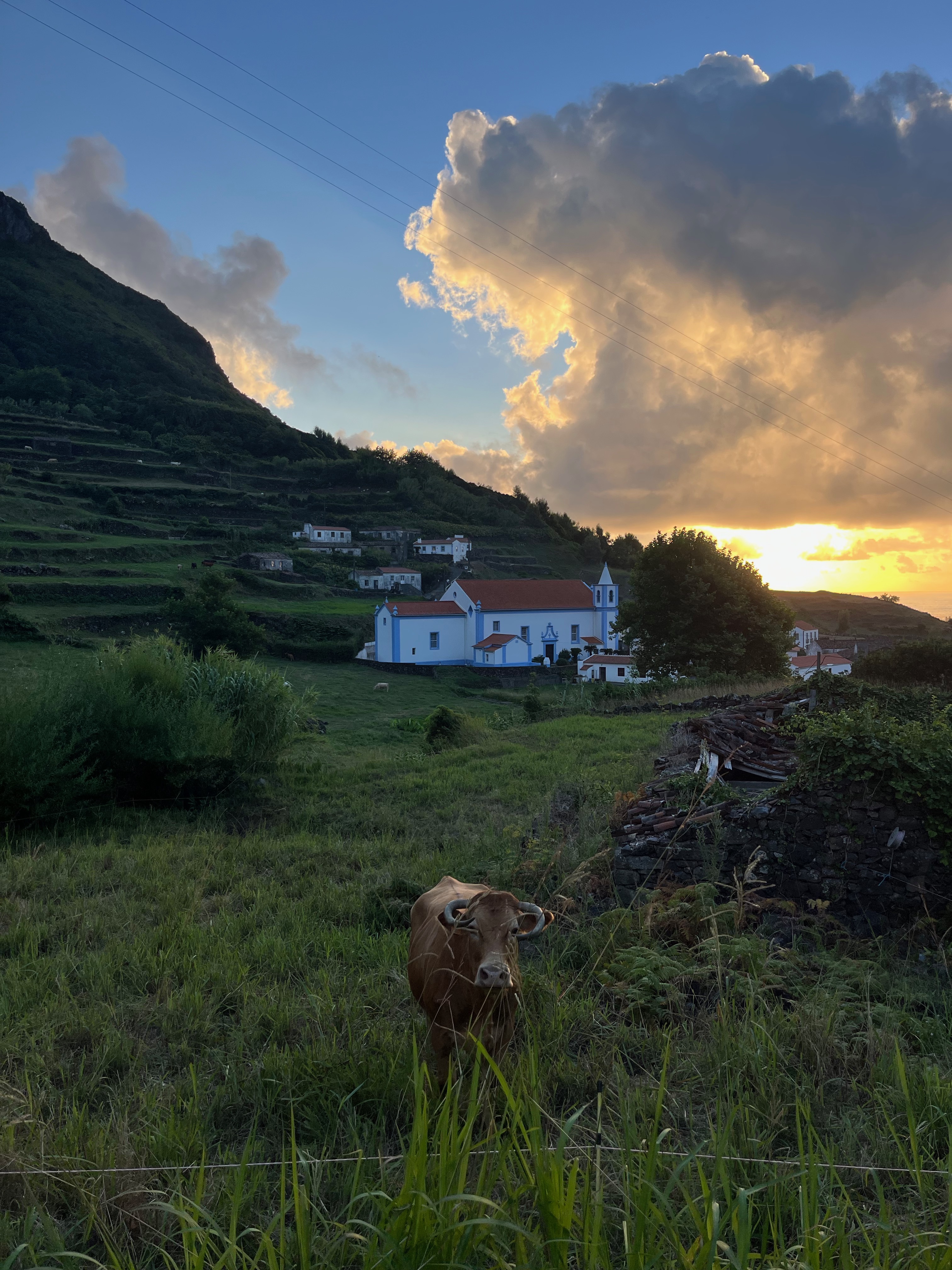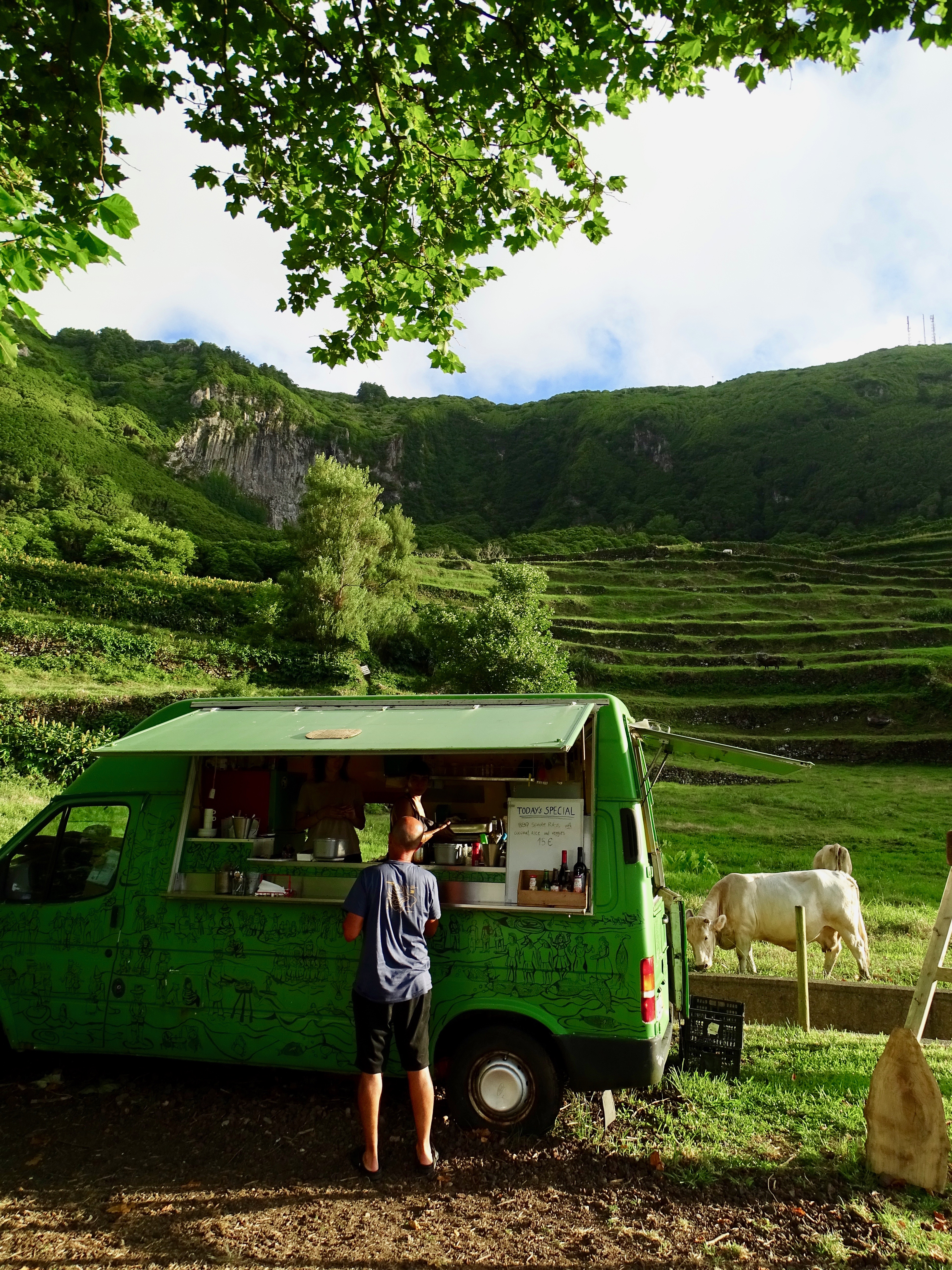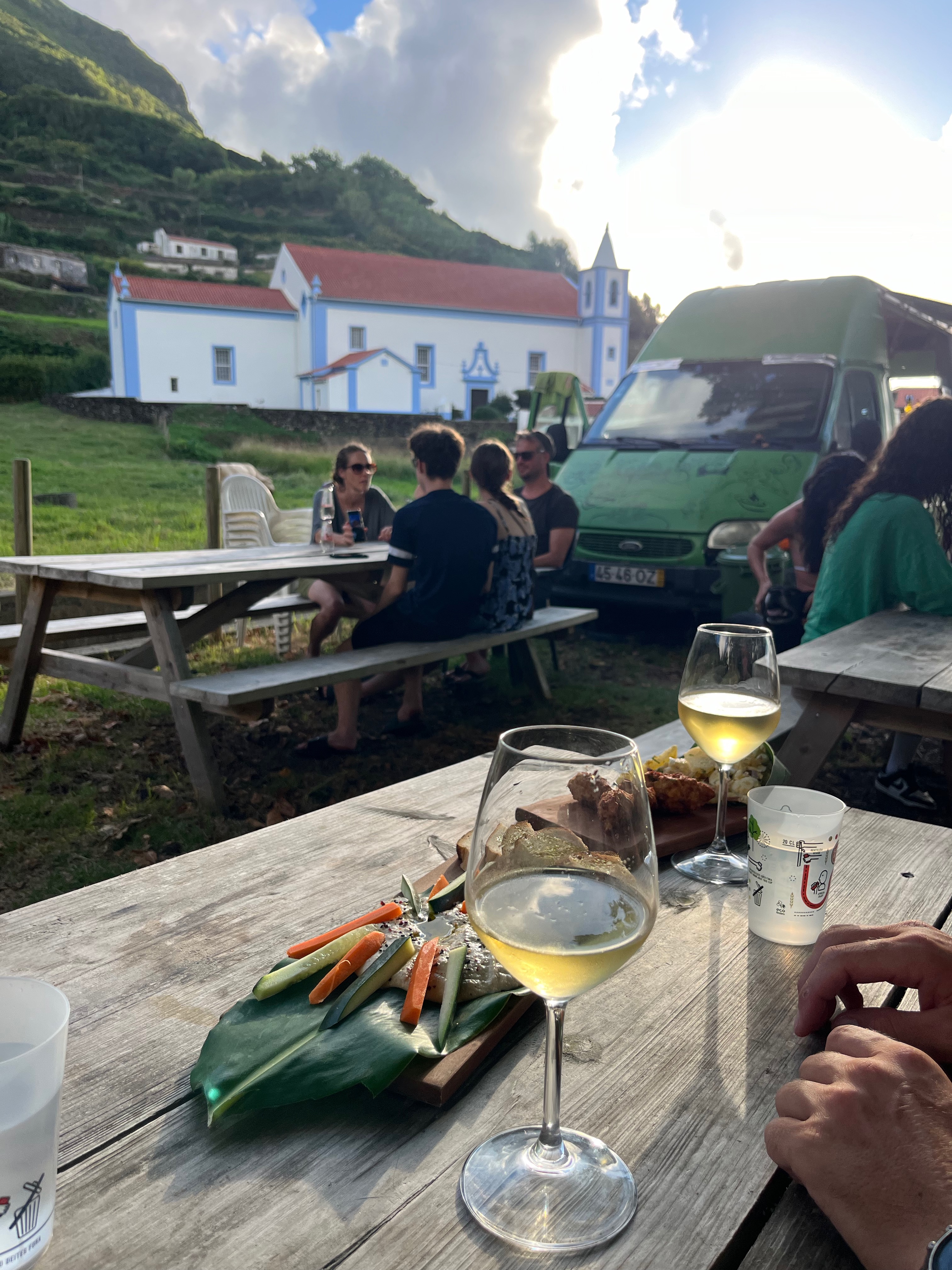 Et c’était reparti pour Fajazinha et le foodtruck trop cool, en stop, easy… Trop bon, avec un petit verre de vin de Pico ! Au retour, magnifique coucher de soleil, en remontant tout le village.