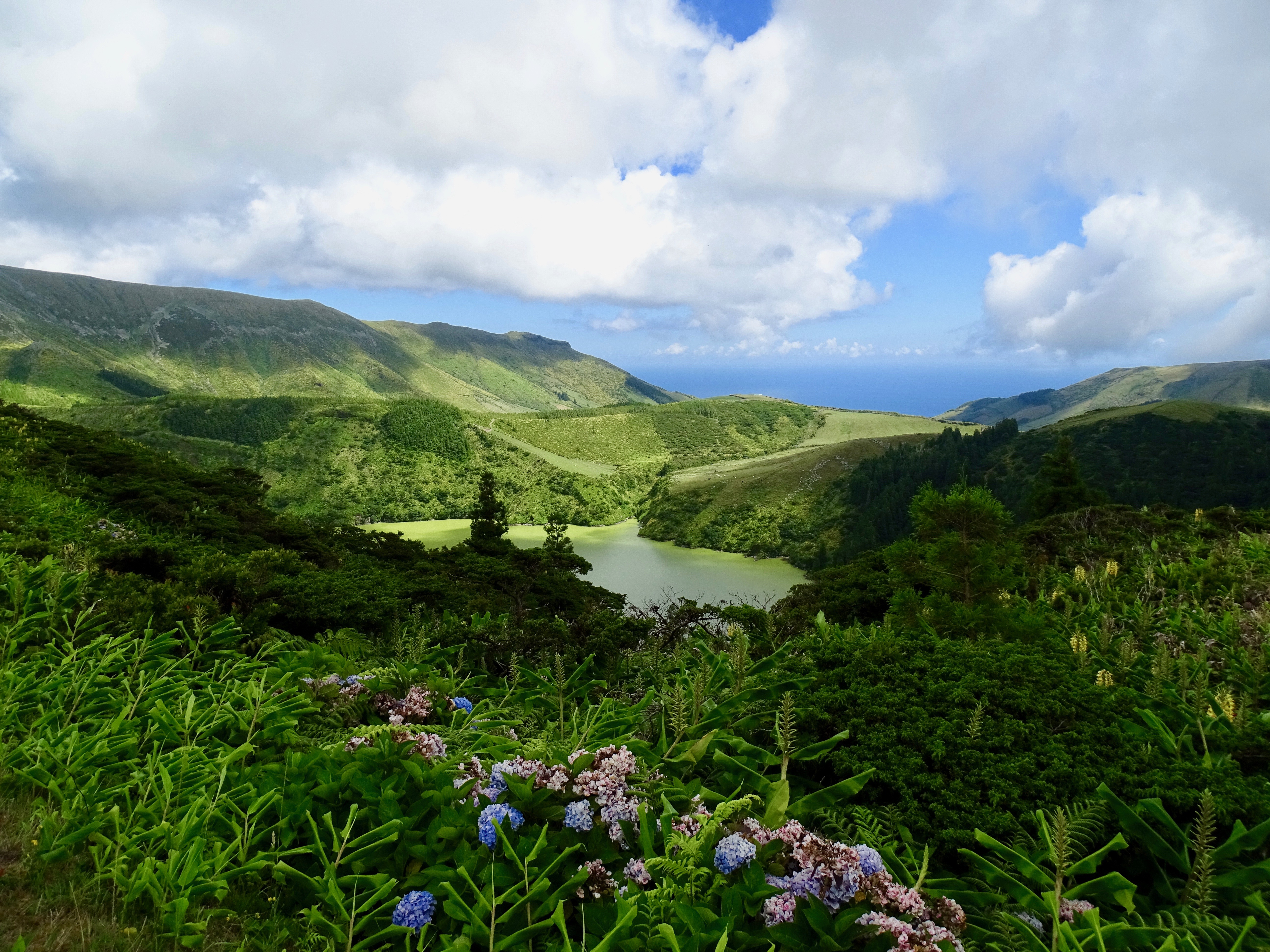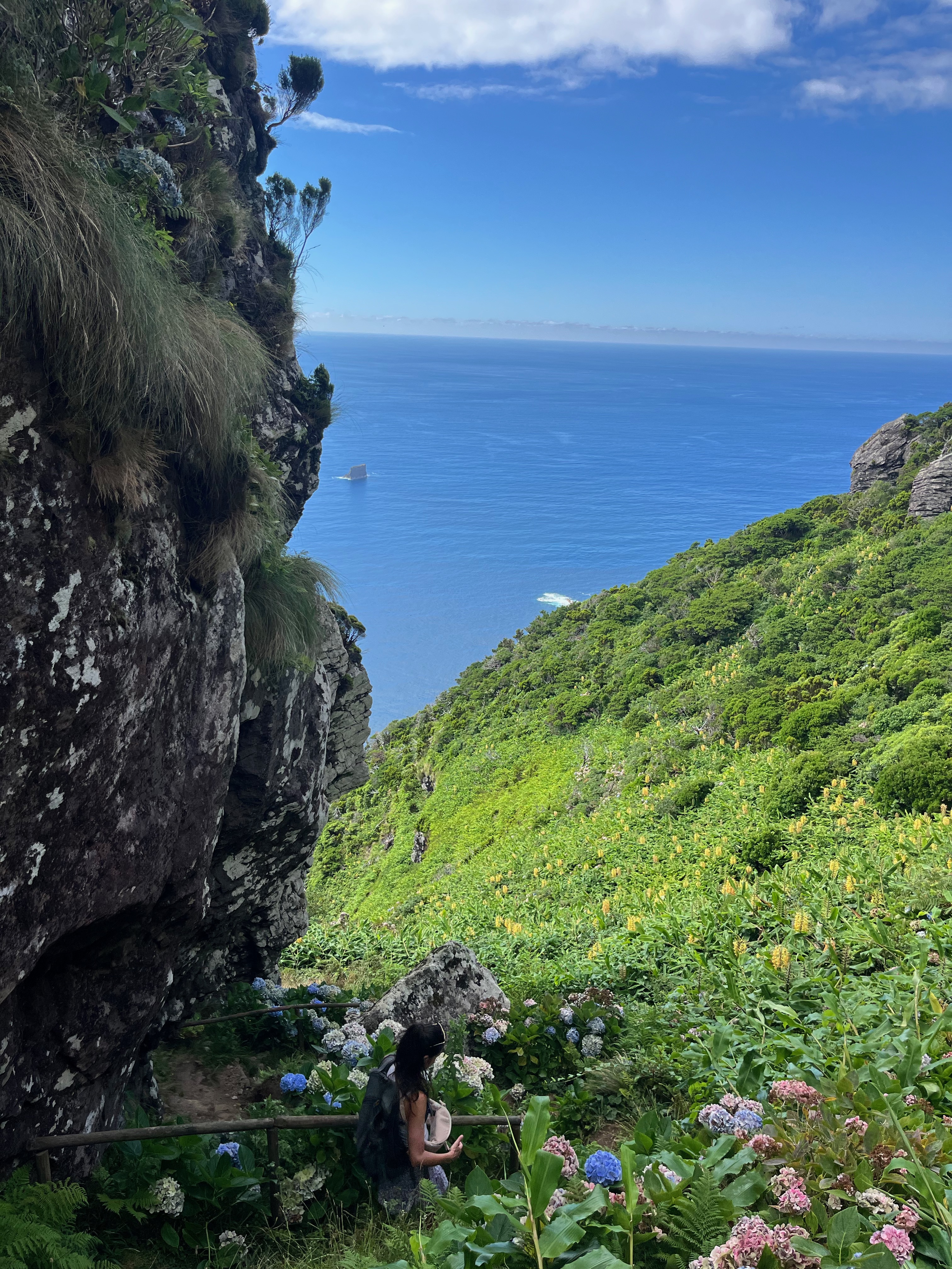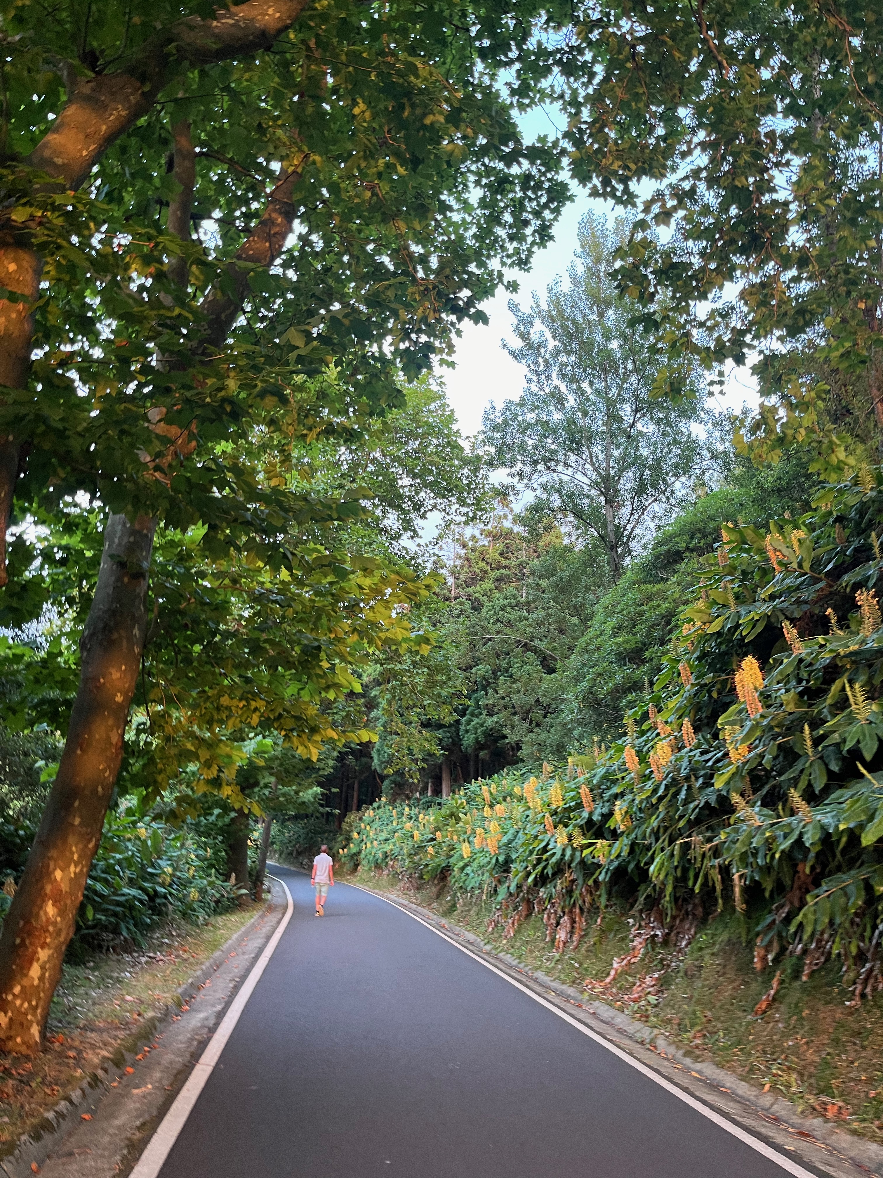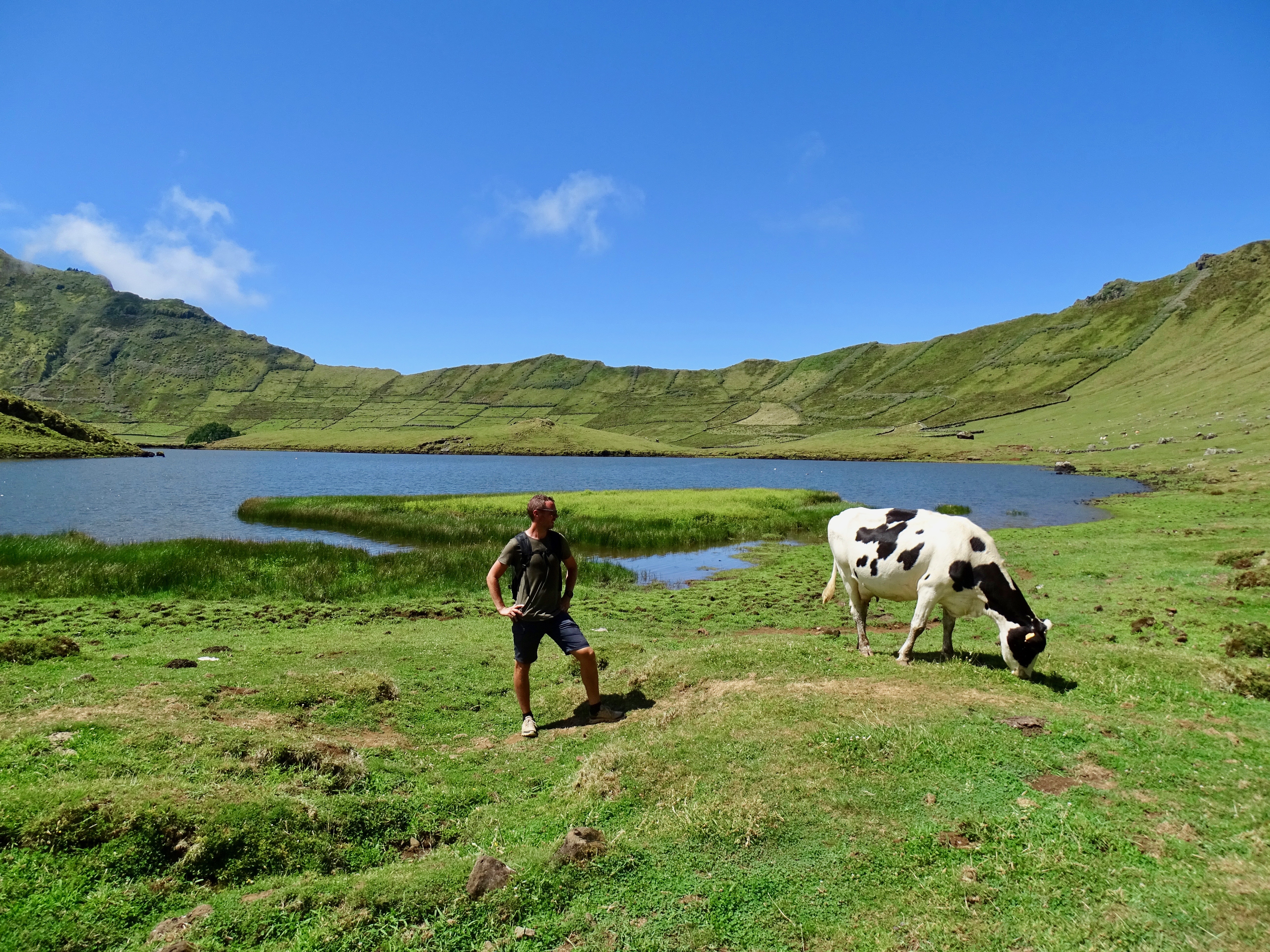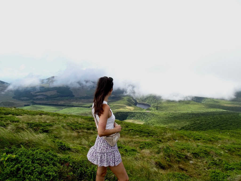 Puis en stop direction le début de la rando pour les autres lacs : Rasa et Funda. Le chemin n’est pas indiqué (regarder sur Alltrail) et il n’est pas passant donc pas mal herbeux. C’était superbe et on a atteint les deux Caldeira dont une très verte et vue mer. Nous avons dû continuer sur la route en marchant car aucune voiture à l’horizon…