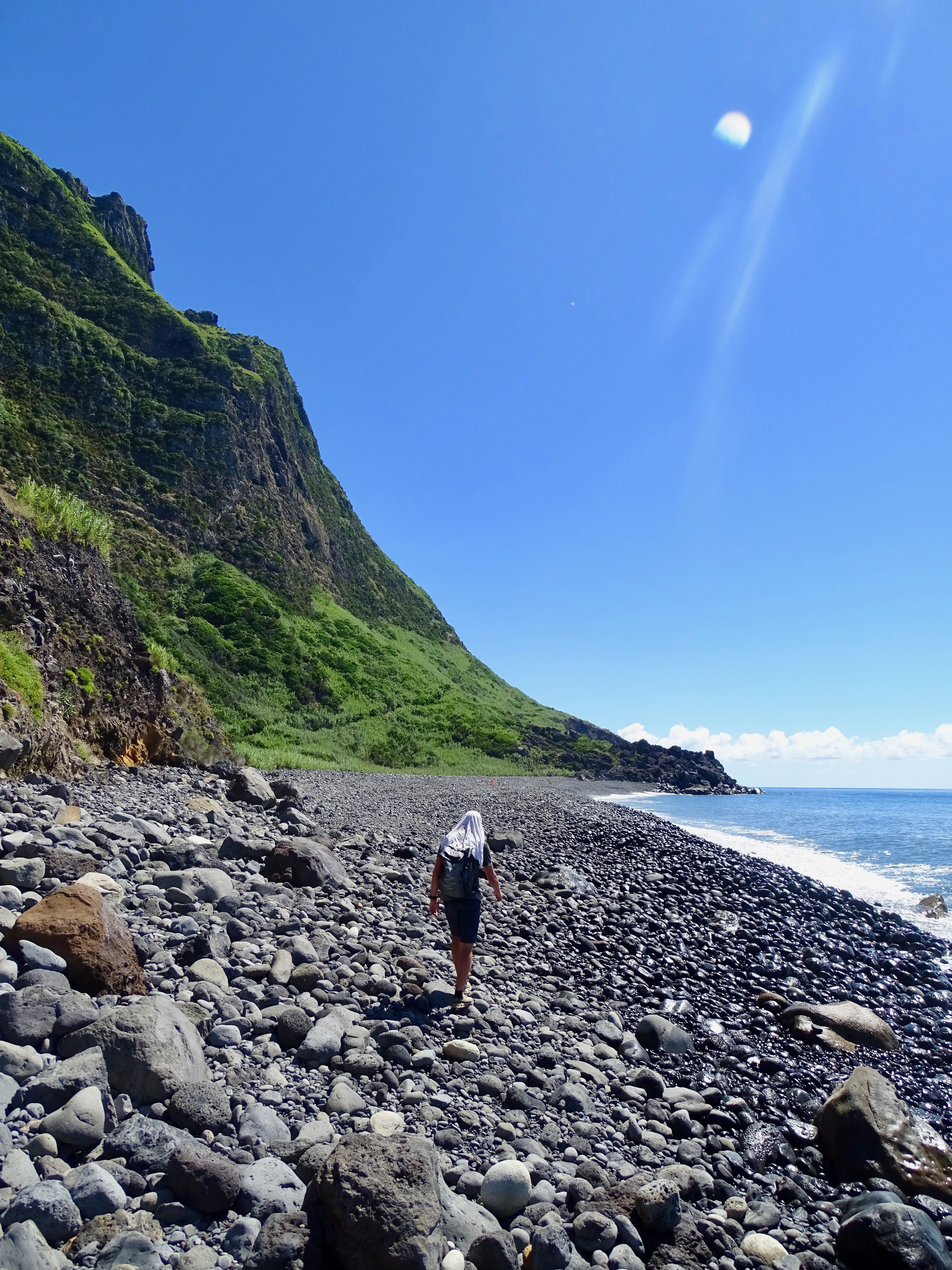C’est une petite rando qui fait 4 km aller/retour, on descend à l’aller et montée au retour, ça vaut vraiment le coup, c’était incroyable, vue imprenable sur les falaises et belle plage de galets/sable noir. Par contre, il faisait une chaleur de folie et pas d’air.Heureusement, nous avions nos casquettes (ou pas…)J’avais donc mis un Tee Shirt sur la tête.Il y avait quelques cabanes de pêcheurs, trop mignonnes.