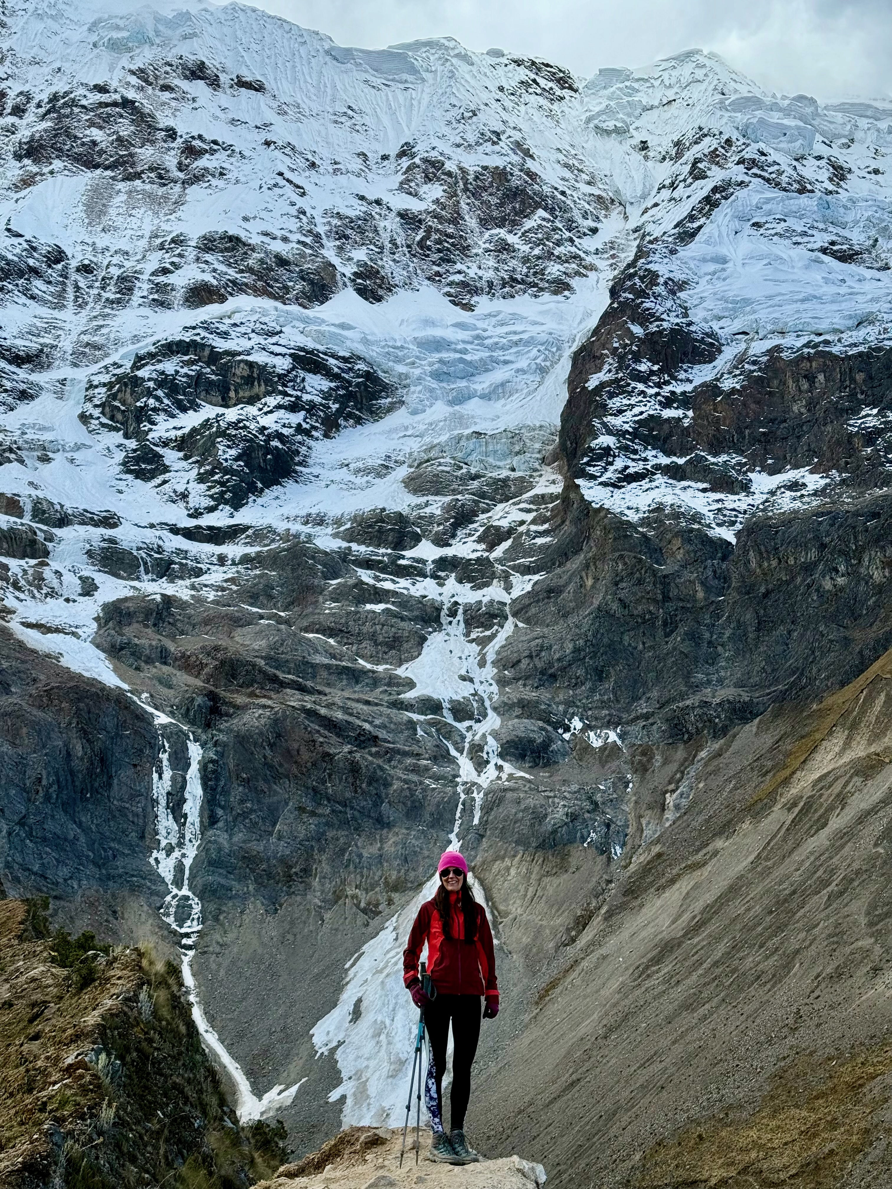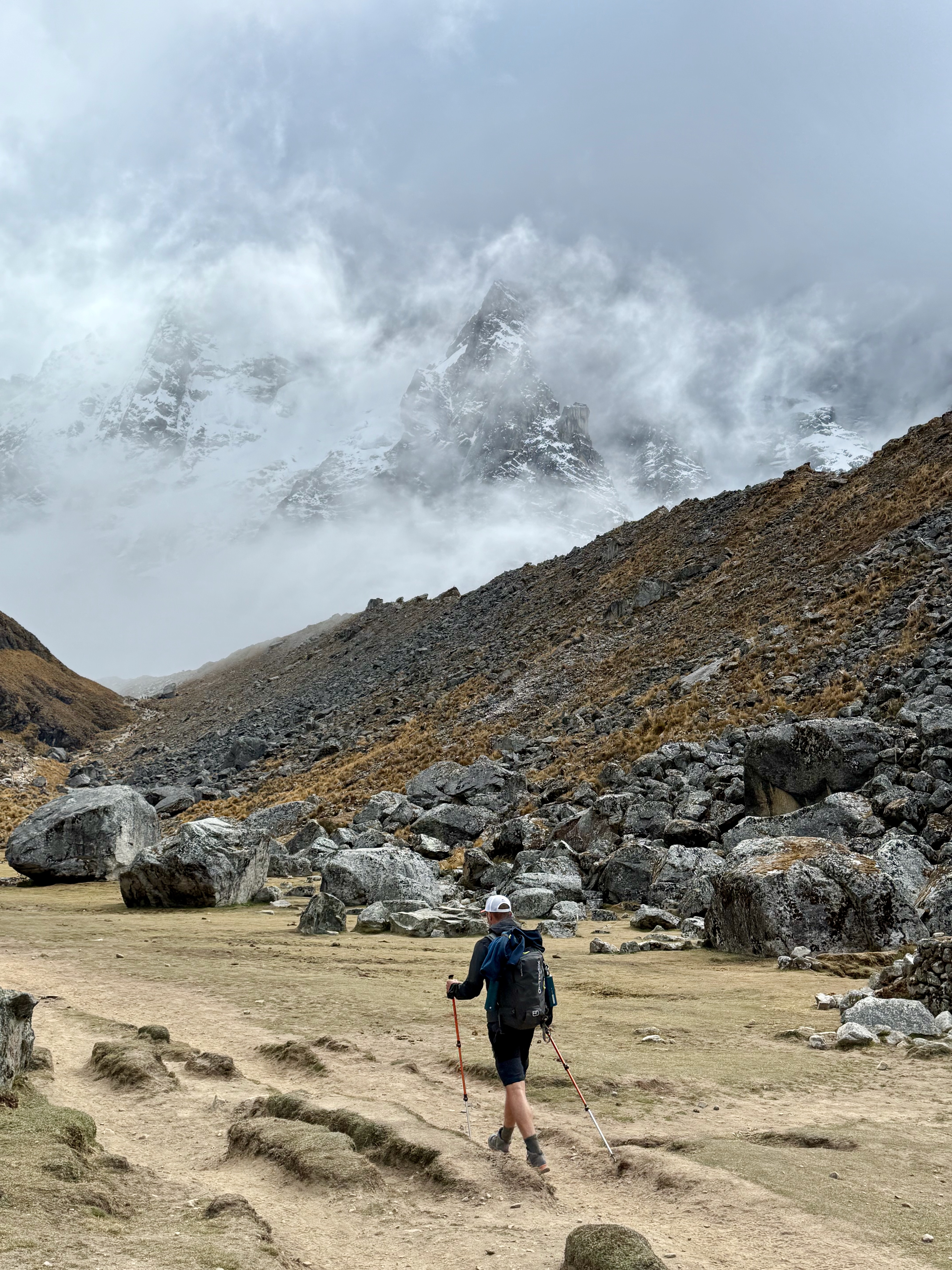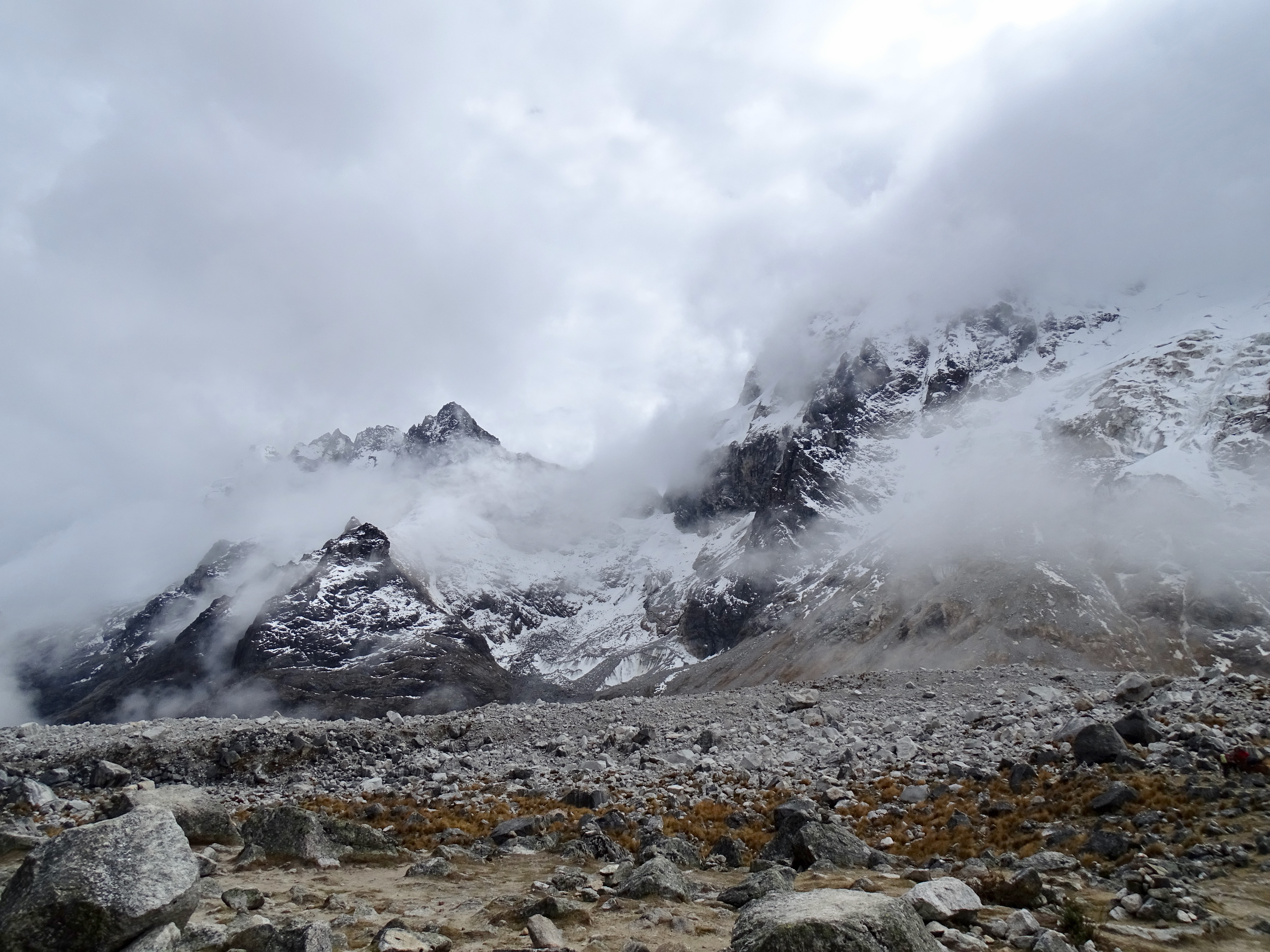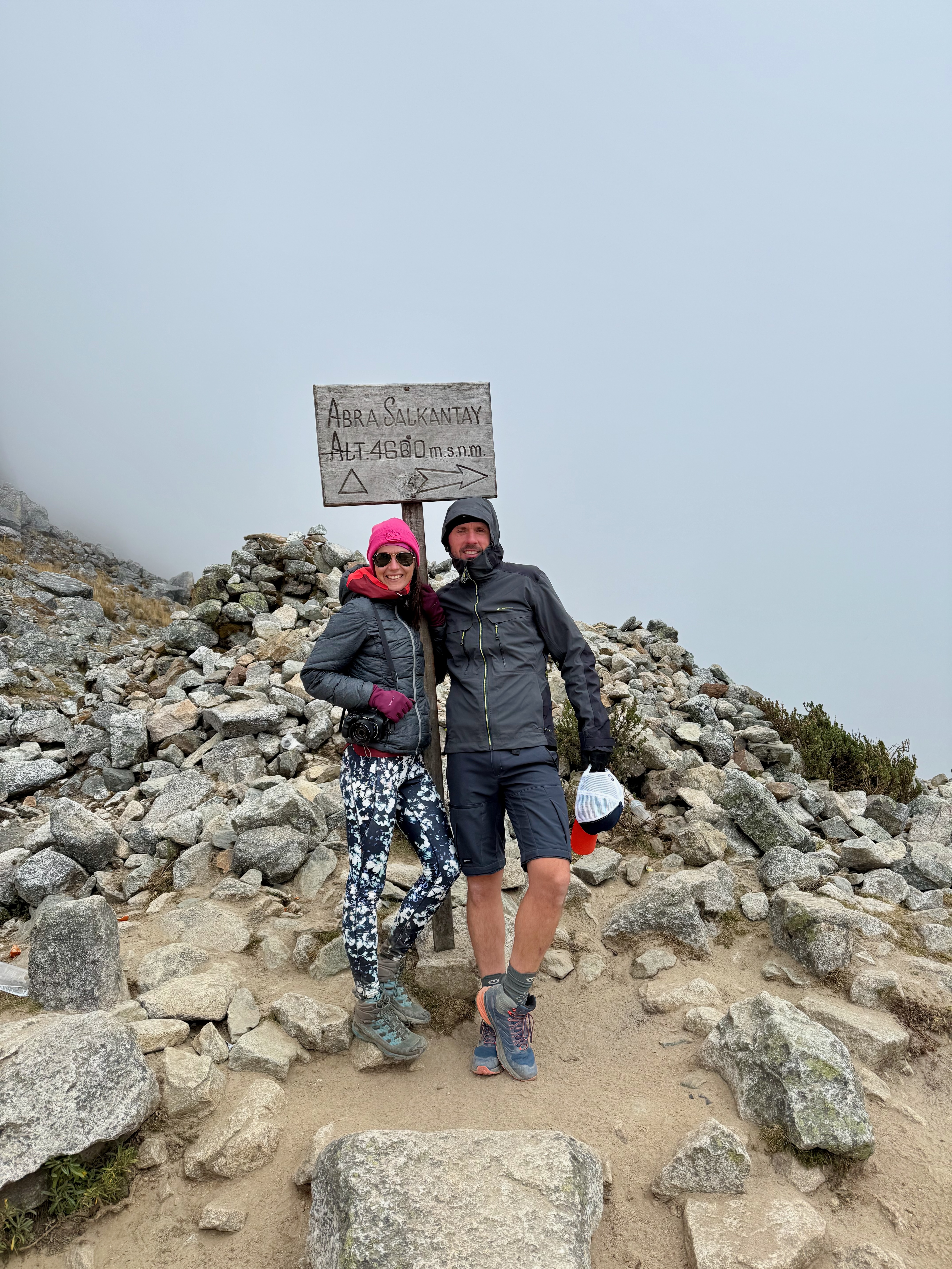 Nous sommes arrivés, au bout de 2h, au col d’Abra Salkantay (4700m), dans le brouillard, alors que, pendant la montée, nous avions le Salkantay en vue. Un peu déçue, il faisait très froid, on s’est abrité pour manger des snickers puis ça s’est en partie dégagé, c’était superbe !