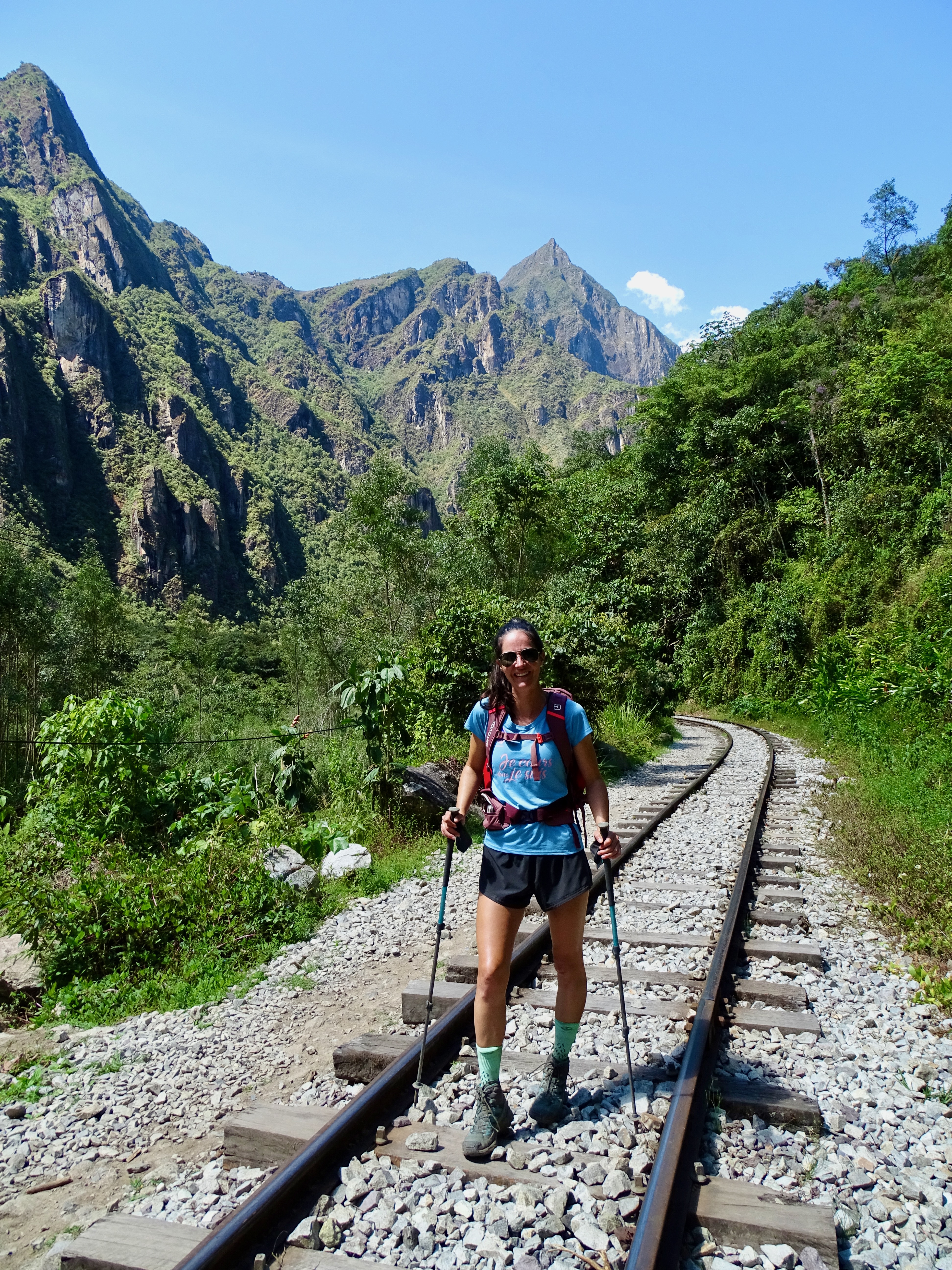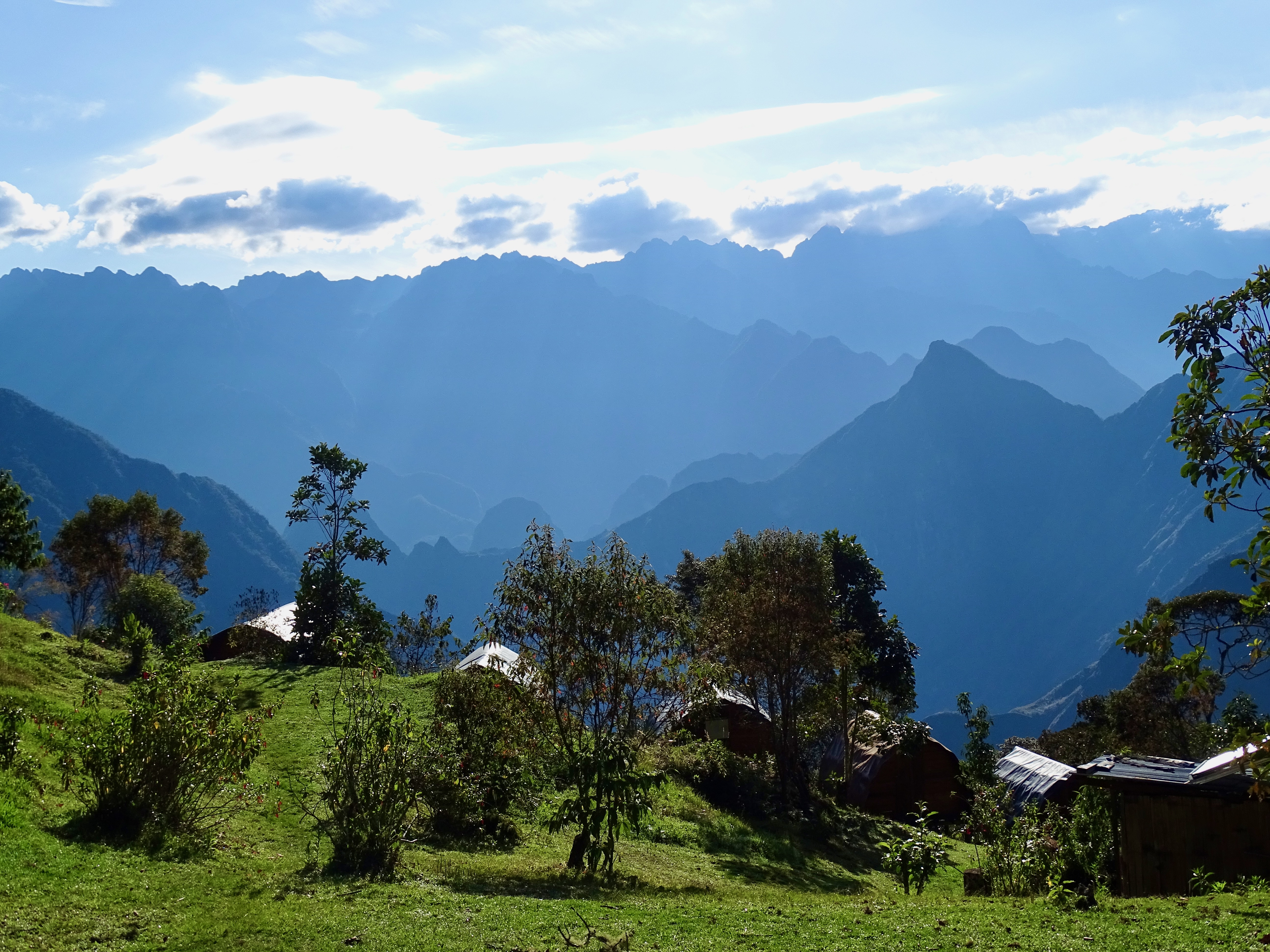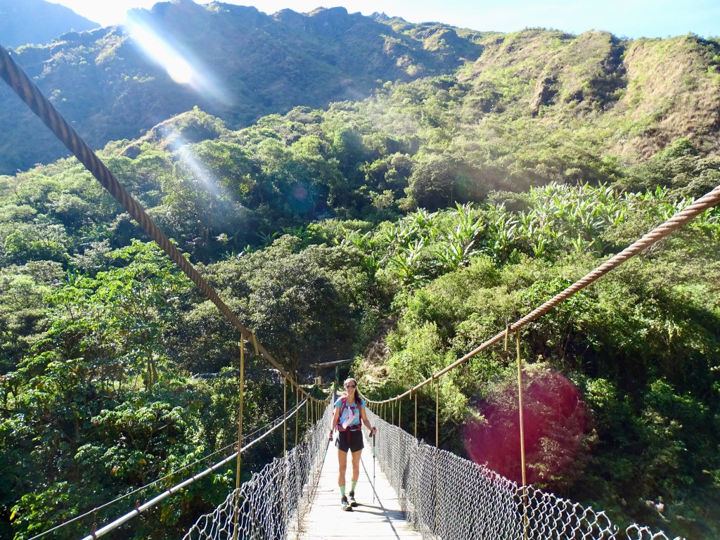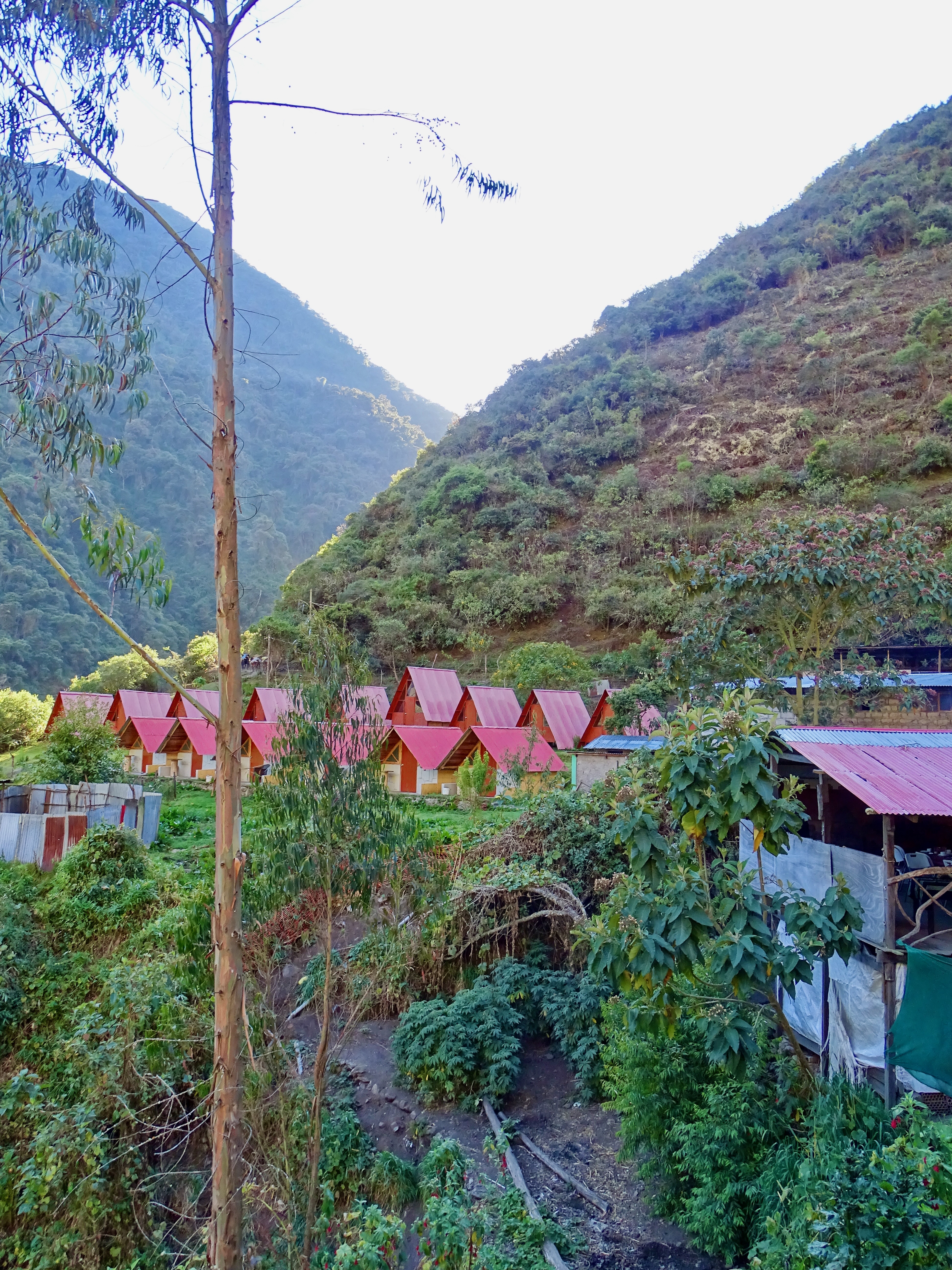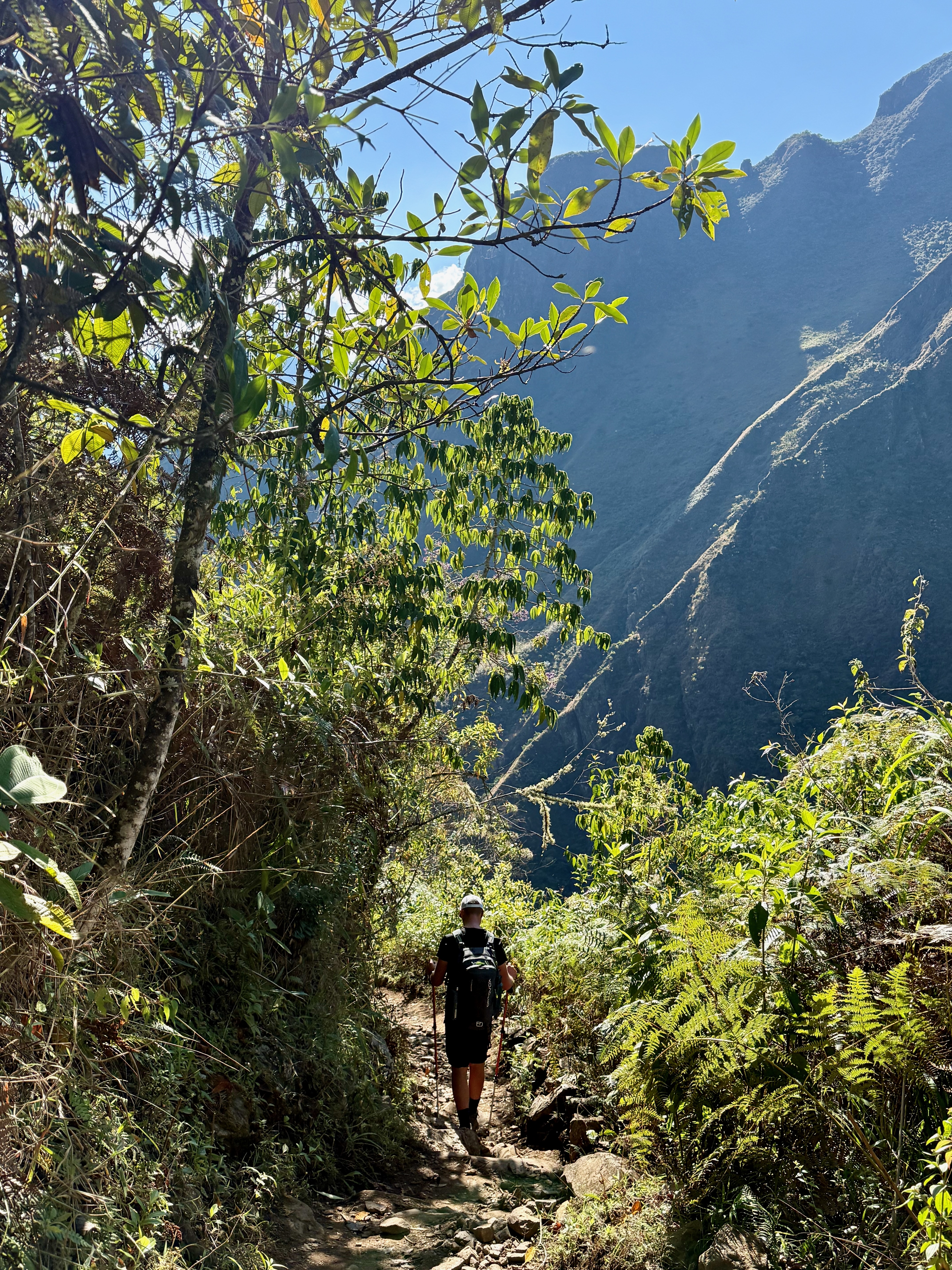 Départ à 8h, assez tard mais on avait une petite journée. Belle descente dans la forêt tropicale avec quelques vues sur les montagnes et le Machu Picchu. La descente est raide donc nous avons rapidement avalé les 1000m D-, tout seuls, plus de groupes.