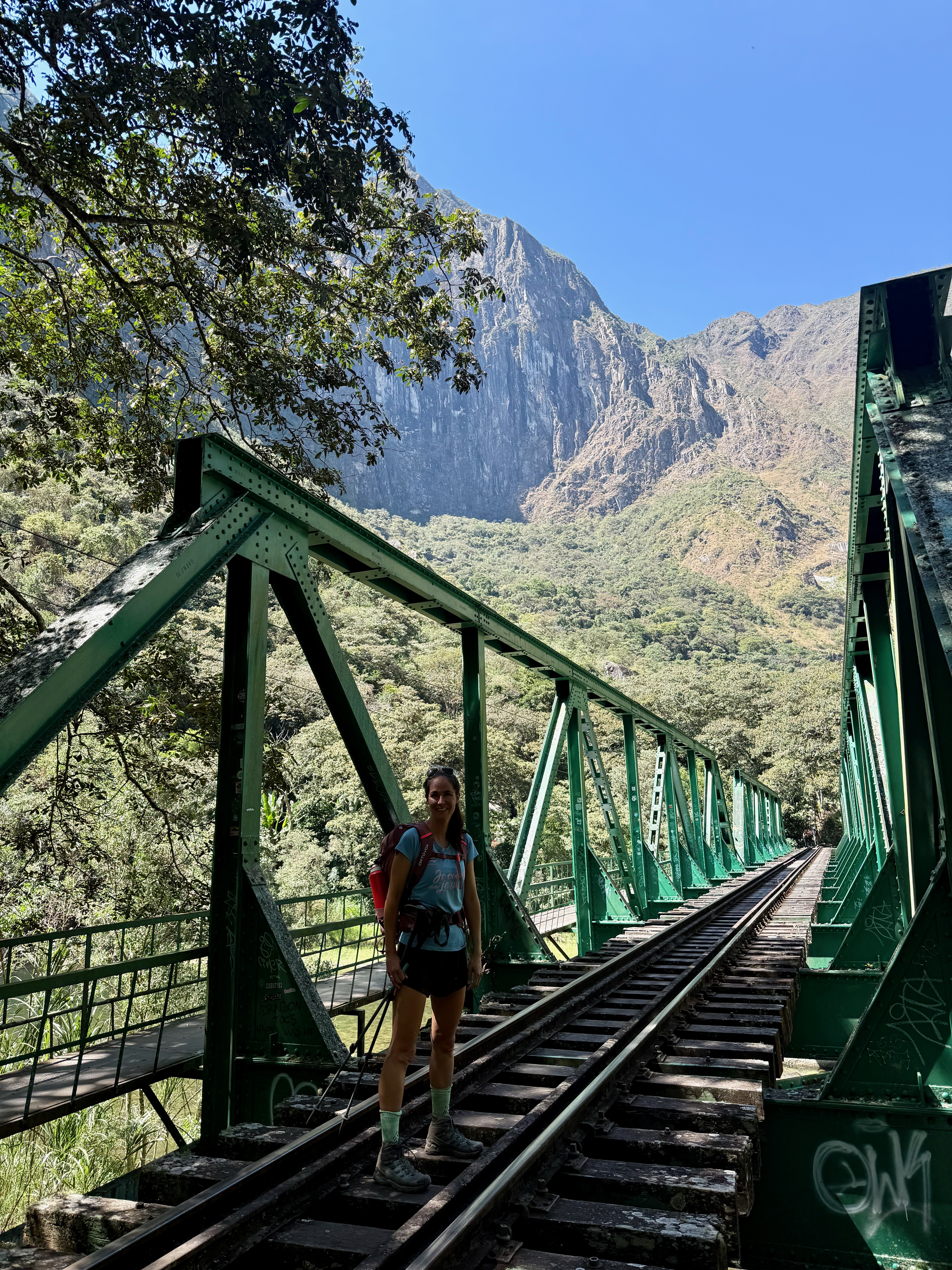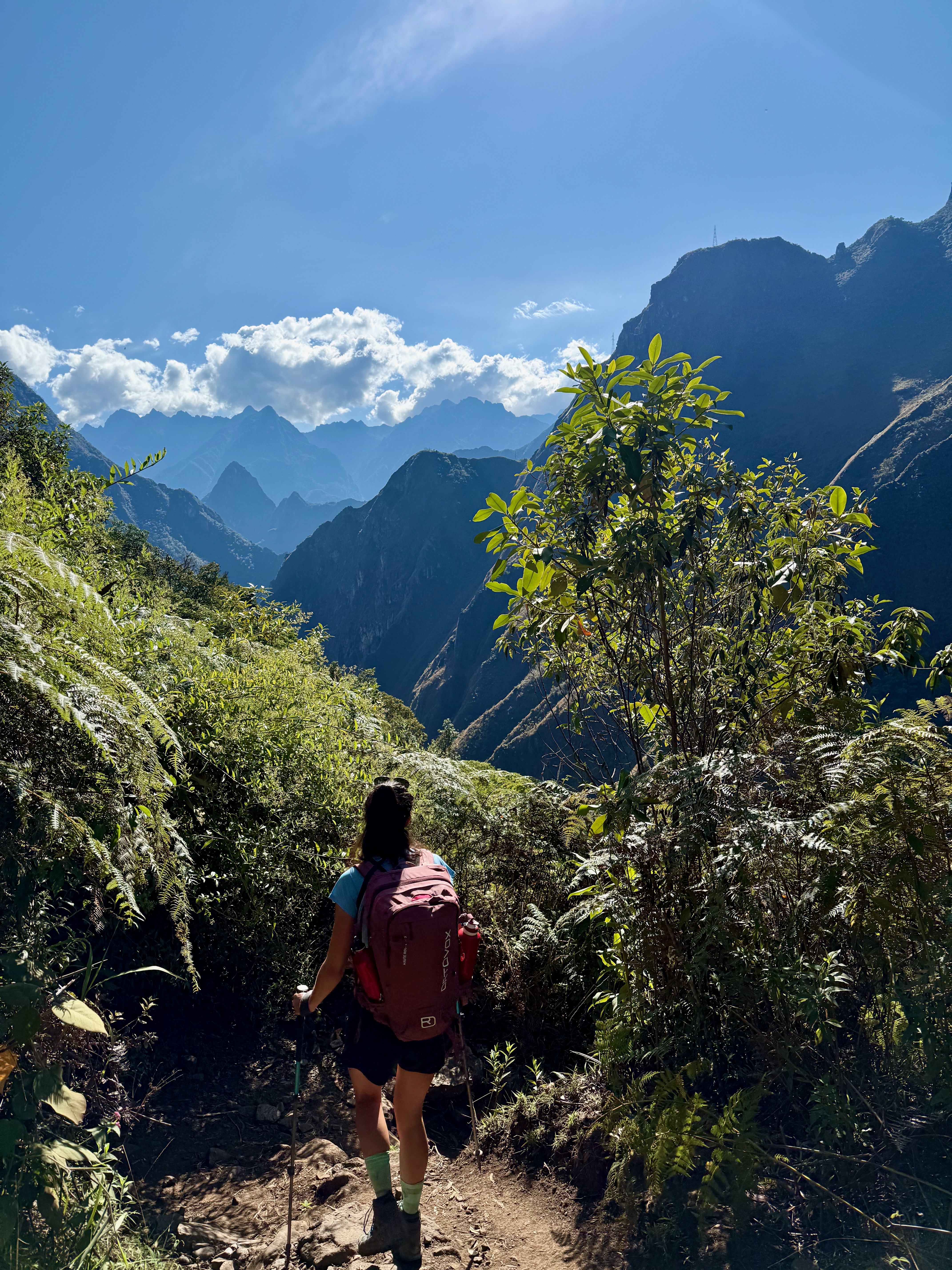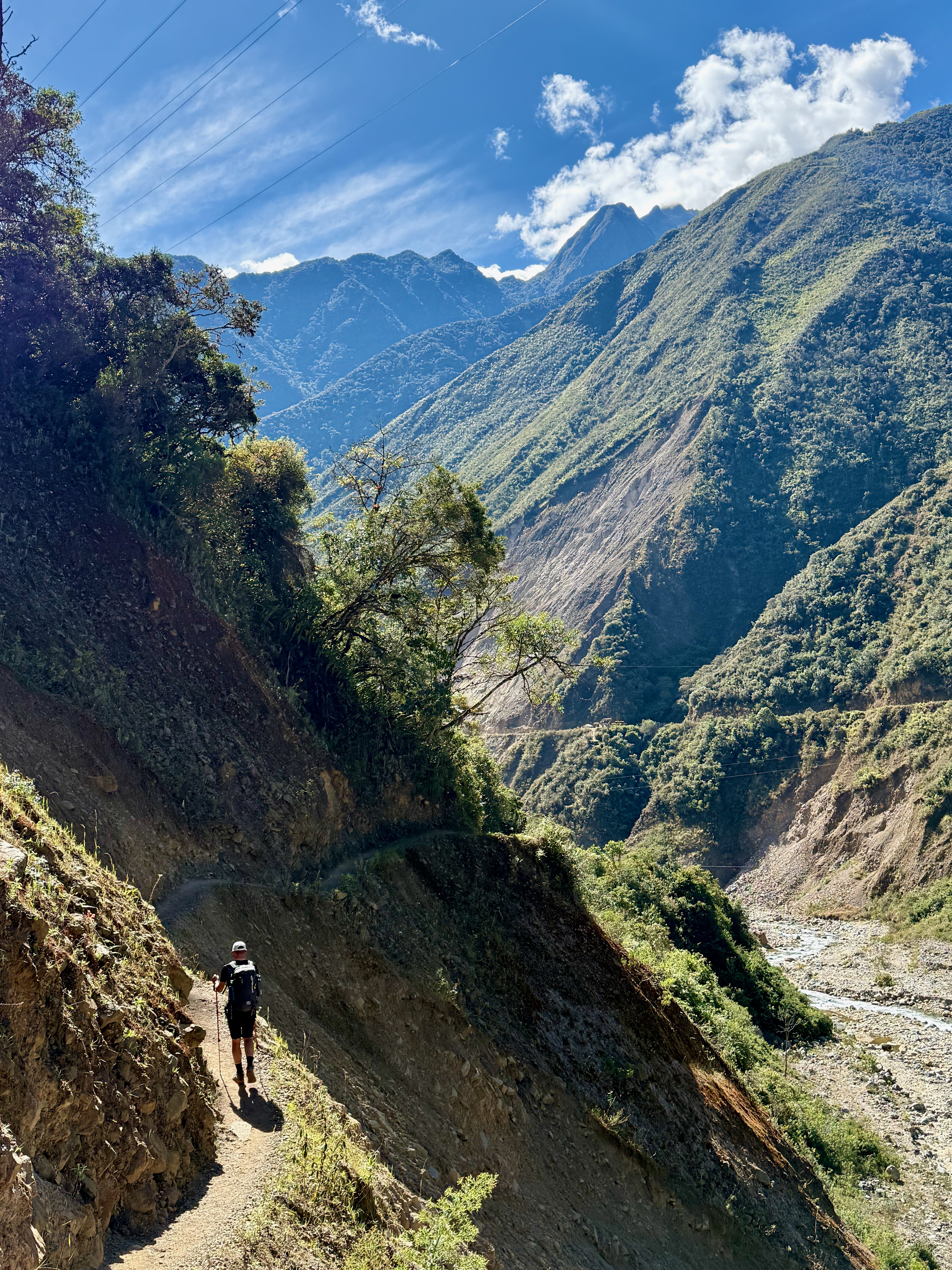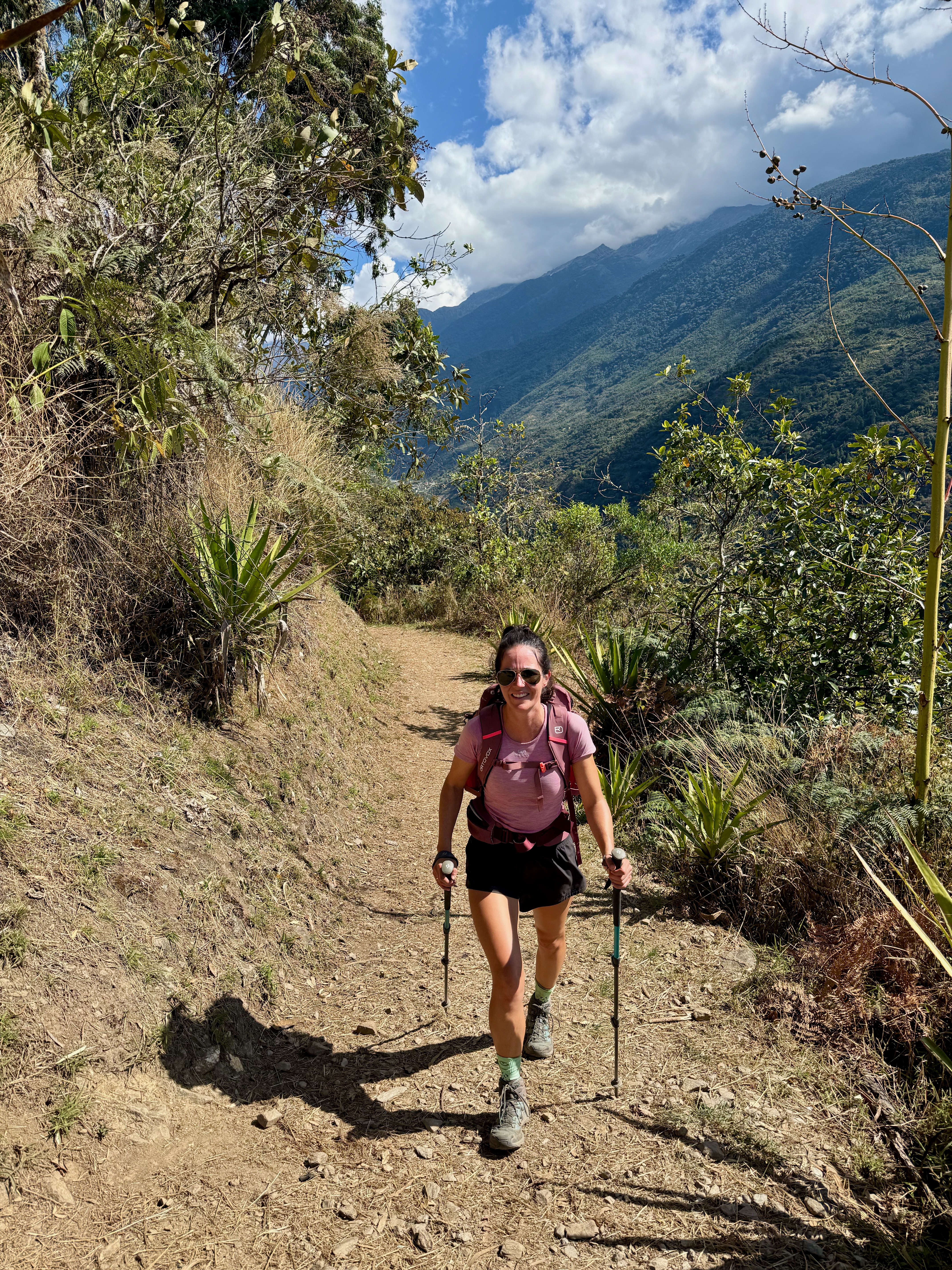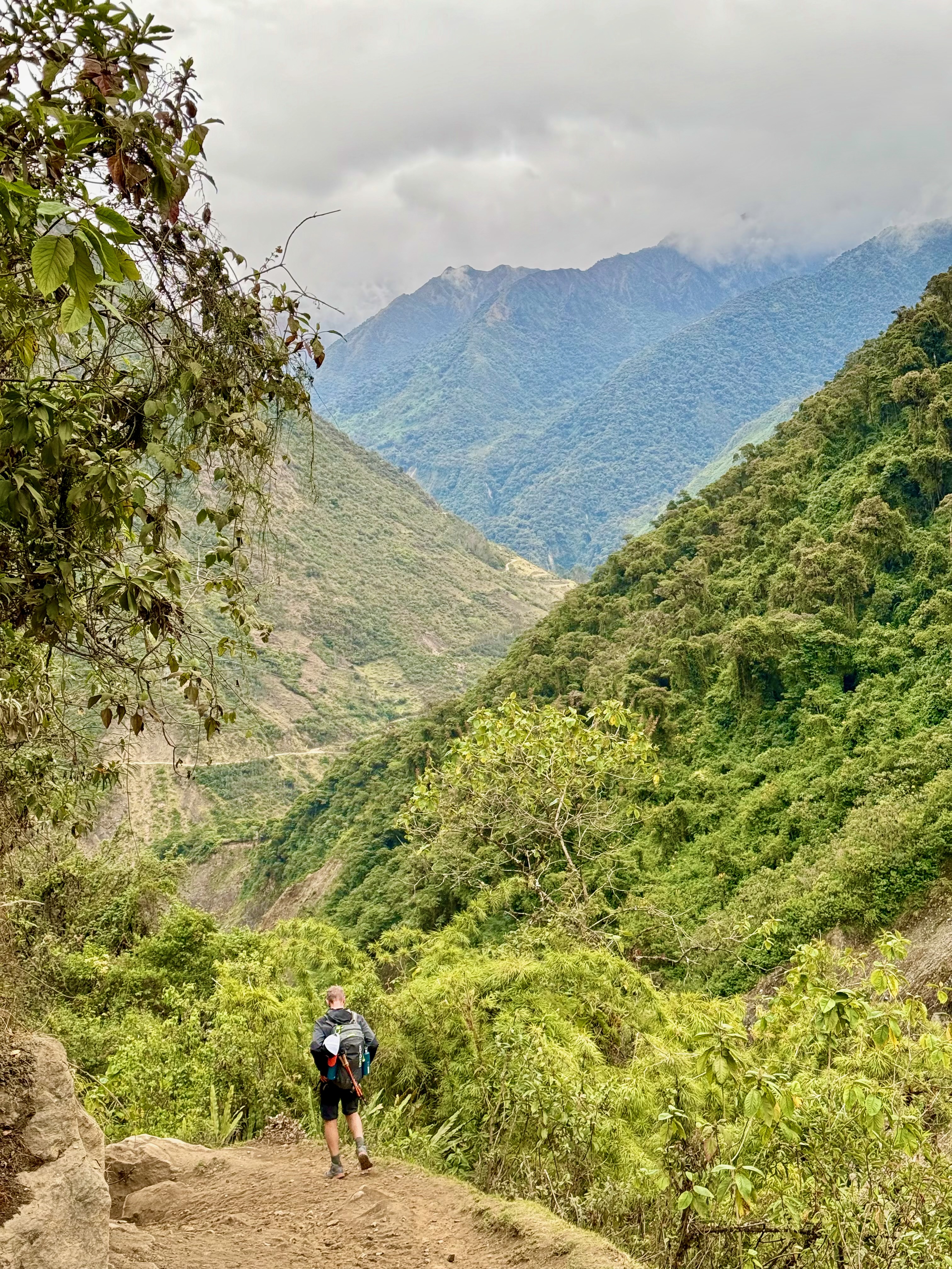 Départ à 8h, assez tard mais on avait une petite journée. Belle descente dans la forêt tropicale avec quelques vues sur les montagnes et le Machu Picchu. La descente est raide donc nous avons rapidement avalé les 1000m D-, tout seuls, plus de groupes.