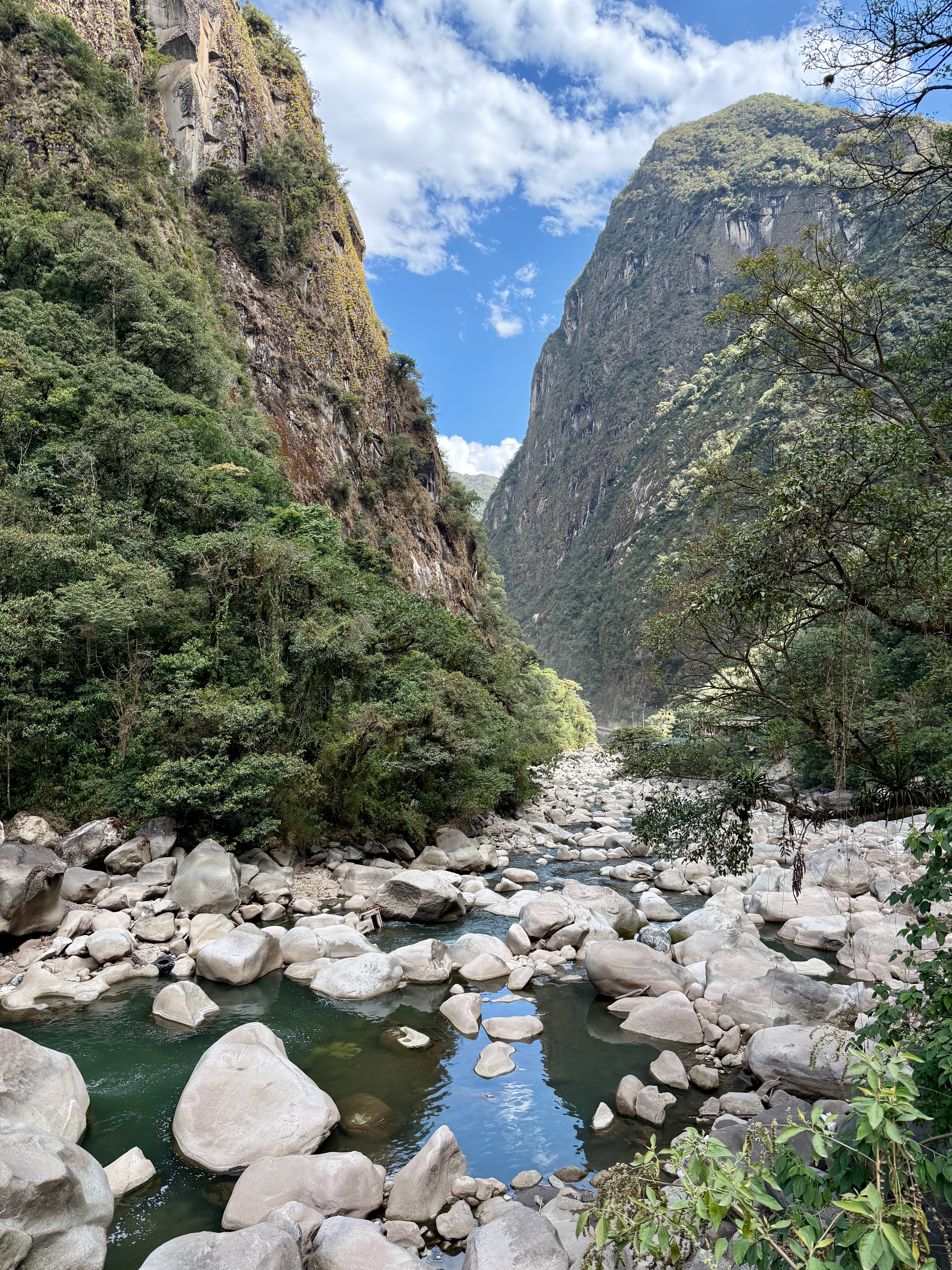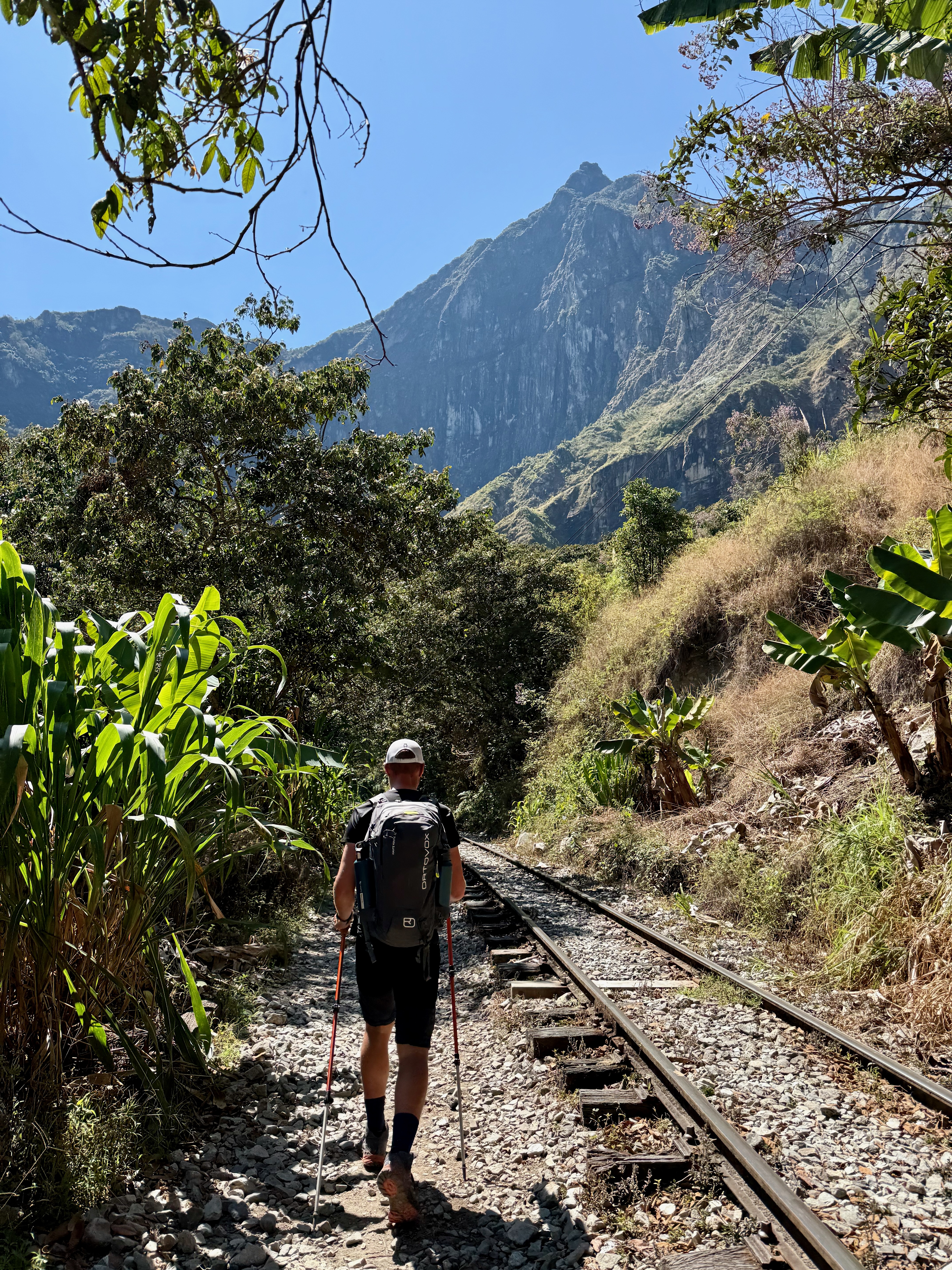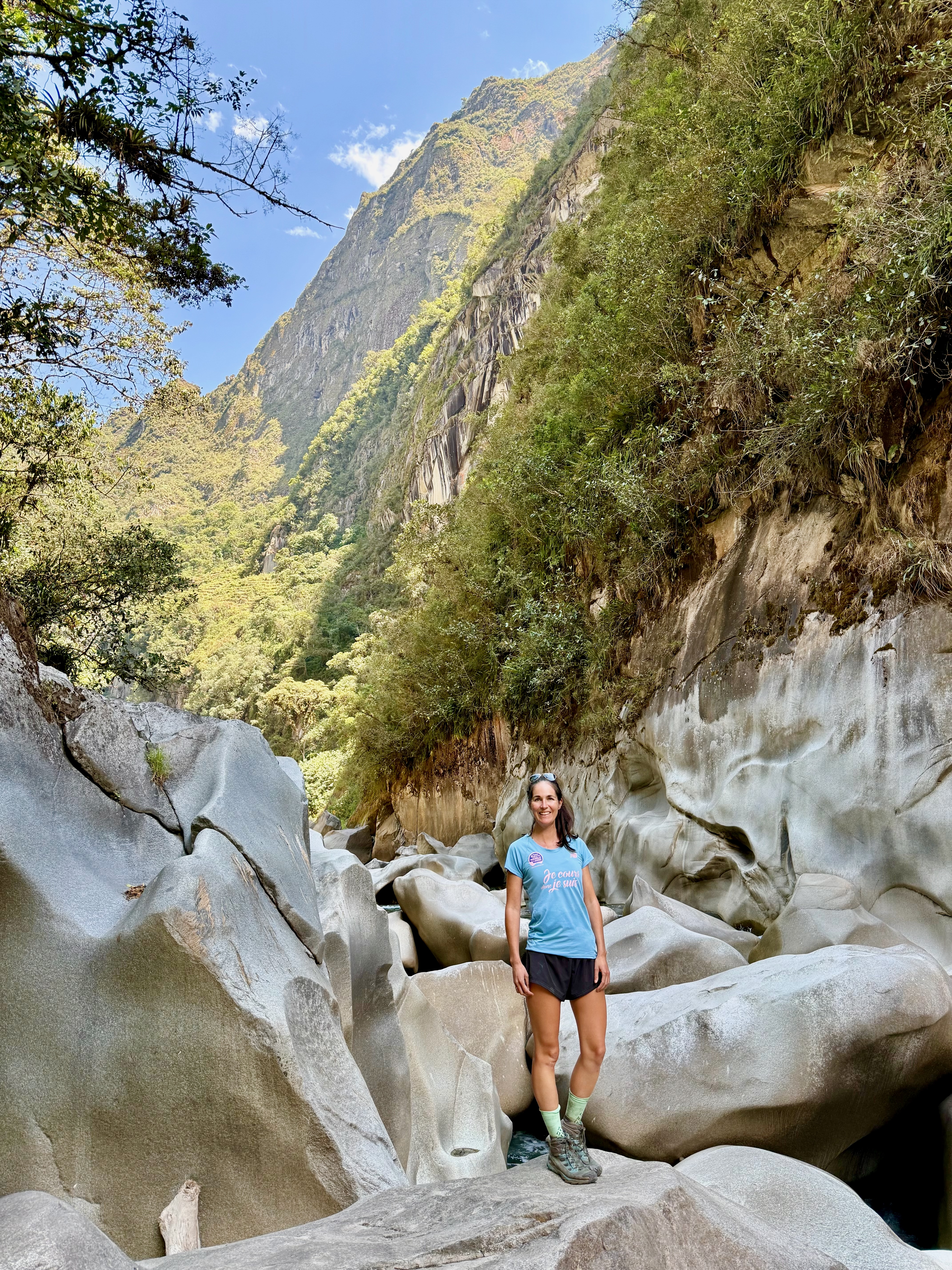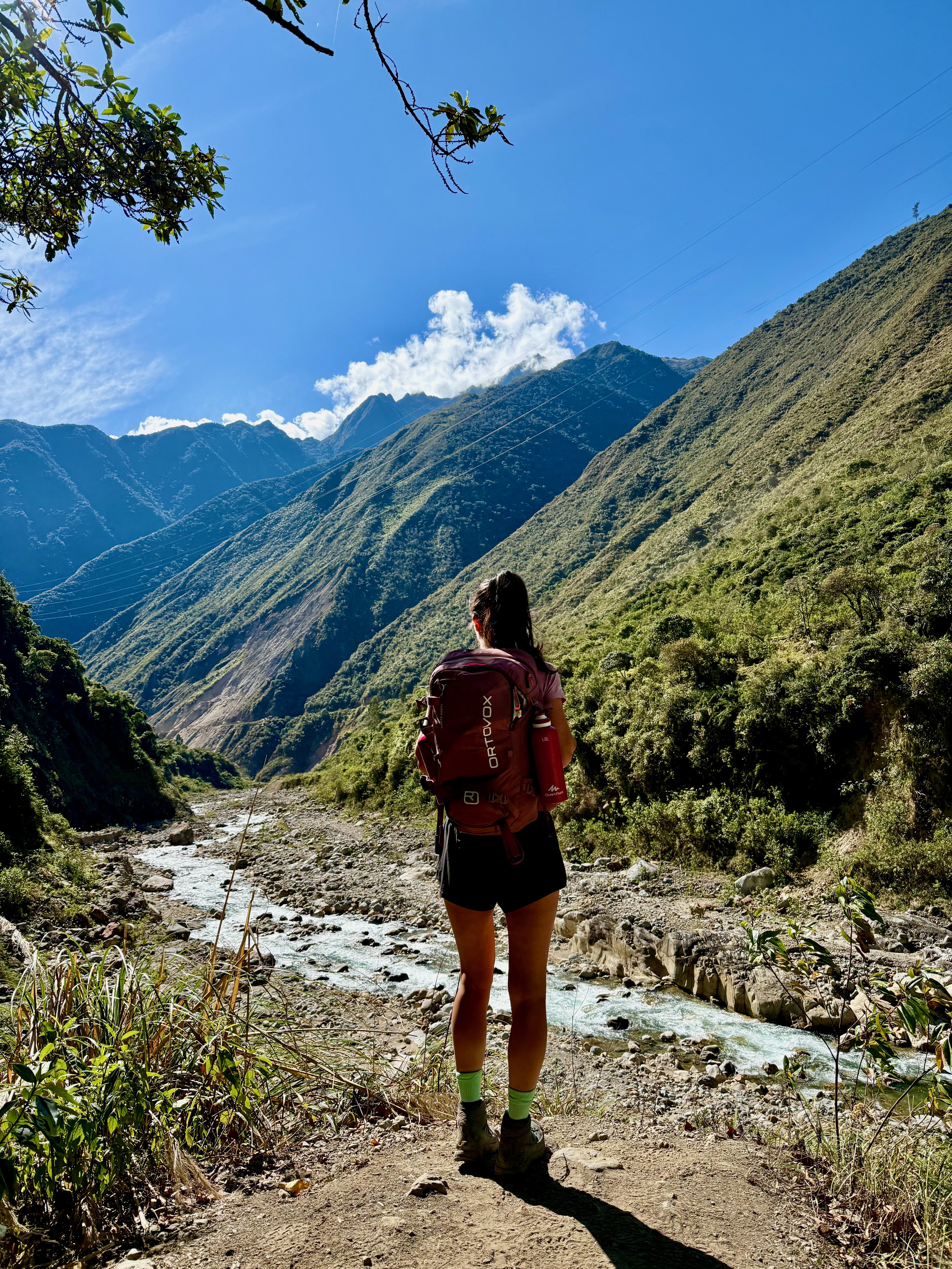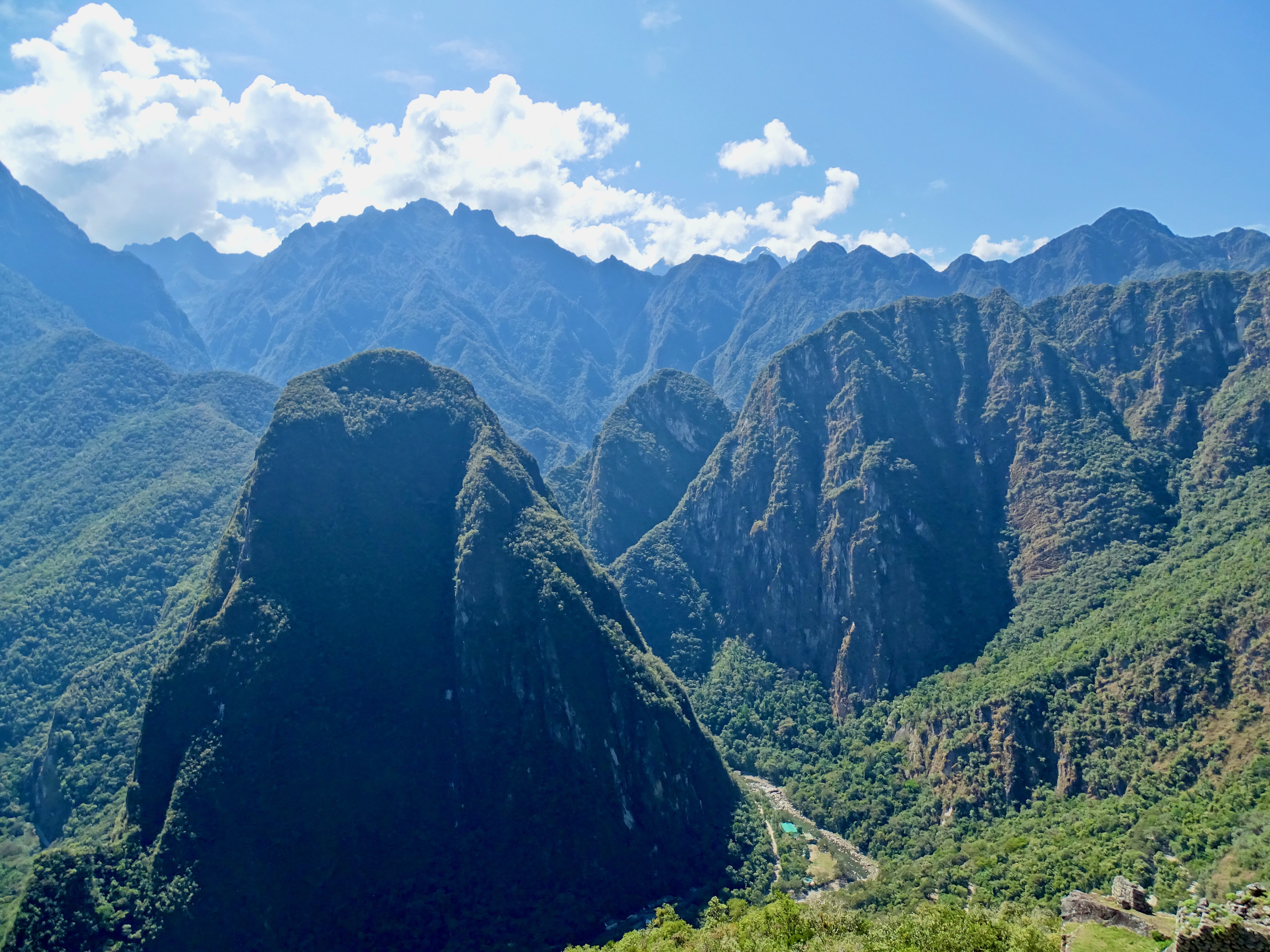 Départ à 8h, assez tard mais on avait une petite journée. Belle descente dans la forêt tropicale avec quelques vues sur les montagnes et le Machu Picchu. La descente est raide donc nous avons rapidement avalé les 1000m D-, tout seuls, plus de groupes.