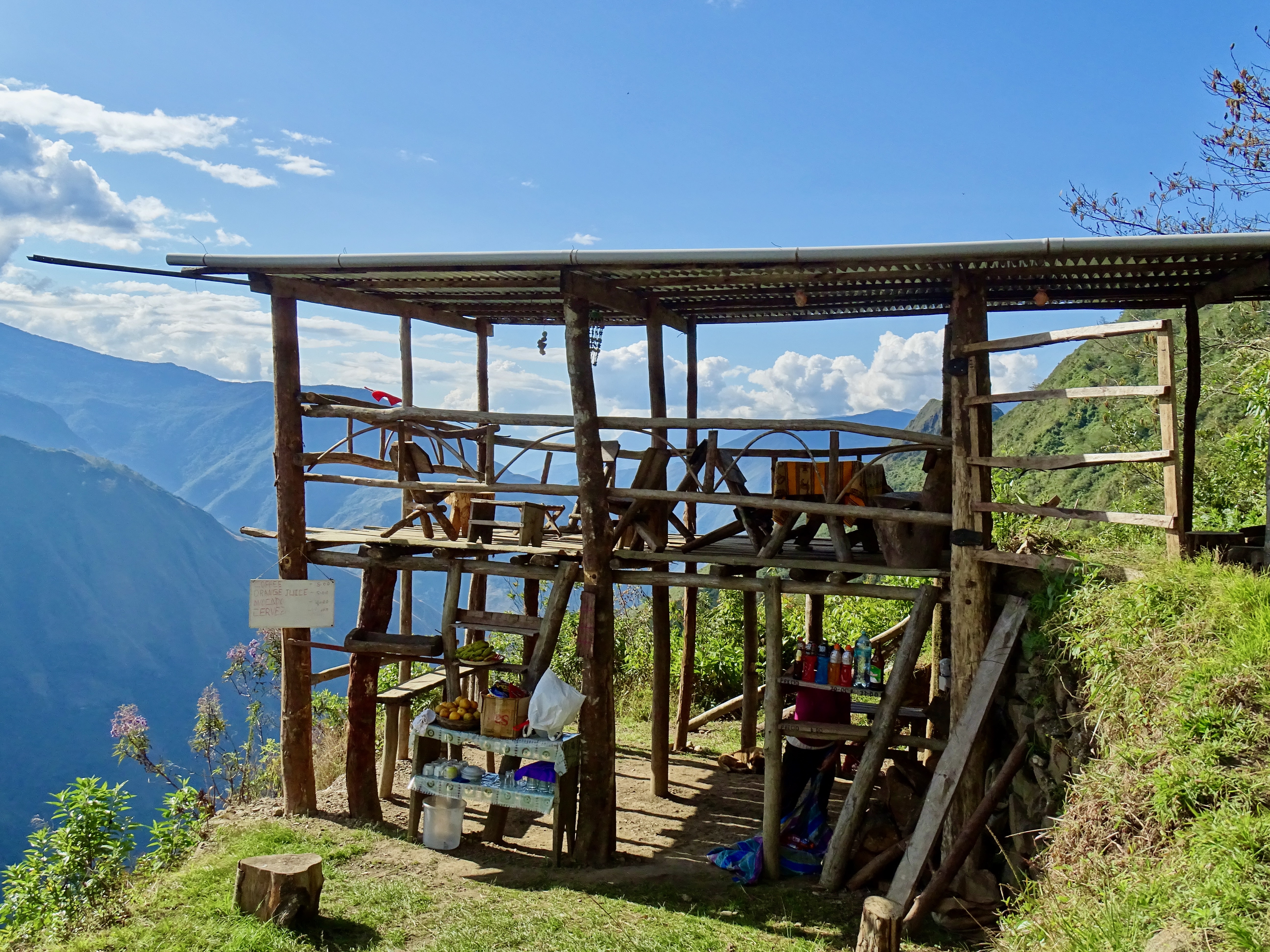 Vers 11h et plus de 13 km, petite pause avec jus maison (5 soles/personne) et snickers (8 soles/personne) et des chats qui venaient nous saluer.