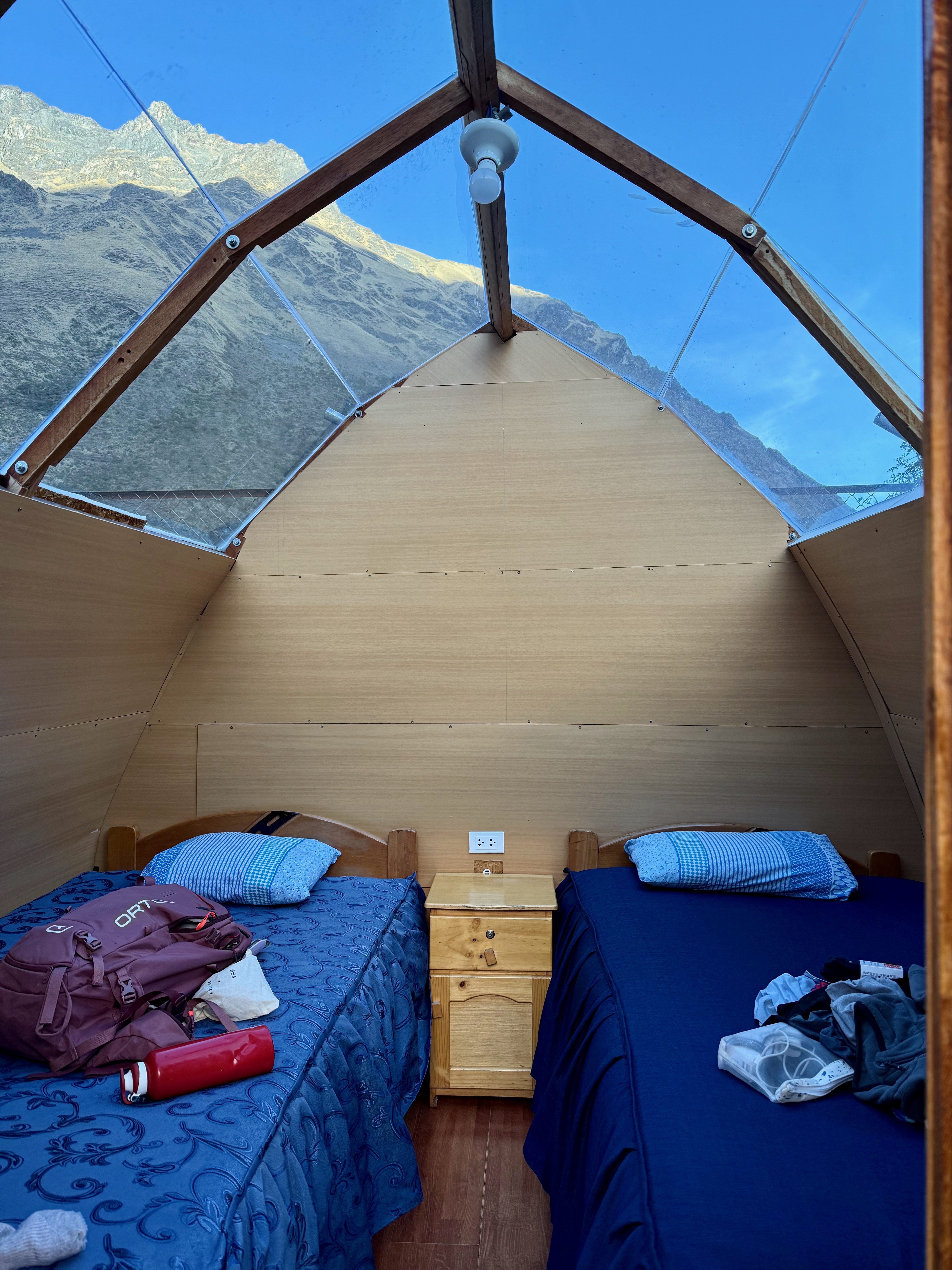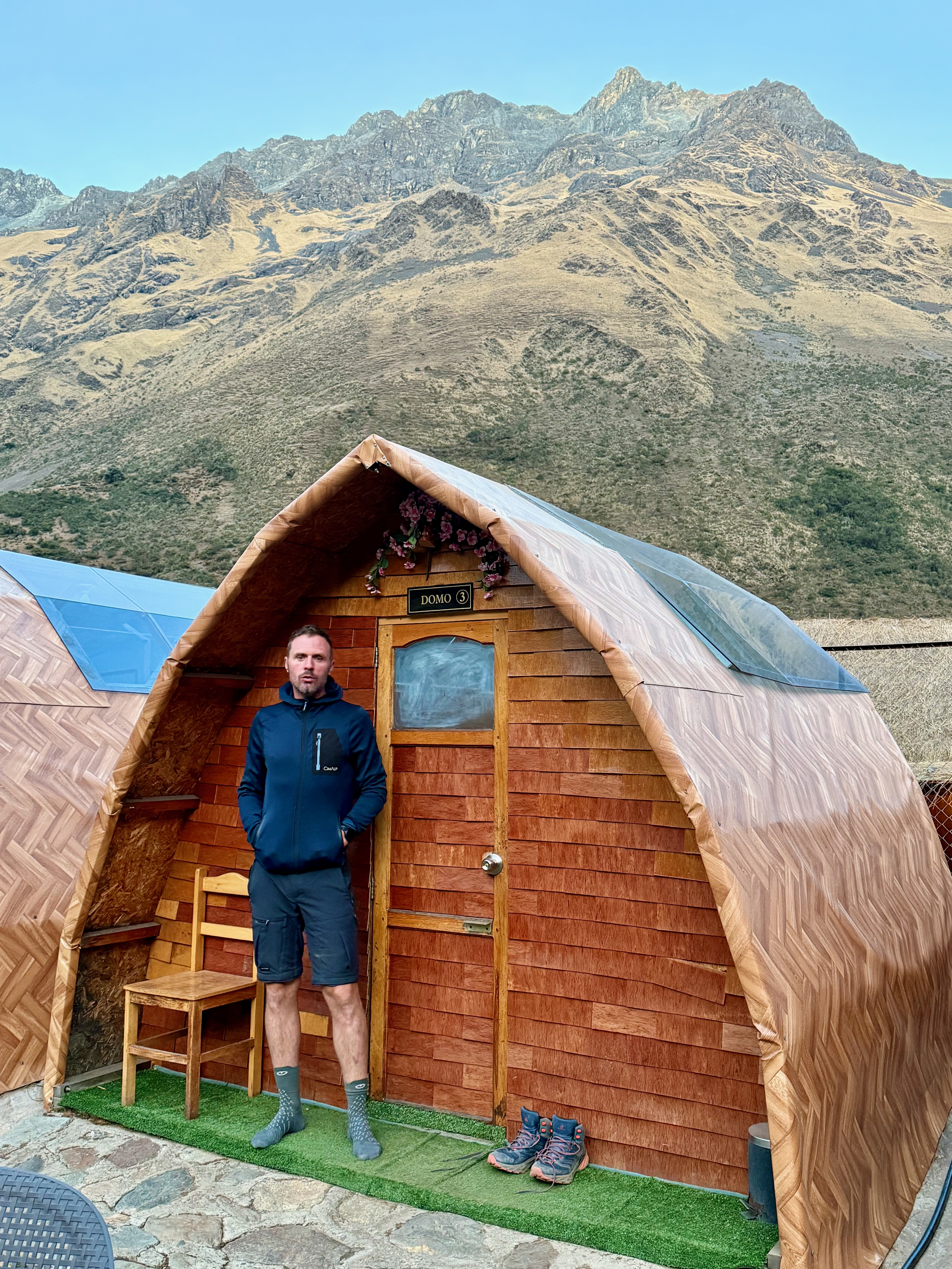 Le taxi nous a déposé à Soraypampa, à 10 mn à pied de notre logement Salkantay Hostel. Il était 14h30 et on a déposé nos affaires dans notre cabane, avec un toit transparent. Nous étions à 3900m ! A 14h45, on débutait la montée pour le lac.