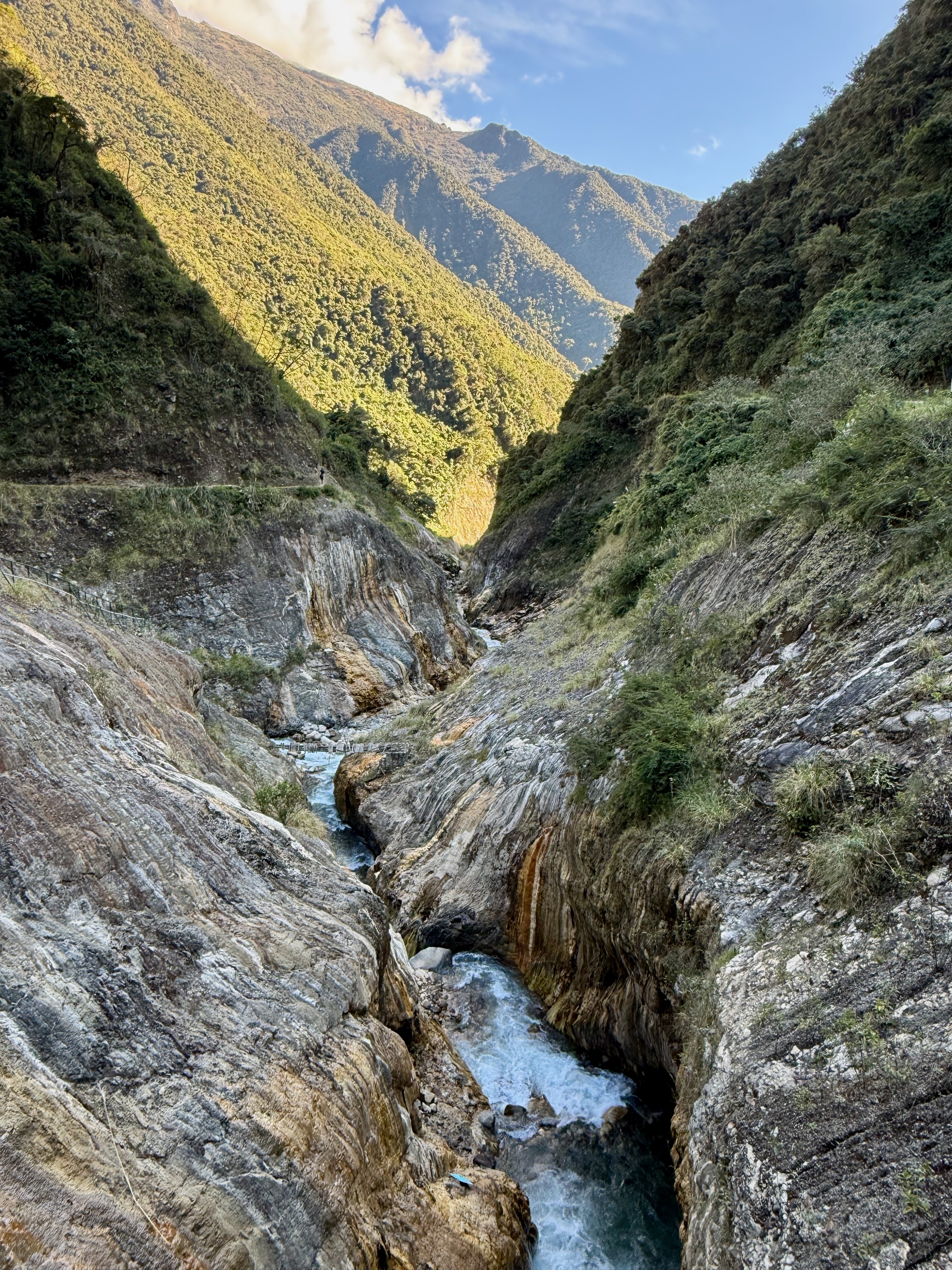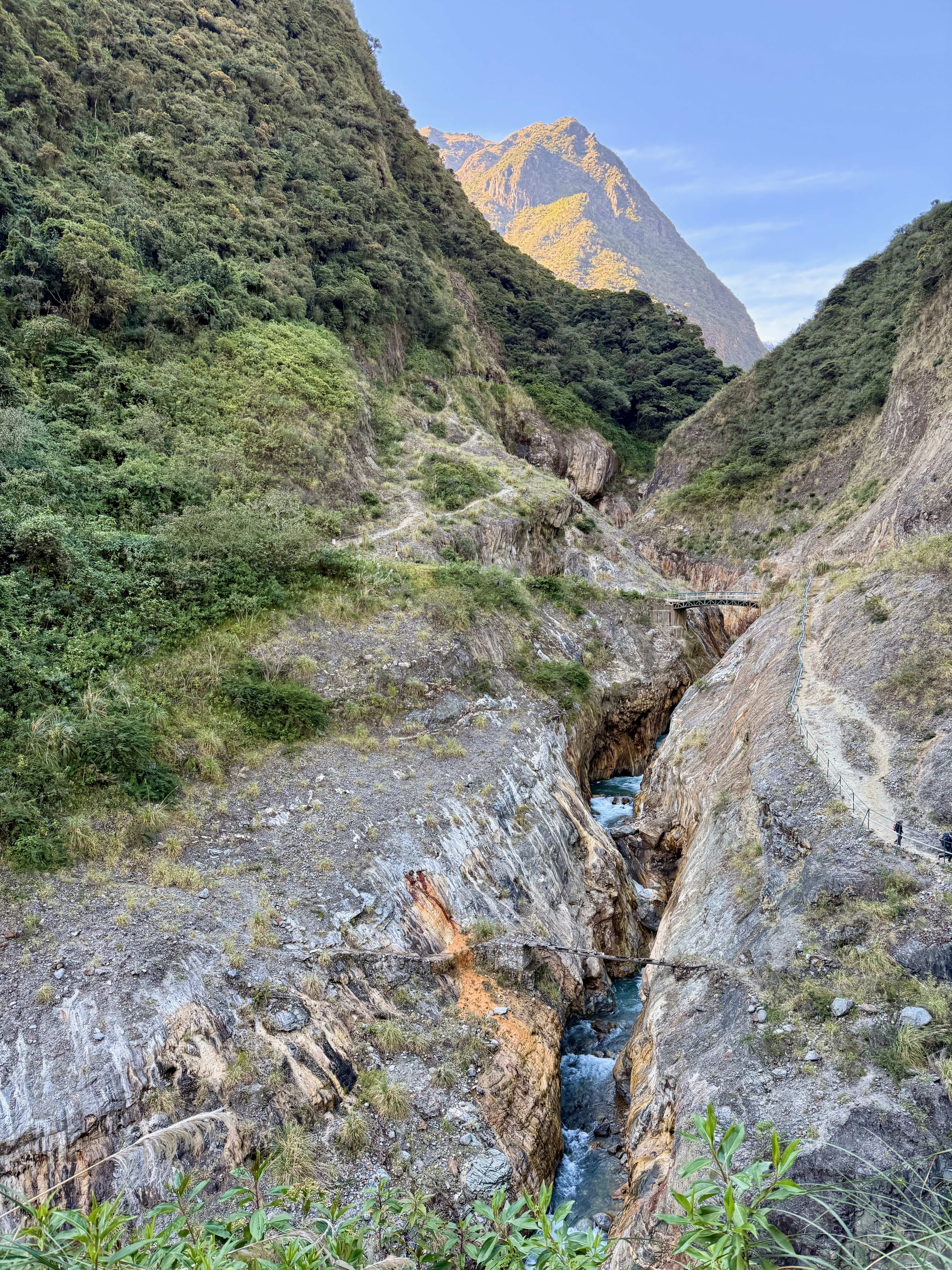 Départ à 7h30, pas un seul nuage, ça allait être une belle journée. Au départ, descente par une piste, on a doublé des groupes, puis, au niveau d’un pont et d’un canyon, il faut prendre à gauche avant le pont.