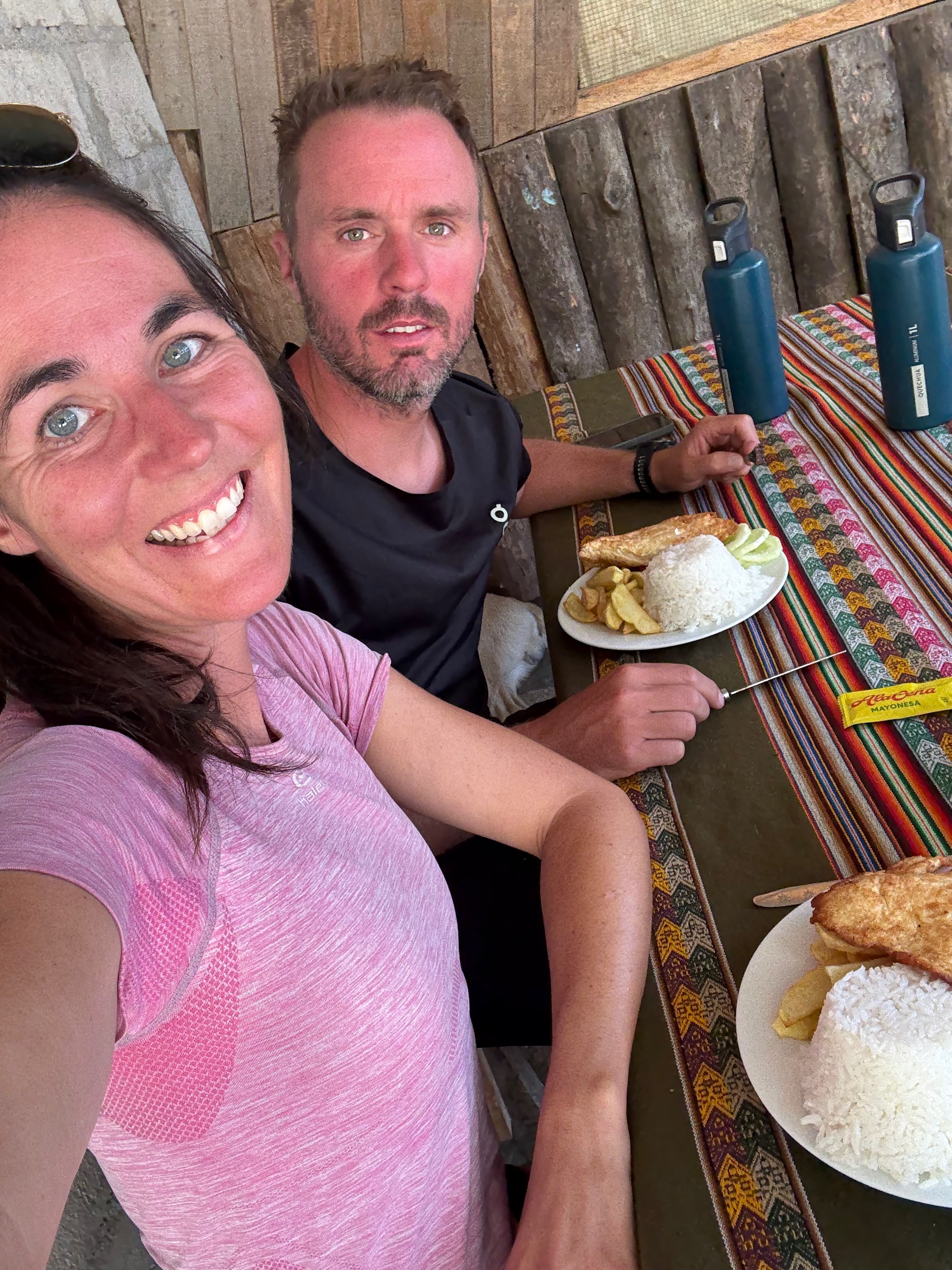 La descente progressive s’est faite jusqu’à Sahuayco, un village où il faisait super chaud. On a traversé un pont suspendu pour passer du côté droit de la rivière et nous avons recroisé les Alsaciens, rencontrés le 1er soir. On a déjeuner ensemble dans un boui-boui, très simple et efficace : poulet/riz/frites (2 féculents comme en Bolivie). La tenancière était très gentille (20 soles/personne).